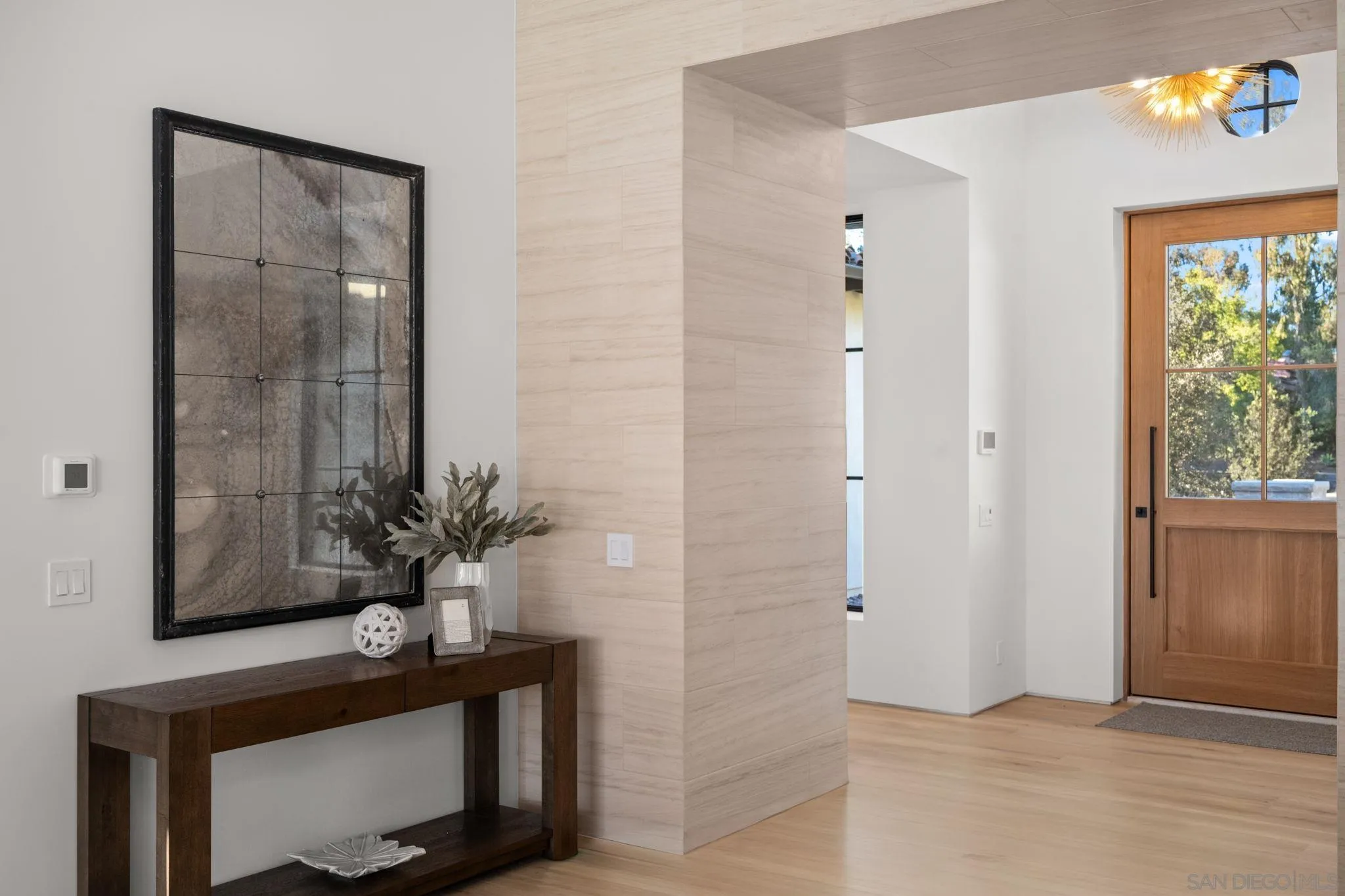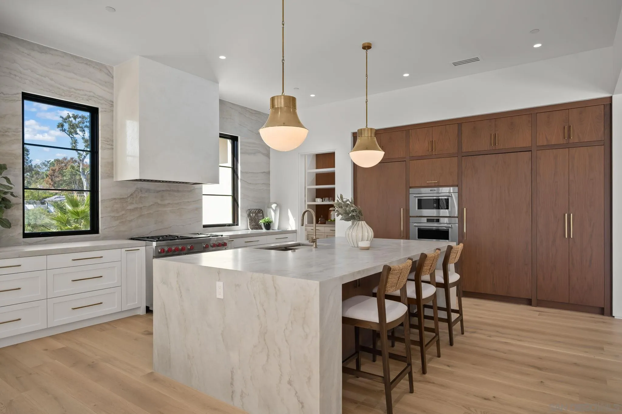 Brand-New, Custom Construction by master builder Greg Agee. 6323 Mimulus in Rancho Santa Fe Covenant will capture you immediately and is positioned on one of the most desirable streets. Set on a beautiful & usable lot with wide fairway views, direct access to the Covenant's 60 miles of walking/running trails with mature oak plus sycamore trees. Inside, European white oak floors and abundant natural light create a calm, refined atmosphere, while Sonos surround sound with invisible speakers add to the ambience. Custom detailing such as museum lighting with invisible trims in primary entrance spaces, accent lighting by top designers Kelly Wearstler and Aerin Lauder are displayed in the great room, kitchen, and bedroom suites. Fireside great room designed with dramatic wood beams open through expansive sliding doors to an outdoor living area complete with skylights, fireplace and flush mount ceiling heaters blending seamlessly with the wet-edge saltwater pool/spa, outdoor firepit and lush turf area designed for lounging overlooking the golf course. The designer kitchen offeres a wall of sleek walnut cabinetry, slab poplar white Quartzite, Subzero refrigerator, Wolf appliances including steamer & 48" full gas range plus back kitchen/pantry. The sumptuous primary suite offers a tranquil retreat with Steam shower with skylight, Infrared Sauna, custom LED mirrors, and a private patio with hook up for Cold Plunge. Additional amenities include 4K home Movie Theater, game room with wet bar, gym, owned Solar, Race fuber internet, 4-car and private motor gated entry.