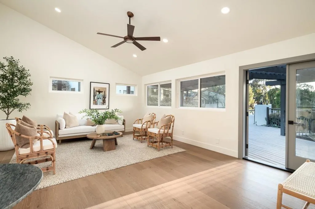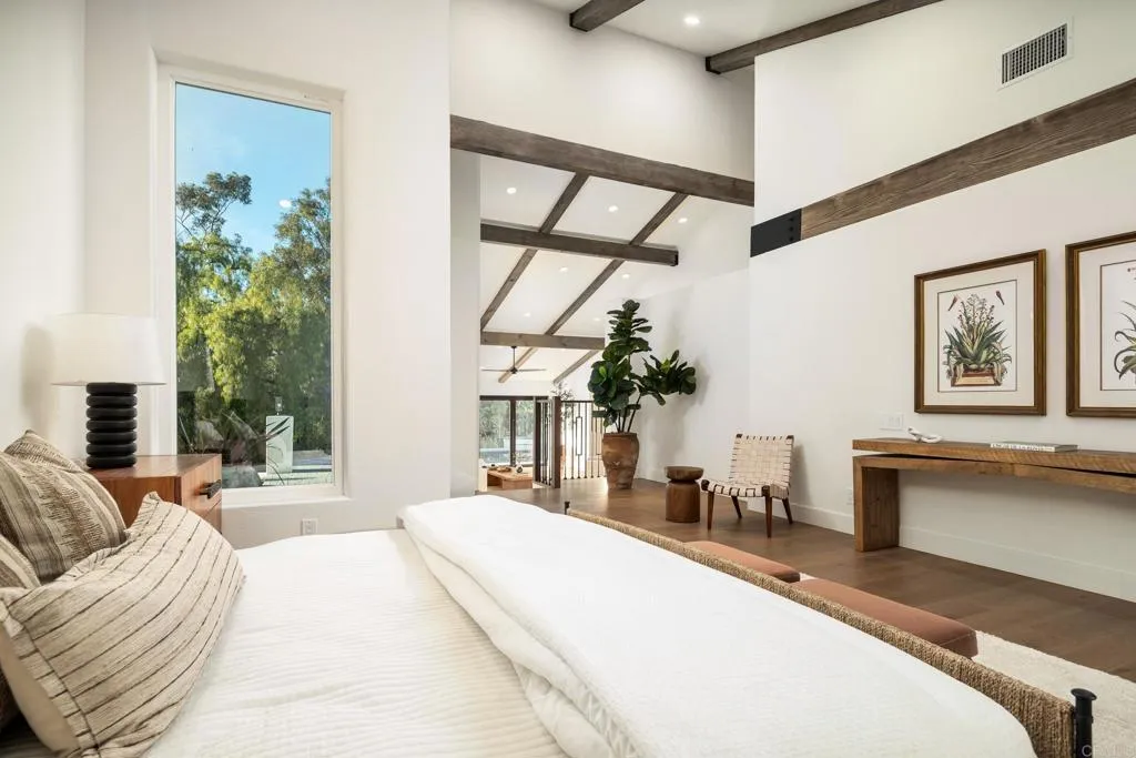 Positioned in the heart of Rancho Santa Fes historic Covenant, 6449 Las Colinas stands as a refined Spanish Modern estatewhere timeless architecture is reimagined for todays lifestyle. Recently renovated from the main residence to the guest house, every space showcases a balance of classic design and contemporary sophistication. A circular drive introduces the home with a graceful arrival, highlighting smooth white stucco walls, espresso-framed windows, and mature landscaping. Inside, natural light pours through expansive windows and sliding doors, accentuating European oak floors, custom cabinetry, and open-beamed ceilings that lend warmth and character. The chefs kitchen is the centerpiece, appointed with Wolf and Sub-Zero appliances, an oversized island, and effortless connection to the dining and living spacesideal for both entertaining and day-to-day living. Multiple fireplaces, curated finishes, and seamless indoor-outdoor flow elevate the atmosphere throughout. Resort-style amenities define the grounds, with a private pool, full-size tennis court, and a detached guest house offering luxurious accommodations for visitors or extended stays. Every element has been thoughtfully designed to maximize comfort, privacy, and connection to the outdoors. The primary suite is a private retreat with vaulted ceilings, spa-inspired bath, and direct access to the backyard sanctuary. Designer lighting, high-end fixtures, and a versatile floor plan complete the homes elevated living experience. As part of The Covenant, residents enjoy direct access to miles of equestrian trails, the R