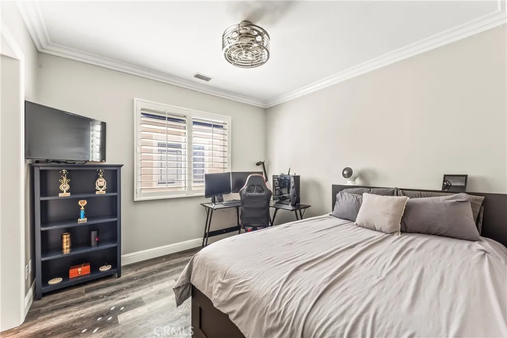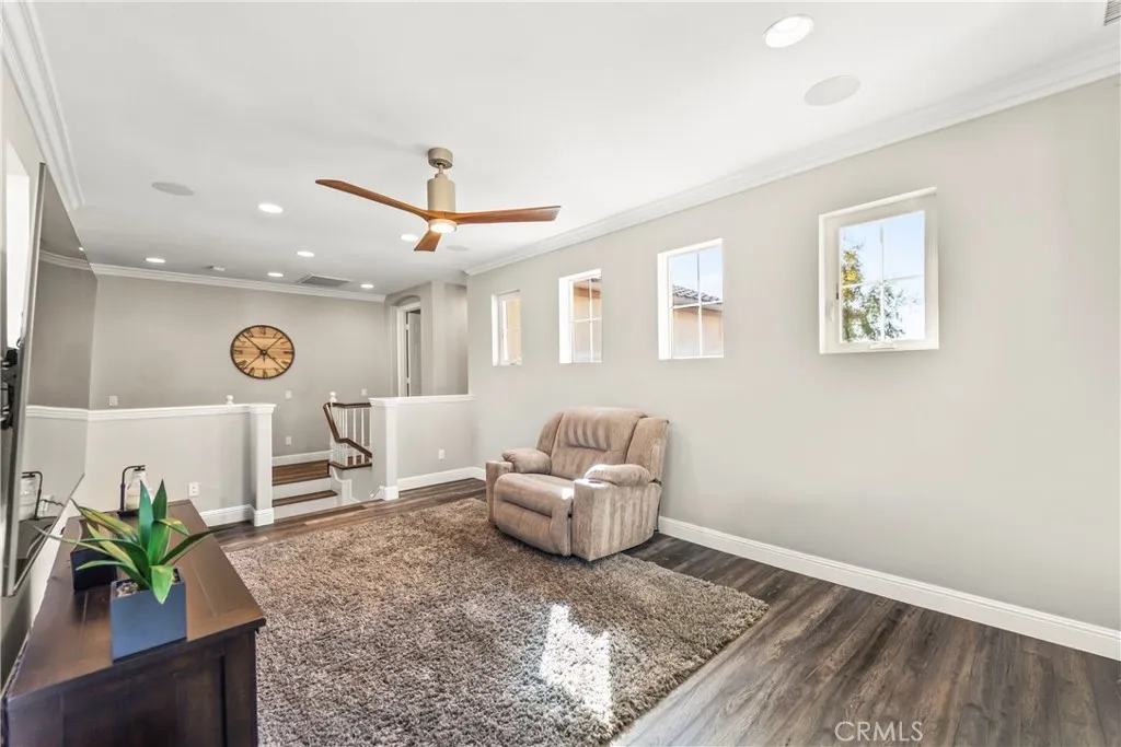 Beautiful and spacious two-story home with a bright open floor plan. Beyond the rustic double door entry, this plan features dual staircase, 4 bedrooms and 3 full baths. French doors off the dining room, open up to an inviting atrium, with a fountain. A spacious family room with built-in entertainment wall unit and gas fireplace, connect to create a Great Room for entertaining. The main level bedroom is the 4th bedroom, with a nearby full bath. Upstairs, a loft was built over the dining rooms coffered ceiling, ideal for a media room, teen hangout, or lounge. Both loft and family room are equipped with surround sound speakers in each room. Two secondary bedrooms share a Jack and Jill bath. The large primary suite offers a walk-in closet and en suite bath with dual vanities, soaking tub, and separate shower. Currently, the tandem 3rd car garage, is being used as a gym however, can be used for parking and or even converted into additional bedroom. A view lot backyard includes a built-in barbecue, outdoor gas fireplace, and seating area with beautiful sunset views. This backyard view is visible from the kitchen, family room, loft, and primary bedroom. The driveway of this home was widened to accommodate larger vehicles. Close to Tesoro High School, Las Flores elementary and middle school as well as shopping and the freeways.