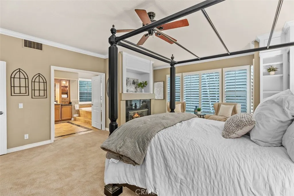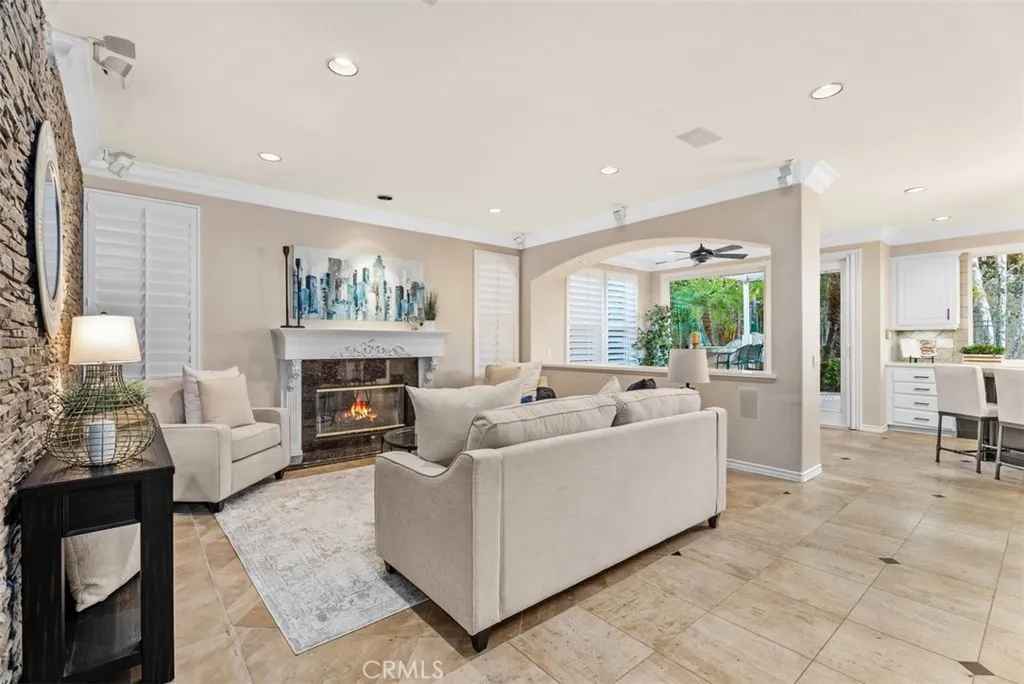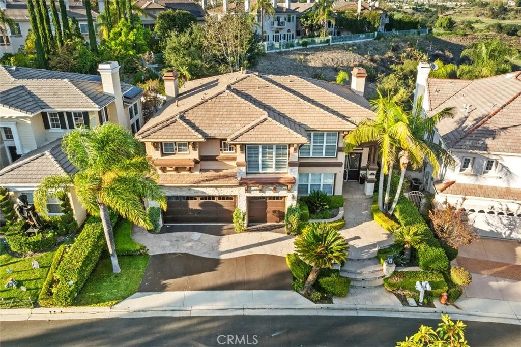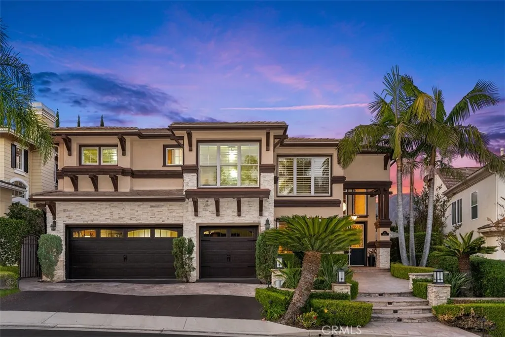 Discover unparalleled luxury at 6 Barneburg, a stunning 5-bedroom, 4.5-bathroom pool and spa home within the prestigious gated community of Dove Canyon. Boasting breathtaking panoramic views and an open floor plan, this thoughtfully designed home is a must-see. Upon entry, you are greeted by a spacious formal living and dining room, accentuated by soaring ceilings and expansive windows. The upgraded gourmet kitchen, a culinary enthusiast's dream, boasts quartz countertops, a large center island with seating, a double oven, and a walk-in pantry, seamlessly flowing into the breakfast nook and a separate family room complete with a wet bar and fireplace. A convenient main floor bedroom with a private full bath provides added flexibility. Ascending to the second level, the oversized primary bedroom presents a luxurious retreat, featuring a fireplace and a private walk-out deck to savor the sweeping views. The primary bathroom is appointed with dual vanities, a jetted tub, and a separate shower, ensuring a spa-like experience. This level also offers a spacious bonus room or loft, perfect for recreation or relaxation. Two secondary bedrooms are connected by a convenient Jack-and-Jill bathroom with dual sinks, while a fourth upstairs bedroom provides additional accommodation. The meticulously landscaped backyard serves as an entertainer's paradise, showcasing a sparkling pool and spa with a tranquil waterfall, a built-in barbecue, and an outdoor fireplace, all set against a scenic backdrop. Enhanced by casement windows, crown molding, and newer carpet, this residence exudes refine