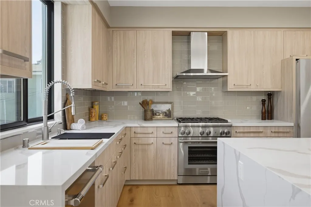 Brand-New Construction in Prime North Redondo Beach! - Tucked away in one of North Redondos most sought-after neighborhoods, this stunning rear-unit townhouse combines modern luxury with effortless coastal living. Designed to maximize natural light, the home features a bright, open layout and elegant finishes throughout. A highlight of the property is the spacious mezzanine level with its own balconyperfect as a media lounge, home office, or play area, offering flexibility for any lifestyle. The inviting living area centers around a sleek gas fireplace and is enhanced by wide-plank white oak hardwood flooring, solid-core doors, and recessed LED lighting. The gourmet kitchen is a showpiece, featuring an oversized island with quartz countertops, a stylish tiled backsplash with hidden outlets, and high-end cabinetry with soft-close metal drawers. Top-of-the-line Thermador stainless steel appliancesincluding a gas range, French door refrigerator, dishwasher, and microwave drawercomplete this impressive space. Each bathroom is thoughtfully designed with custom mirrors, contemporary lighting, and Hansgrohe fixtures. The home also includes a dedicated laundry room with a sink and side-by-side hookups, providing everyday convenience. Comfort is guaranteed with central air conditioning, forced-air heating, and a tankless water heater for energy efficiency. Additional features include Andersen windows, solar panels, and a two-car garage with a wooden door. The smart home system offers peace of mind with motion sensors, exterior cameras, a video doorbell, and remote control for lighti