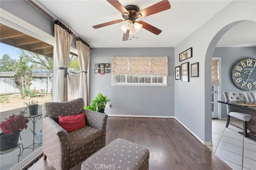 Welcome to 5230 Old Mill Rd, Riverside a charming single story home nestled in a quiet, tree lined neighborhood with inviting curb appeal and mature landscaping. Inside, youll find a light filled layout featuring rich wood style flooring, fresh neutral paint and a cozy living room with a painted brick fireplace. The kitchen offers white cabinetry, tile countertops, ample storage, recessed lighting and a window over the sink, flowing into a dedicated dining area. Bedrooms are spacious with wood flooring and ceiling fans, while the bathroom showcases custom tile and a unique vanity for added character. Additional highlights include dual pane windows, central HVAC, indoor laundry and built-in storage. The backyard offers multiple patio areas, a large open yard and a detached garage with potential for ADU or flexible use. Conveniently located near shopping, dining, parks, schools and with easy 91 freeway access. This home blends comfort, charm and opportunity.