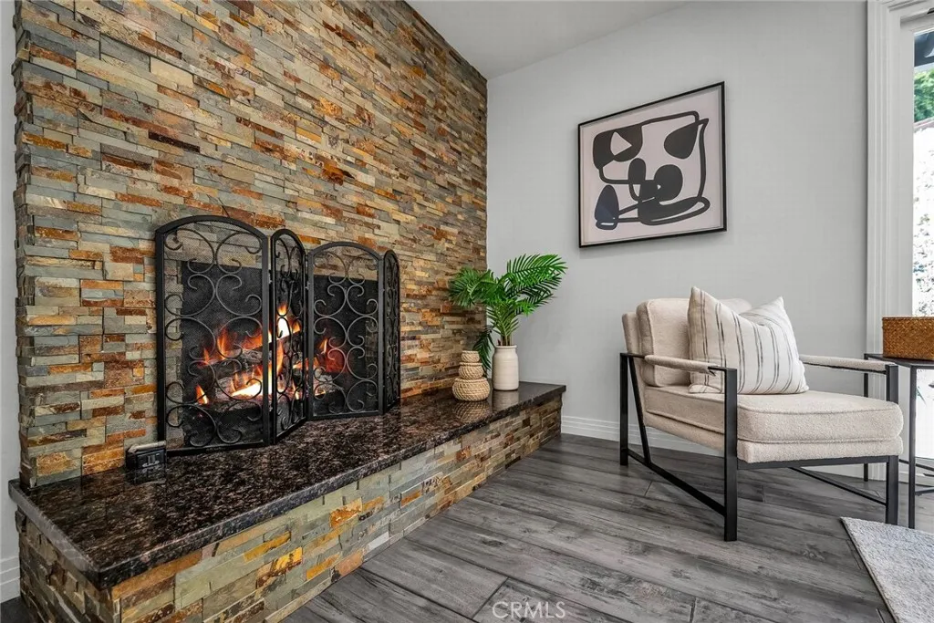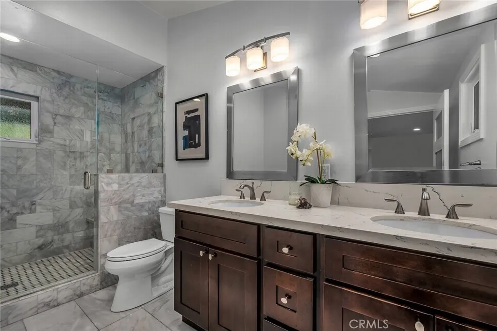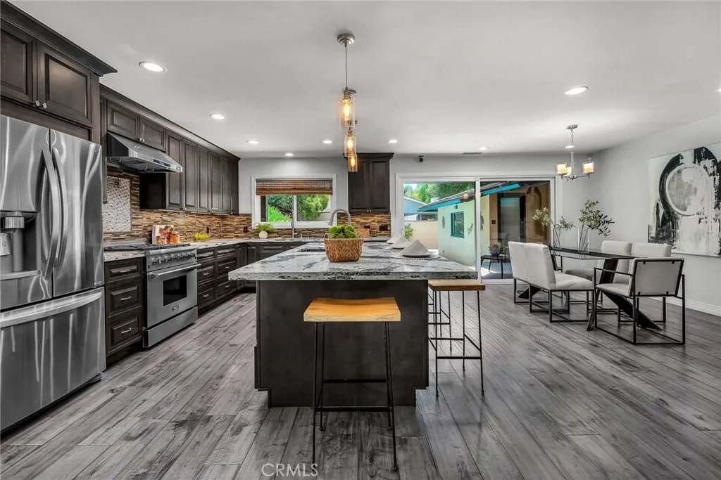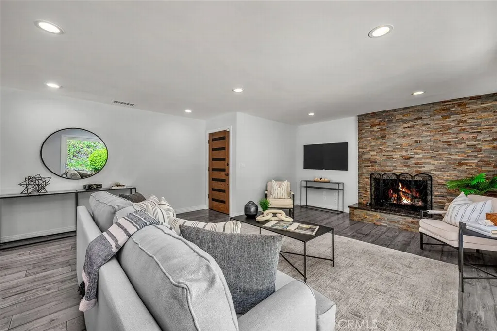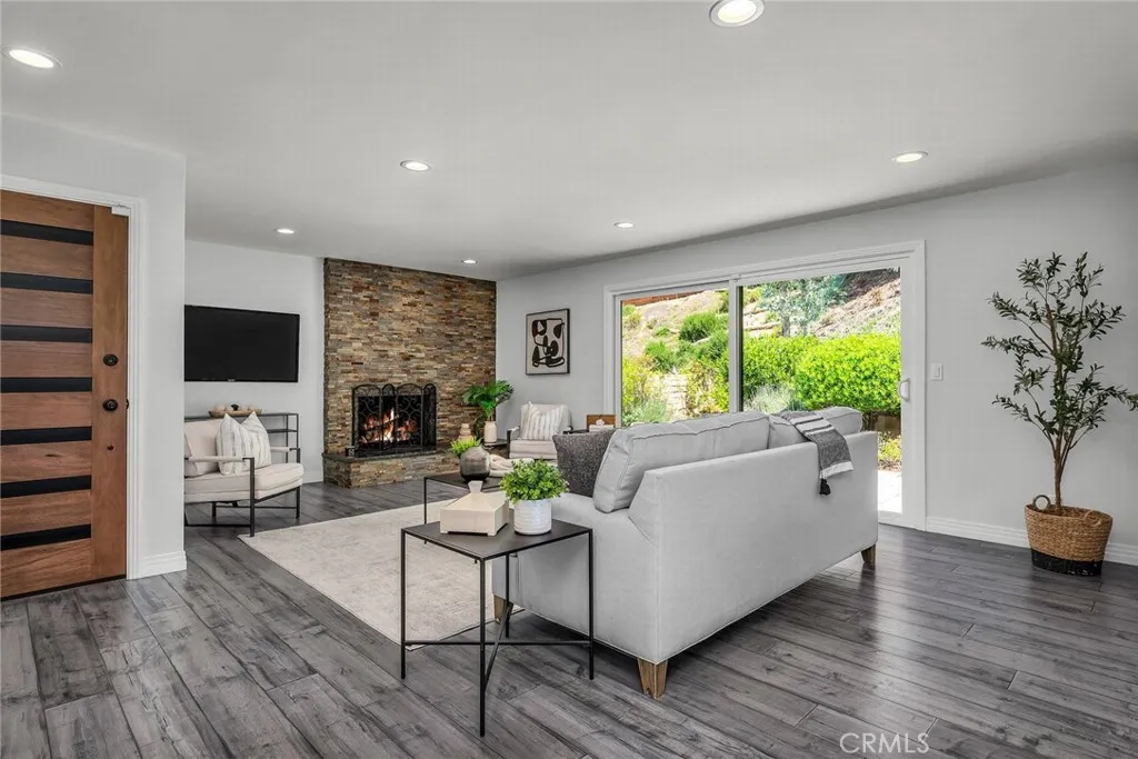 Lovely remodeled Montecillo single level, 3 bedroom, 3 bath pool & spa home on estate size .41 acre lot. The open floorplan offers seamless blend of indoor-outdoor comfort, privacy & functionality. Welcoming covered front entry opens to warm & inviting living room with stone facade gas fireplace, spacious dining area & chefs delight kitchen. Large center island with breakfast counter, quartz & tile finishes, 2 stainless steel sinks & disposals, undercounter lighting & stainless steel appliances including refrigerator, 36 6-burner gas range, hood, wine cooler, microwave oven & dishwasher. Hardwood floors, dual pane windows & obscure glass panel doors throughout. The primary suite has walk-in & mirrored wardrobe closets & beautifully finished quartz & tile bath with dual sinks, separate large shower & soaking tub. Additional bedrooms have mirrored wardrobe closets & Plantation shutters & baths have attractive stone & tile finishes. Convenient inside laundry room with washer & dryer & pull-down stairs in hallway for extra attic storage. The property was extensively remodeled throughout 2016+, including sewer & gas lines, ABS waste & copper plumbing, HVAC system (furnace, condenser, ductwork & Nest thermostat), tankless water heater, upgraded panel & electric service, recessed LED lighting, wired for sound at pool patio, pool replumbed, pool heater, pebble decking around pool with drains, irrigation system & landscaping. Newer light-weight tile roof, engineered concrete drainage at the top of rear hillside, water softener, security & multiple smart systems plus heavy-duty shelv