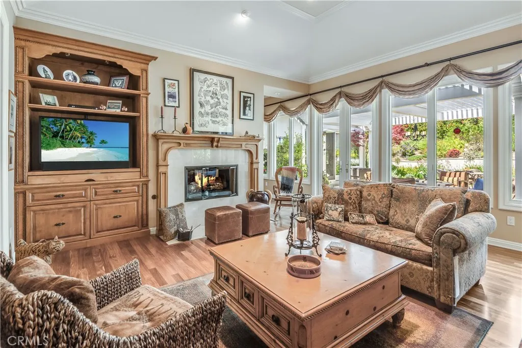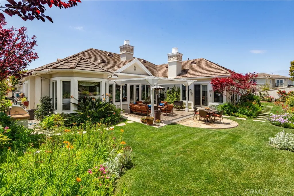 RARE OPPORTUNITY! First time on market in 25 years, beautifully maintained with pride of ownership from the original owner! Your chance to own and enjoy this single-level luxury turn-key residence nestled in the prestigious guard-gated community of Vantage Pointe. This exquisite property, one of only 67 homes in the development, offers 4 bedrooms and 3 baths in 3,334 square feet of living space on a 16,962 sq ft oversized flat lot, located on a quiet cul de sac. Upon entering, you'll be greeted by an inviting open floor plan with high ceilings throughout. Straight ahead is the spacious living room featuring elegant custom coffered ceilings, hardwood floors, a fireplace, and large windows that fill the space with natural light, creating a warm and welcoming atmosphere. Off the living room is a sitting room, with the same hardwood floors, and shares the back side of the fireplace. French doors from the living room open to a back patio with a recently-built pergola with portable fire pit, a built-in BBQ, lawn area and beautifully manicured garden, and a tranquil fountain perfect for outdoor entertaining. From the entry foyer, to the left, after passing the guest powder room near the entry, are the private living quarters featuring three well-appointed bedrooms, including an optional office, and a secluded luxurious master suite. Two of the bedrooms share a Jack-and-Jill bathroom for added convenience. The primary suite is secluded, while taking advantage of the beautiful backyard, and features two giant walk-in closets, access to the back patio, a fireplace, and an en-suite