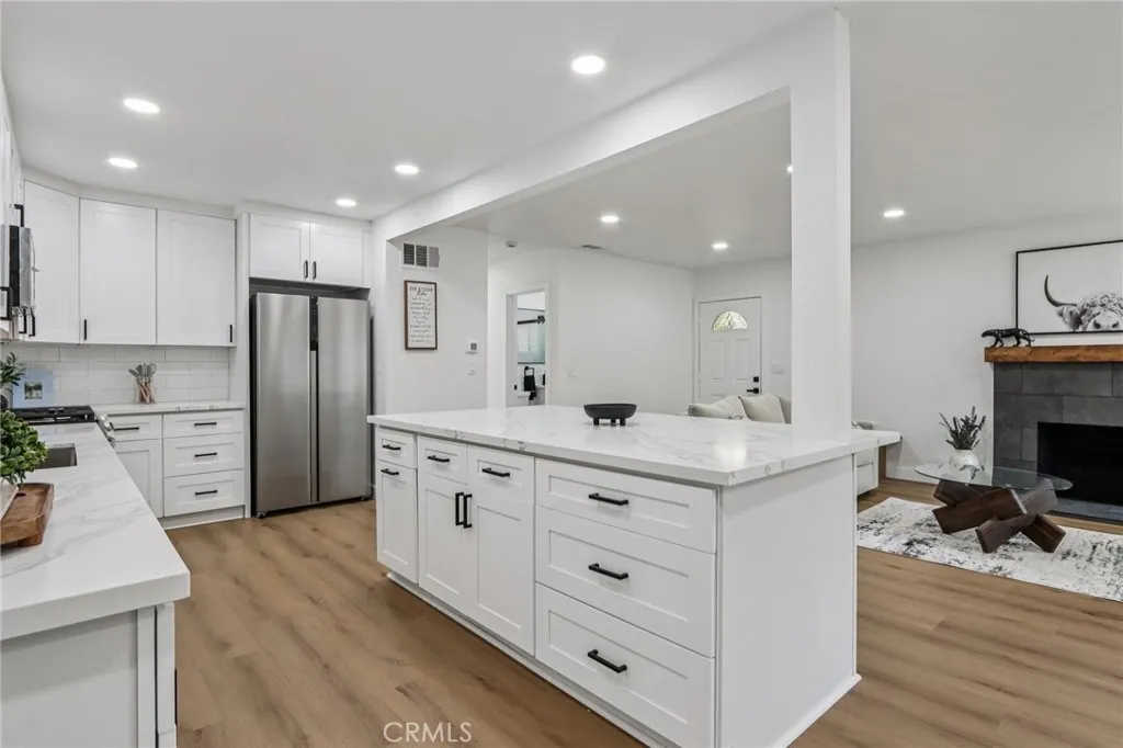 Beautifully Remodeled Single-Level Home! Step inside this completely renovated residence featuring fresh interior and exterior paint, new vinyl wood flooring throughout, and an inviting open-concept layout. The upgraded kitchen showcases crisp white cabinetry, quartz countertops, a large center island, and stainless steel appliancesperfect for entertaining. The home offers both a spacious living room and a cozy family room, each with its own stunning fireplace. The primary suite includes a remodeled ensuite bathroom, while three additional bedrooms are served by two beautifully updated bathrooms. Enjoy outdoor living in the expansive backyard with a concrete patio and lush lawn area. Additional highlights include a two-car attached garage and a convenient location close to parks, schools, shopping, and major commuter routes.