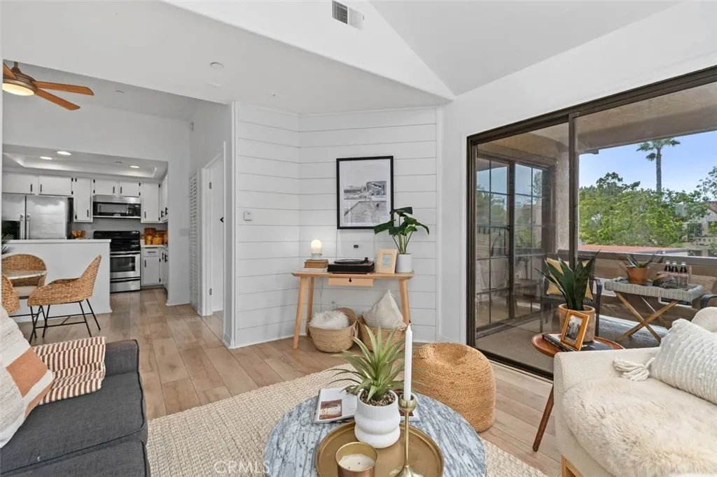 Tucked within one of the most serene and sought-after enclaves of Vista Pacifica, this beautifully re-piped condo offers effortless coastal living in a prime upstairs corner location. This unique one-bedroom plus finished attic/loft lives larger than expected, with soaring ceilings and an abundance of windows that fill the home with soft natural light, creating an airy, uplifting ambiance from the moment you arrive. Freshly painted, the living space blends comfort and style with a charming shiplap accent wall and seamless flow into the dining area, complete with a modern ceiling fan. The kitchen is both functional and inviting featuring recessed lighting, stainless steel appliances, a gas range and clean finishes that elevate everyday living. Through double doors, the spacious primary suite feels like a private retreat, with impressive ceiling height and multiple windows enhancing the open feel. The en-suite full bathroom offers comfort and convenience, while the oversized walk-in closet is thoughtfully designed with custom organizers and its own window for even more natural light. Home also has a finished attic/loft. Step outside onto your private patio from either the living room or primary suite and enjoy the gentle ocean breeze drifting through the trees. The peaceful setting, surrounded by lush landscaping and the soft sound of nearby waterfalls, offers a daily sense of escapejust moments from one of the communitys two resort-style pools and spas. Additional highlights include an in-unit stackable washer and dryer, a nearby one-car garage, ample guest parking, RV parki