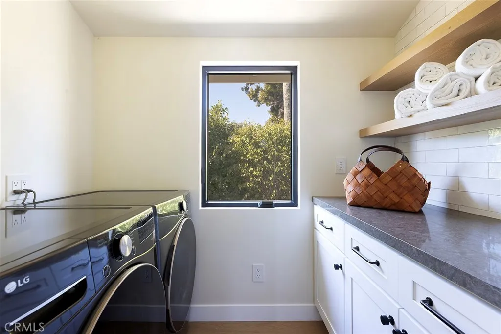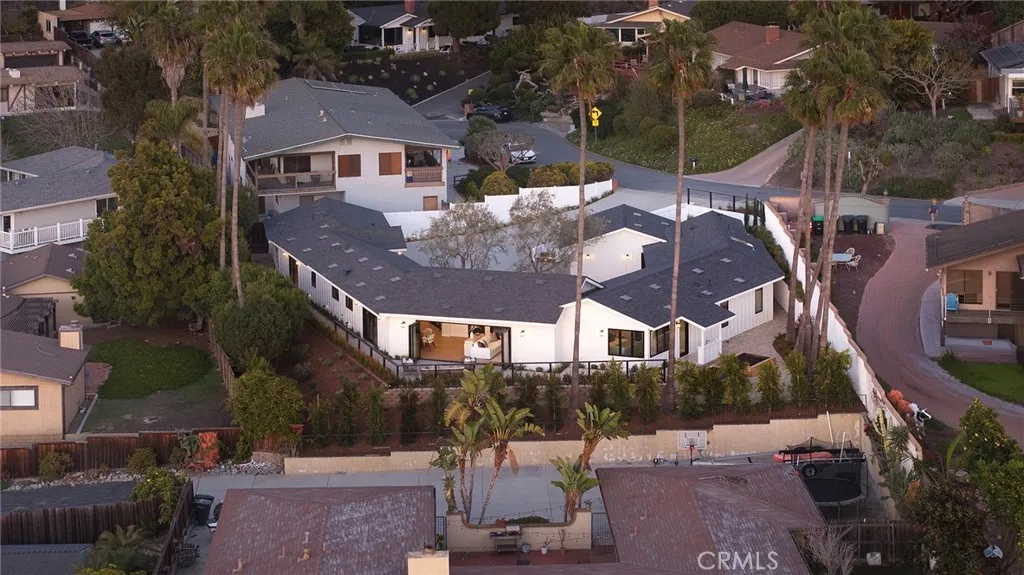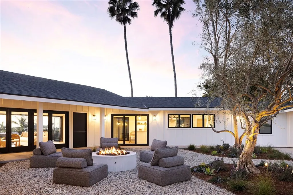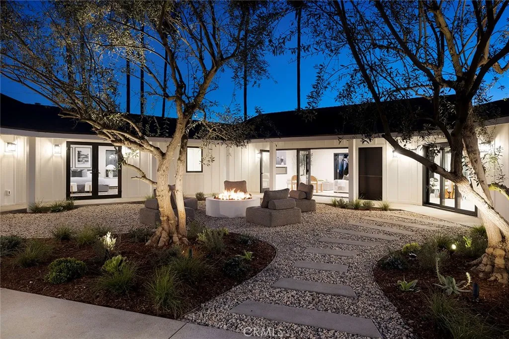 Perched on an approximately quarter-acre lot, this stunning 4-bedroom, 3.5-bathroom San Clemente home has been completely reimagined from the studs up, offering a seamless blend of coastal warmth and modern luxury throughout its approximately 2,978 sq. ft. of living space. Thoughtfully designed by Kaizon Interiors, every element has been curated to create an inviting yet sophisticated retreat. Upon entry, the large open-concept layout unfolds, revealing a spacious living room with a cozy fireplace, a dedicated dining area, and an elegantly designed kitchen, all flowing together effortlessly. Rich wide plank hardwood floors and high-end black accent hardware add warmth and contrast throughout the space. The kitchen is beautifully appointed with all-new Thermador appliances, quartz countertops, a stylish tile backsplash, pendant lighting, and a breakfast counter, balancing both form and function. The primary suite is a true sanctuary, featuring an ensuite bath with dual sinks, quartz countertops, a walk-in shower, and a freestanding soaking tub, as well as a custom-built dual closets for elevated organization. Three additional bedrooms provide flexibility, including one with a private entrance and ensuite bathroom, making it ideal for multi-generational living, an ADU, or a guest suite. Designed to embrace the indoor-outdoor lifestyle, the homes horseshoe-shaped layout wraps around a central courtyard, creating a private and tranquil open-air retreat. Multiple access points seamlessly connect the home to this lushly landscaped space, where a cozy firepit provides the perfect