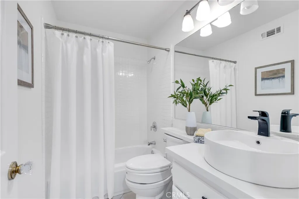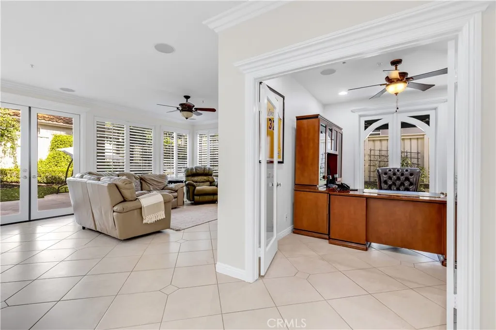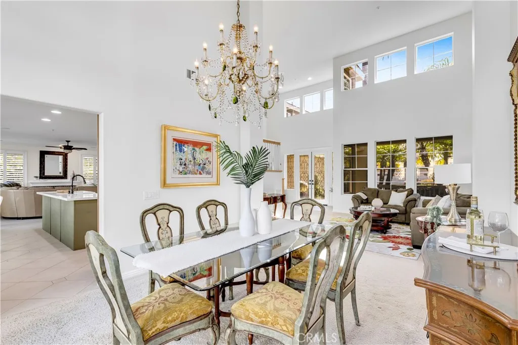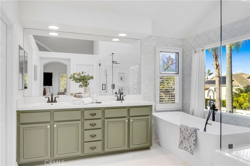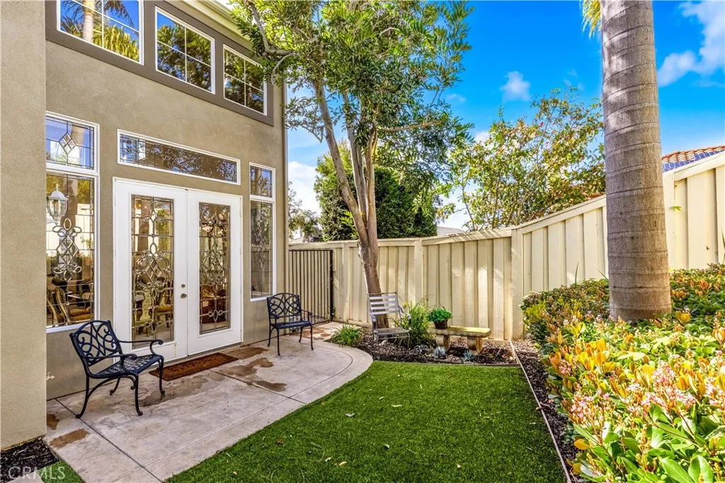 PRICE REDUCED!! Set on a quiet cul-de-sac in the ocean-view Harbor View enclave of Rancho San Clemente, this exquisitely upgraded 5-bed/3-bath residence captures the architectural drama & coastal elegance that define this sought-after neighborhood. A charming front porch & breathtaking custom leaded-glass double entry doors create an unforgettable arrival, opening to soaring two-story ceilings & walls of stacked windows that flood the living & dining rooms with natural light. Designed for both elevated entertaining & everyday comfort, the interiors blend timeless craftsmanship with curated upgrades throughout the nearly 3000 square feet floor plan: plantation shutters, custom moldings, brass-trimmed glass door knobs, & statement French doors. The formal dining room is a showpiece, framed by extraordinary leaded-glass French doors, sidelights, & transom windows that open to the backyard & cast shimmering light across the space. The updated kitchen pairs beauty & function with a custom-painted center island, quartz countertops, stone tile backsplash, & a premium stainless appliance suite including double ovens, double-drawer dishwasher, under-counter beverage cooler, & walk-in pantry - all flowing seamlessly into the family room & outdoor living beyond. A main-level bedroom is currently styled as a private office with custom French-door entry, walk-in closet, recessed lighting, & direct yard access. The adjacent bath has been thoughtfully remodeled with white cabinetry, quartz countertop, vessel sink, & contrasting dark-finish fixtures, hardware, & lighting. Upstairs, the gue