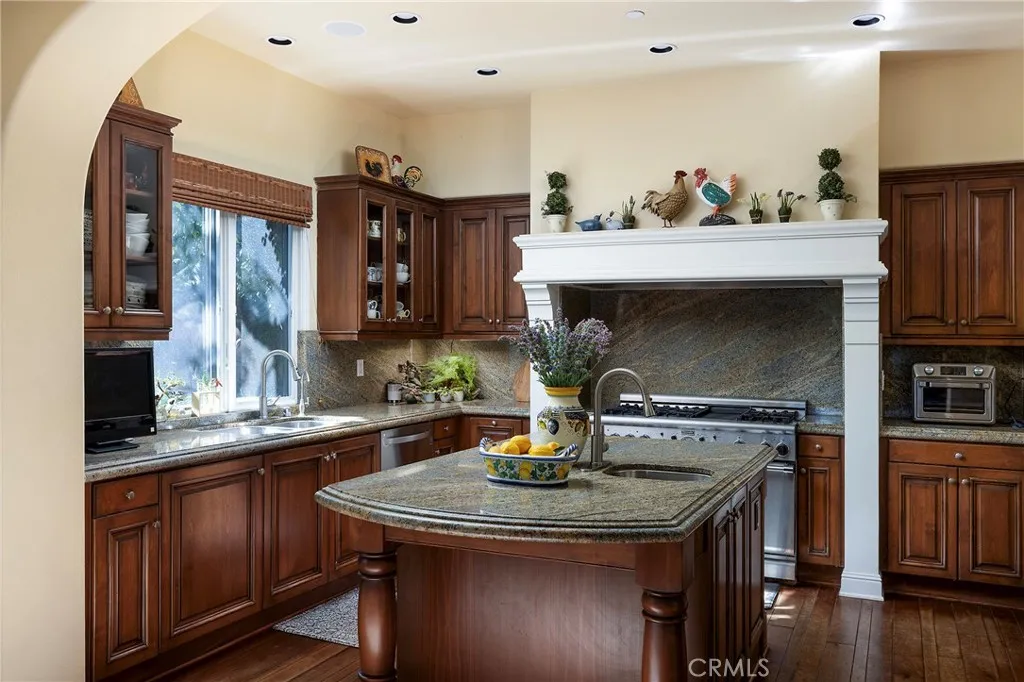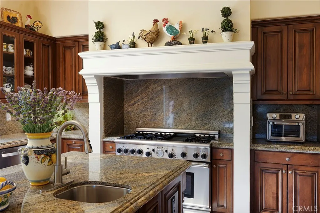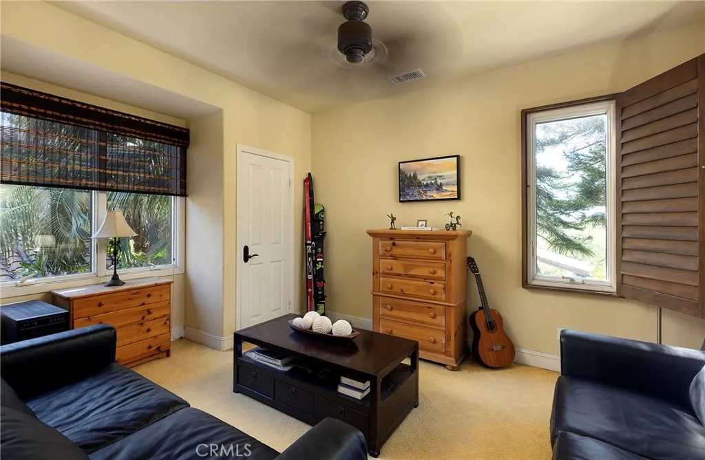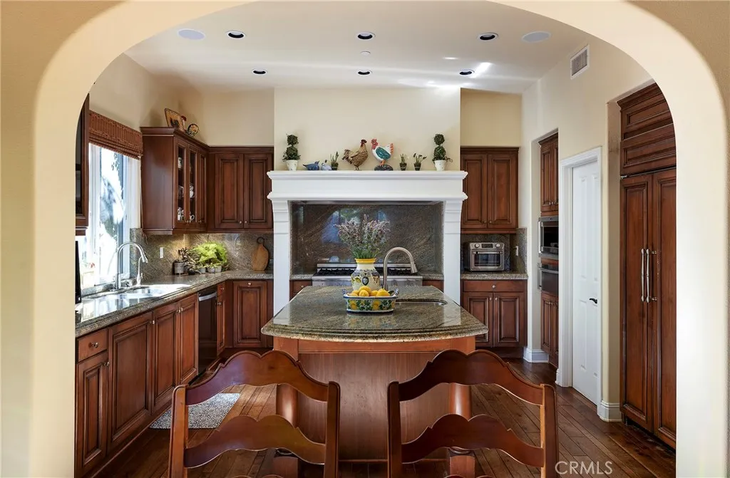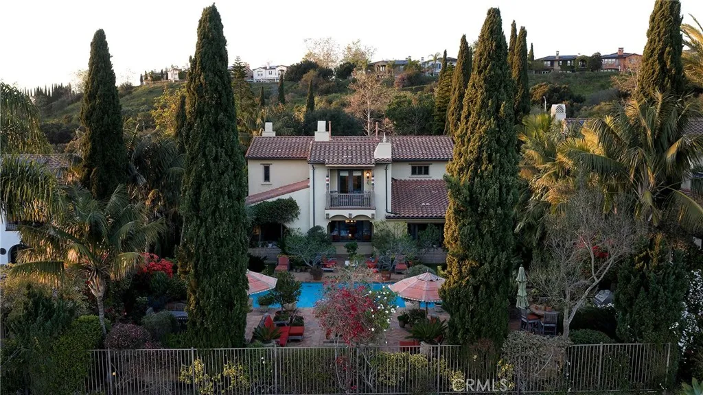 Set behind the gates of Careyes on one of its largest and most coveted 1/3-acre lots, this Italian Rivierainspired estate unfolds like a private European retreat tucked quietly into the hills of San Clemente. From the moment you arrive, there is a shift. The architecture feels storied and intentional, rooted in another era. Soaring wood-beamed ceilings rise above Richard Marshall hardwood floors with intricate mosaic inlays, while wrought iron detailing, arched passages, and precast stone fireplaces create depth and romance throughout. The expansive floor plan offers six bedrooms, five full baths and two half baths, including two detached casitas. The downstairs casita is appointed with a high-end TV surround sound system, ideal for theater-style entertaining, while the upper casita offers its own private living space for guests or multigenerational flexibility. Formal and informal spaces flow into a gourmet kitchen with professional-grade appliances and granite countertops, allowing the home to live as beautifully as it entertains. Interior rooms and garden areas were pre-wired for high-end sound, creating a seamless indoor-outdoor experience. Upstairs, the primary suite serves as a private sanctuary, opening to a double-doored balcony with peek-a-boo ocean views beyond the rolling fairways of the Fred Couplesdesigned championship golf course and adjacent natural preserve. Yet it is the grounds that truly set this property apart. The backyard unfolds in terraces of aged brick, a rare architectural landscape that evokes the romance of the Italian coast. Imported Italian pla
