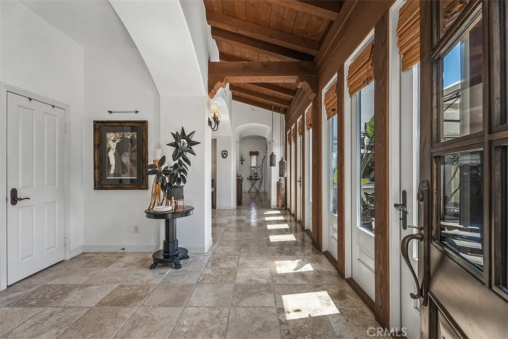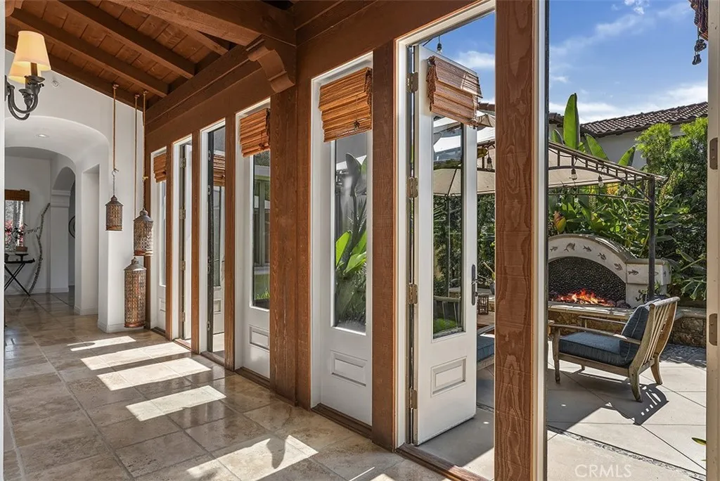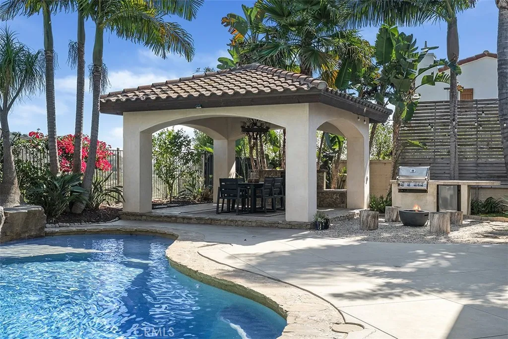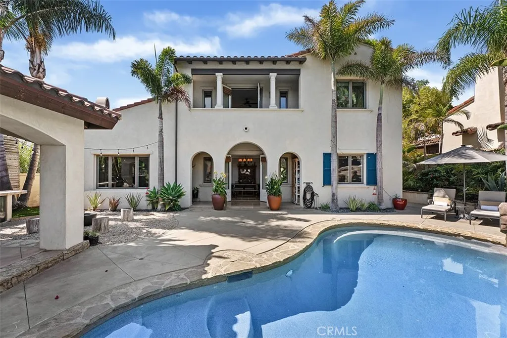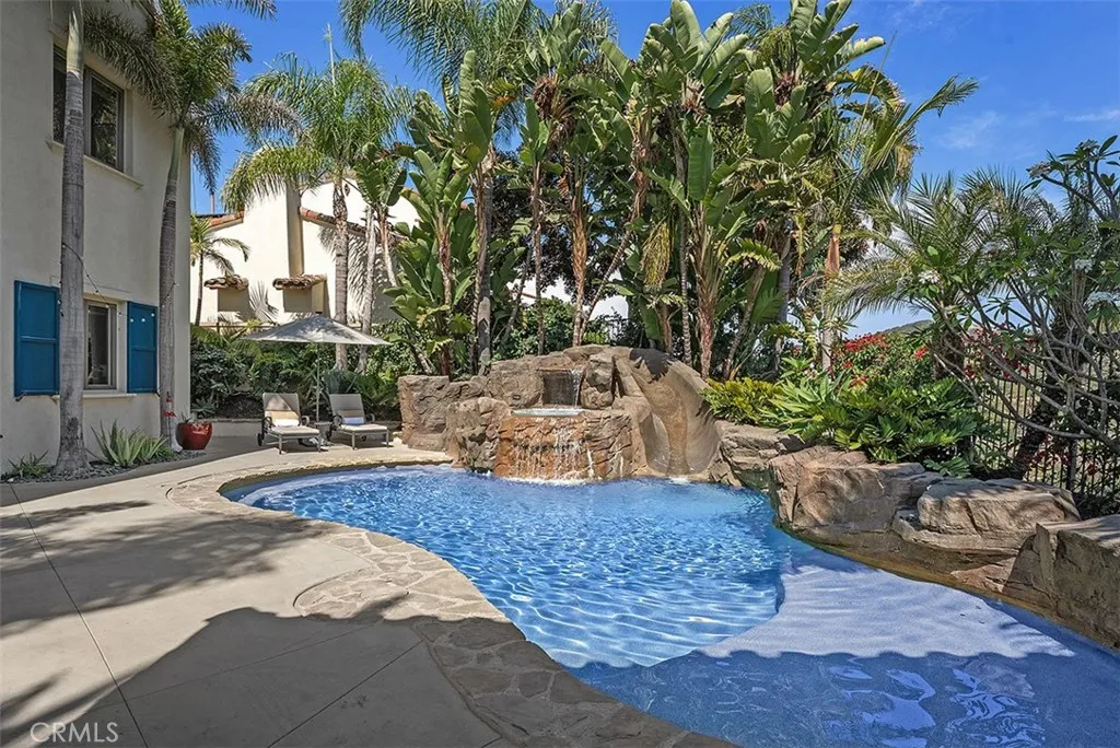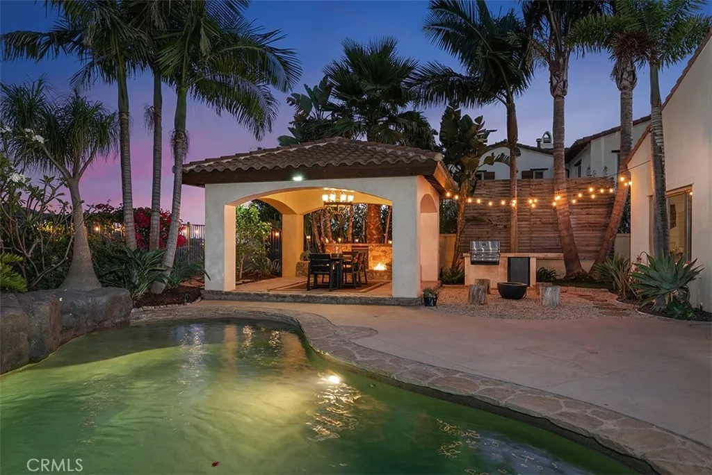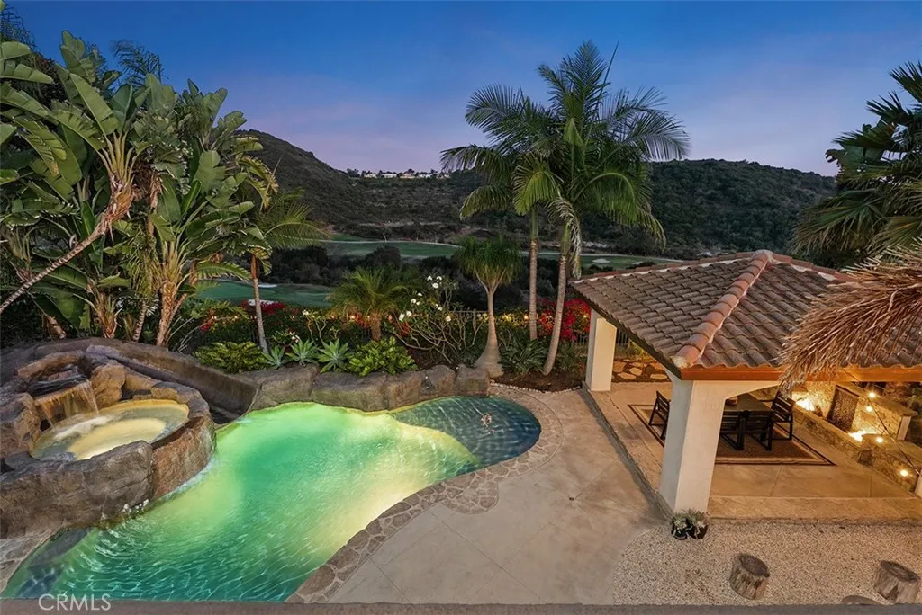 Every now and then, a residence comes along that truly delivers on the promise of having it all. Welcome to this San Clemente estate, poised behind the prestigious gates of Talegas exclusive Careyes enclave, where panoramic golf course views, privacy, refined enhancements, and an expanded floorplan set the stage for an extraordinary lifestyle. The grounds recall a private resort, with graceful palms rising over a backyard centered on a lagoon-inspired saltwater pool with water slide, Baja entry, sculptural rockscapes, and spa. Ocean breezes accompany al fresco dining within a custom pavilion featuring a dramatic fire and water element, seamlessly integrated with a built-in BBQ and beverage refrigerator. Nearly 10,237 square feet, the homesite extends indoor-outdoor living with an elevated front patio and, beyond a privacy door, a generous lawn and fireplace lounge for evenings under the stars. Inside, luxury continues across approximately 4,689 square feet, offering five ensuite bedrooms and five-and-one-half baths, complemented by a detached casita off the entry courtyardideal for an office, gym, or retreat. A second-floor bonus room expands possibilities, easily adaptable to an additional bedroom if desired. The foyer, opening through French doors to the courtyard, flows into a formal dining room crowned by a barrel ceiling and a great room anchored by a sandstone fireplace with views to both courtyard and backyard. A breakfast room connects to the outdoors and to a chefs kitchen designed with beauty and function, featuring granite countertops, stained-wood cabinetry, a b
