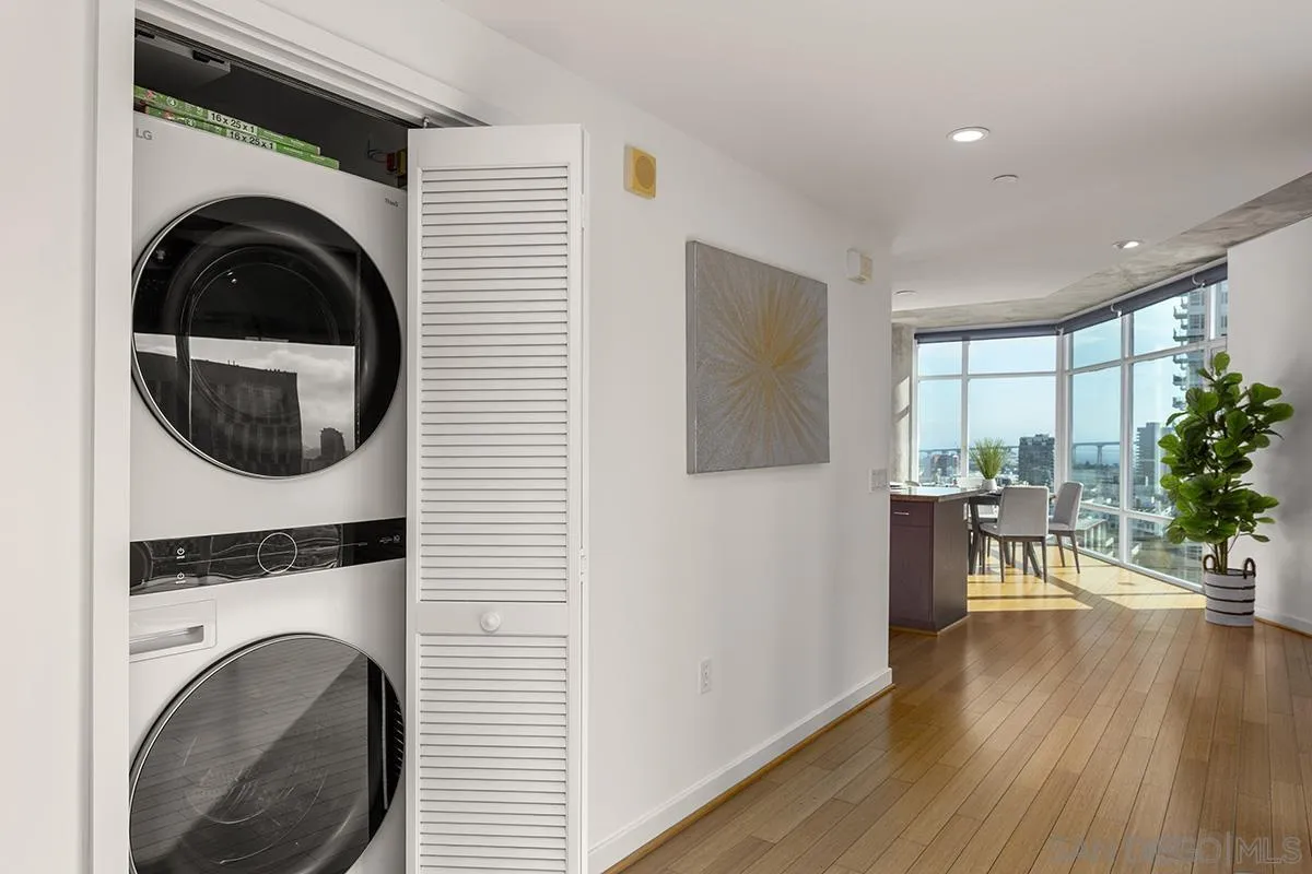 Welcome to the prime locale in Smart Corner, “The Point” floorplan, where walls of glass showcase panoramic views spanning Point Loma, the Pacific Ocean, San Diego Bay, and the Coronado Bridge from this premier south-facing residence. This spacious 1-bedroom open-concept layout is a blank slate for your vision, readily accommodating a 2nd bedroom or private den—a simple customization of adding drywall and a door unlocks the full potential of this exceptional urban home. You’ll love the modern style with loft-inspired character, complete with original bamboo flooring, exposed concrete accents, all opening to a huge balcony, a true standout feature ideal for entertaining, dining al fresco, or simply relaxing while soaking in the sweeping skyline and coastal vistas. The kitchen features stainless appliances, recessed lighting, and an eat-at bar for casual dining. Additional highlights include an upgraded washer and dryer, two excellent, separate parking spaces (rare P1 and a P3). Whether you’re seeking a stylish city residence, a smart investment, or a flexible live/workspace, this home offers unmatched views with a central Downtown location! VA approved.