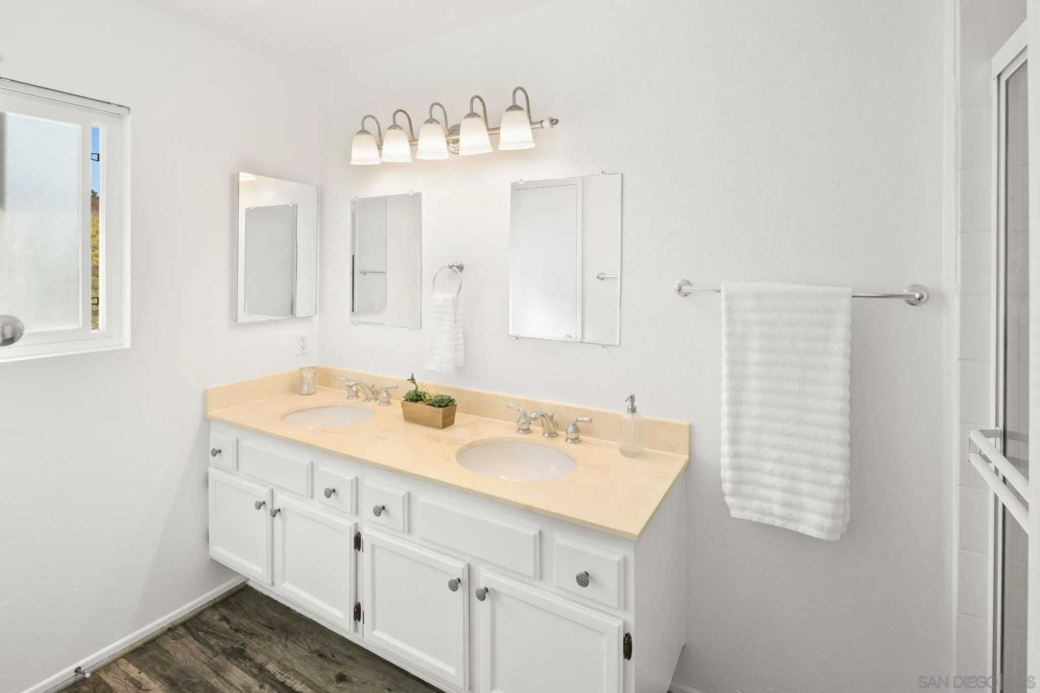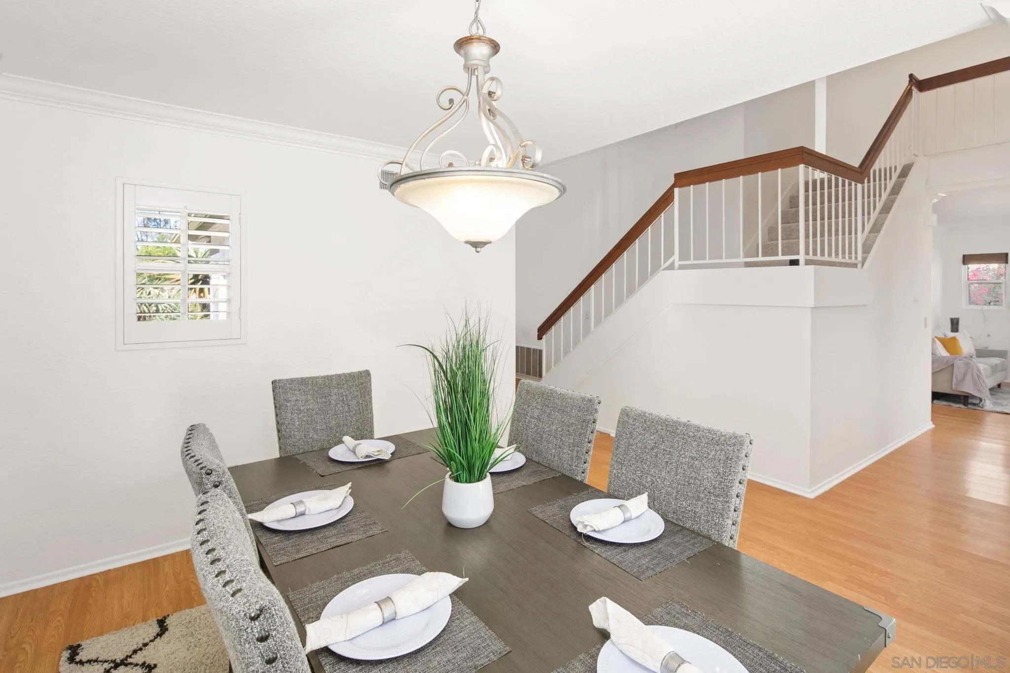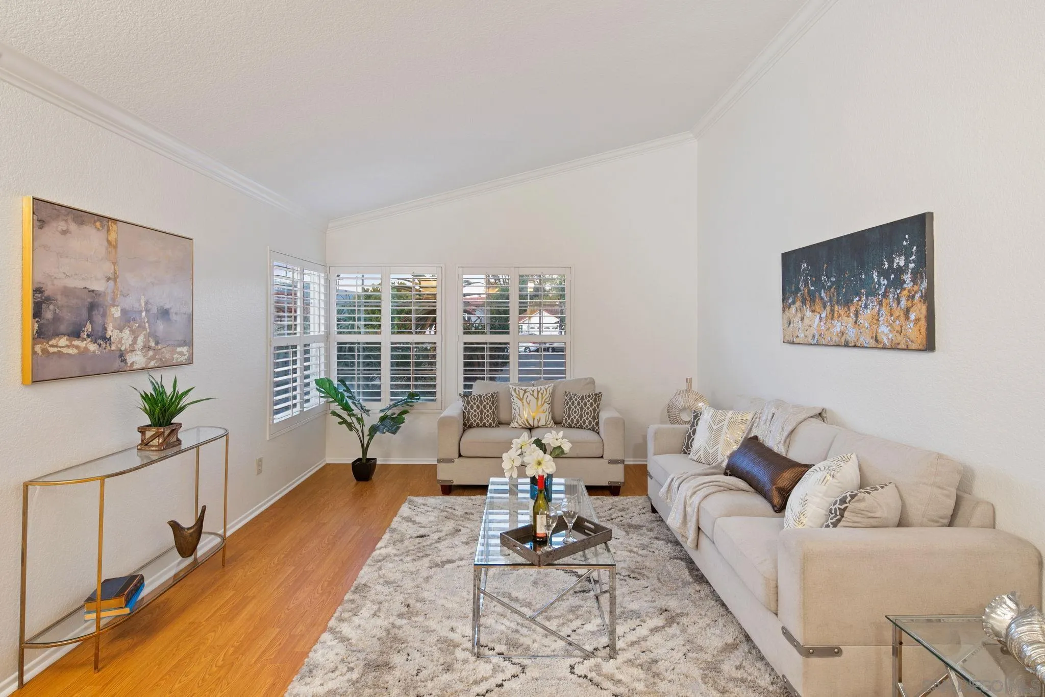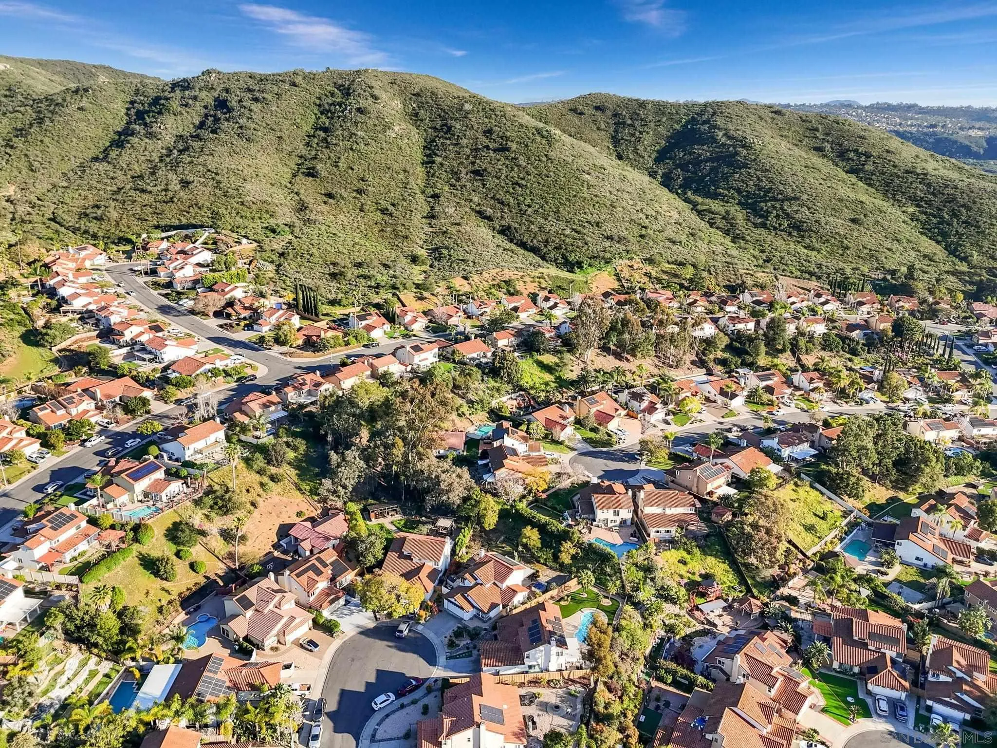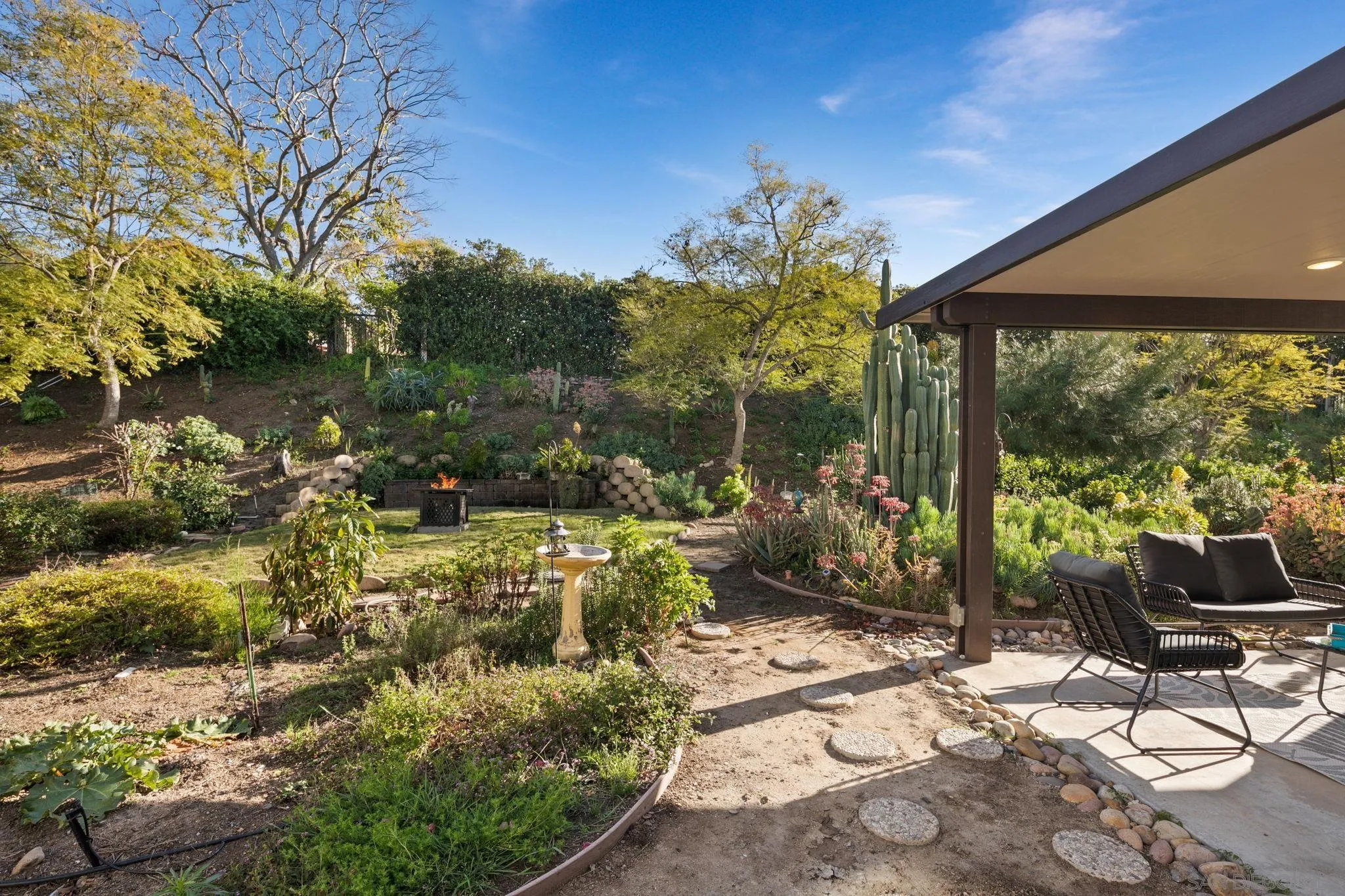 Ideally positioned in the serene hills of Sabre Springs and tucked at the end of a peaceful cul-de-sac within the award-winning Poway Unified School District, this beautifully updated residence rests on an expansive pie-shaped, fully usable 0.22 acre lot. Striking curb appeal begins with a vibrant and mature succulent garden that creates a warm and inviting first impression. Inside, soaring ceilings and an abundance of natural light enhance the spacious living room, which flows effortlessly into the adjacent dining area—perfect for both elegant entertaining and everyday living. The designer kitchen has been thoughtfully updated with custom cabinetry, sleek countertops, stainless-8steel appliances, gas cooking, and a sunny breakfast nook, all opening seamlessly to a welcoming family room centered around a contemporary brick fireplace. Upstairs, the generous primary suite offers a tranquil retreat with two spacious wardrobe closets and a beautifully refreshed ensuite bath. Two additional bedrooms and a well-appointed secondary bathroom complete the upper level, while a convenient fourth bedroom and full bath on the main floor provide exceptional flexibility for guests, a home office, or private fitness space. Outside, the thoughtfully curated, water-wise backyard unfolds like a private garden sanctuary, with whimsical meandering pathways leading to a variety of charming outdoor vignettes. Entertain beneath the pergola or covered patio, relax in the covered spa, or enjoy the multiple garden areas designed for peaceful moments outdoors.