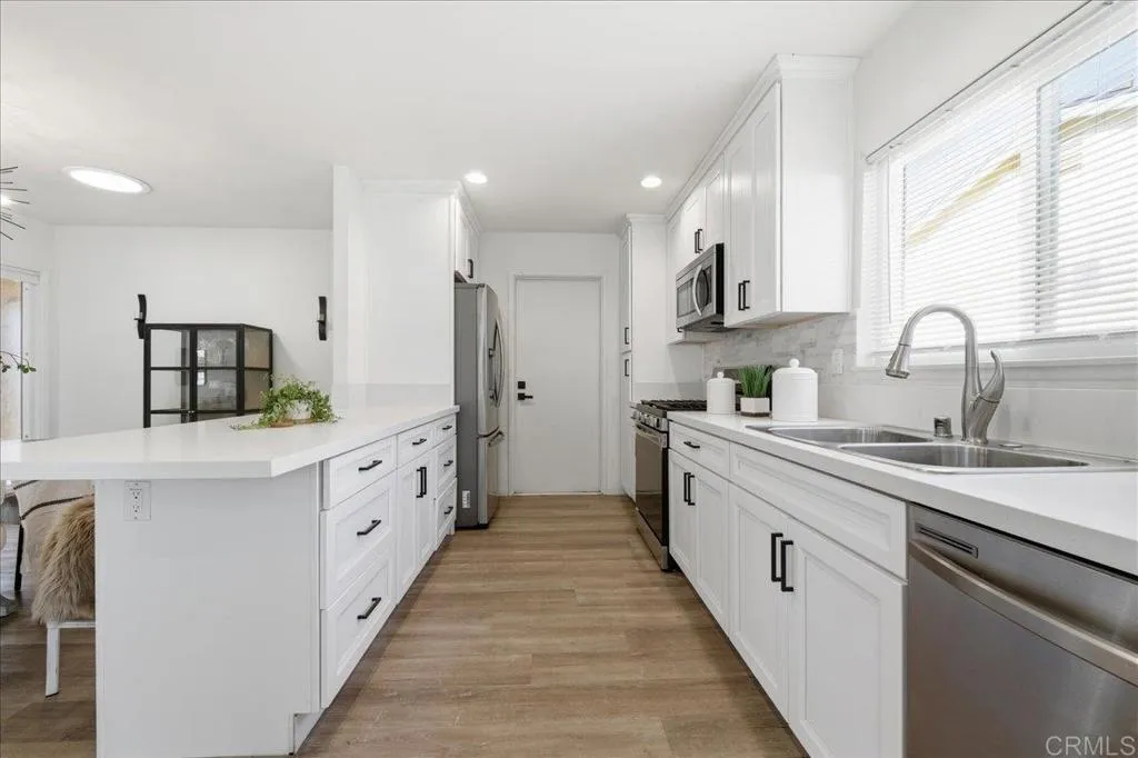 Extensively updated single-level home in the highly desirable Seven Oaks community, offering a rare combination of modern upgrades, open-concept living, and an inviting backyard designed for relaxation and entertaining. Step inside to discover a bright and inviting interior featuring luxury vinyl plank flooring, fresh paint, recessed lighting, and an expansive open living space centered around a cozy fireplace. The remodeled kitchen has been thoughtfully updated with white shaker cabinetry, quartz countertops, stainless steel appliances, and a large peninsula with seating, seamlessly connecting the kitchen, dining, and living areas for comfortable everyday living and easy entertaining. Both bathrooms have been tastefully renovated with modern vanities, updated fixtures, and clean contemporary finishes, while the bedrooms offer comfortable, light-filled spaces with new carpet and abundant natural light. The backyard is designed for outdoor living, featuring a pergola-covered patio with string lighting, spa, and a low-maintenance putting green, creating the perfect setting for relaxing evenings or hosting friends and family. Additional highlights include owned 4.3 kW solar installed in 2021, a newer HVAC system, and a highly desirable two-car garage, providing both energy efficiency and everyday convenience. Residents of Seven Oaks enjoy access to a vibrant and active 55+ lifestyle centered around the community center, which offers a heated pool and spa, fitness classes, pickleball, social clubs, hobby and craft studios, game rooms, library, and a full calendar of events and