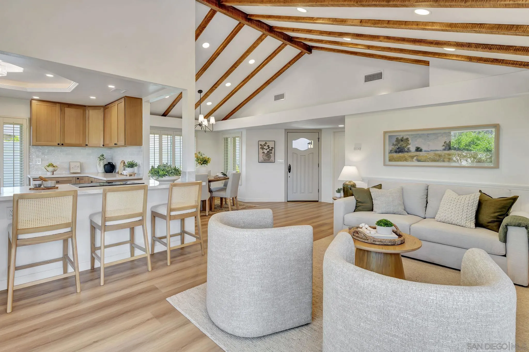 This beautifully updated and completely remodeled no threshold single-story home is just 2 minutes from the iconic Rancho Bernardo Winery. Located in a desirable 55+ community, this 3-bedroom, 2-bath residence features a bright, open layout with modern finishes throughout. Including updated flooring, kitchen, bathrooms, and fixtures. The spacious living area flows effortlessly into the dining and kitchen space, perfect for entertaining or relaxing in comfort. Enjoy low-maintenance living in a peaceful, well-kept community with access to nearby golf, shopping, dining, and more. Whether you're downsizing or ready for a lifestyle upgrade, this turnkey home offers it all.