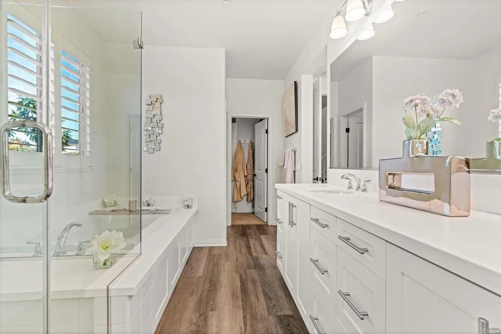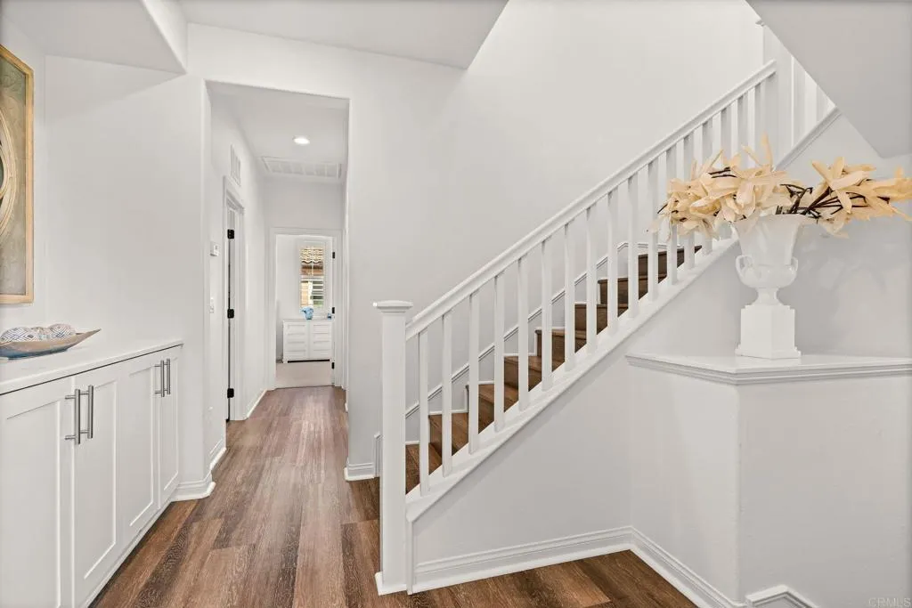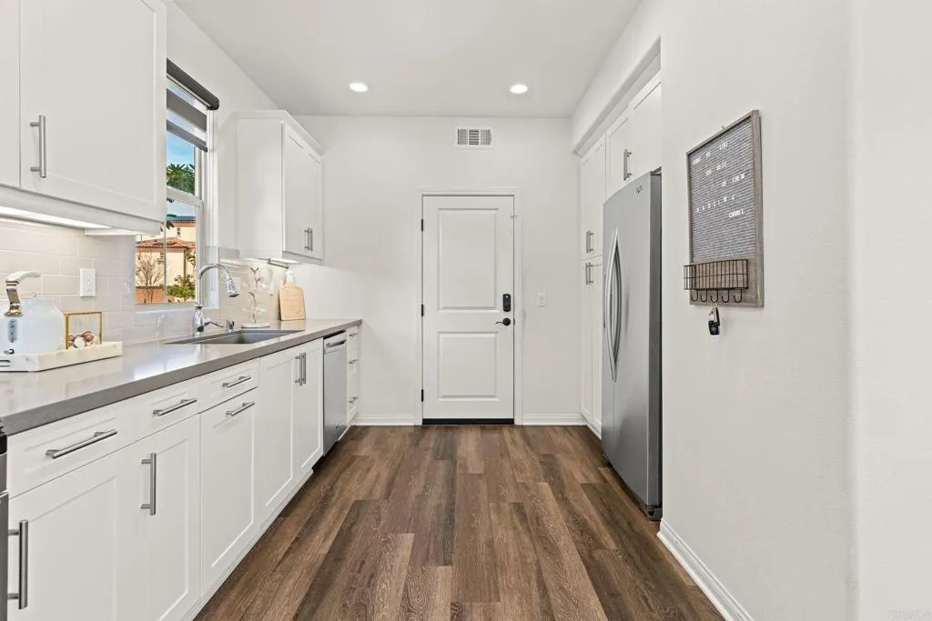 Located within the coveted gates of Veridian, this beautifully 3 story upgraded , 3-bedroom, 2.5bath corner unit townhome offers the perfect blend of comfort, style, and convenience. Thoughtfully designed with versatility in mind, this residence showcases exceptional craftsmanship and attention to detail from the moment you step inside. Elegant LPV flooring, modern white cabinetry, tall baseboards, and designer window treatments create a cohesive and sophisticated aesthetic throughout this immaculately maintained home. The bright open concept layout is anchored by a stunning kitchen featuring upgraded quartz countertops and a quartz island, a new stove, and a new microwave, perfect for casual dining, entertaining, or gathering with family and friends. Custom shades, new carpet, designer light fixtures, ceiling fans, and recessed LED lighting elevate both form and function, while natural light fills the living spaces. Just off the main living area, a charming patio provides the perfect setting for outdoor seating, ideal for enjoying your morning coffee, an evening drink, or soaking in San Diegos beautiful sunshine year-round. Upstairs, the primary suite serves as a private retreat, complete with a spacious walk-in closet and a spa- inspired bathroom featuring quartz countertops and a porcelain tiled walk-in shower. Two additional bedrooms are thoughtfully positioned nearby with convenient access to a well-appointed second bathroom. A great feature of this home is the versatile 3rd floor, offering flexible space that can serve as a family room, media lounge, home office, gym,