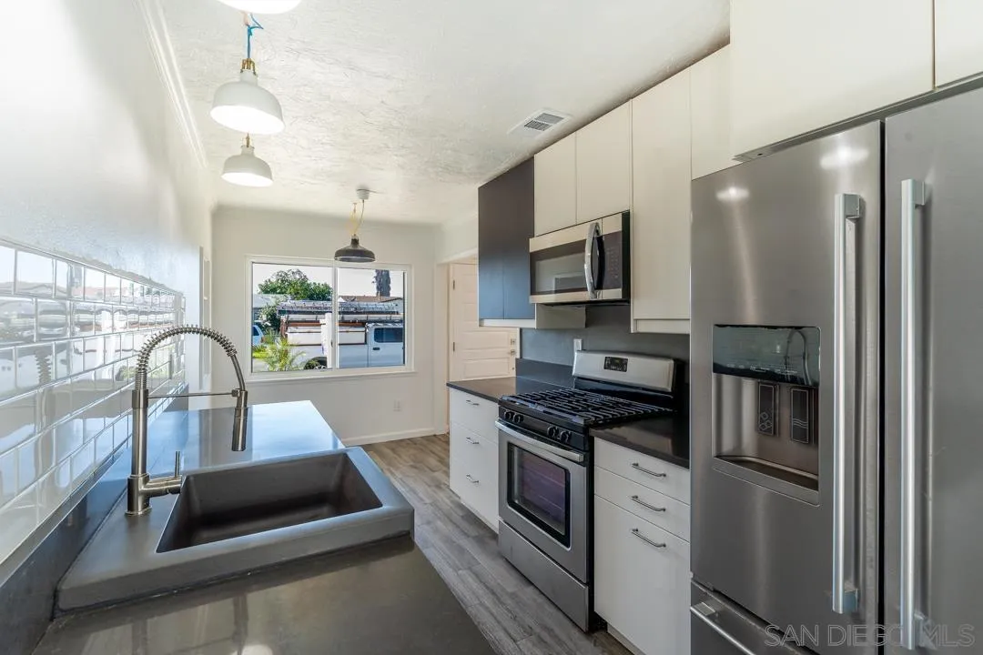 Welcome to Bay Ho, nestled between the neighborhoods of Bay Park to the south and University City to the north, across the 5 from Pacific Beach and La Jolla. This move-in ready home features 3 bedrooms and 1 bathroom within 900 square feet, plus additional unpermitted space and is zoned multi-family residential, and one of only a few single-family homes on the block. The kitchen is updated to a modern style that includes granite countertops, a new quartz sink, and tile flooring. Additional storage is in attached pantry space. Upgrades include sustainable landscaping in the front yard, new bathroom vanity, new carpet, and fresh paint throughout the home. Other features are air conditioning & heating, crown molding, deep closets, and newer vinyl windows. An additional 12’ x 12’ bonus room offers a versatile space with plenty of natural light. The fenced backyard is ready to design your private retreat. Recreation access is minutes away, like the San Clemente Canyon Trailhead, Rose Canyon Bikeway, and Mission Bay with boat launches, sailboat rentals, bike & walking paths, basketball courts, and playgrounds. Walkable to Alcott Elementary School, which doubles as a dog park outside of school hours and during the summer. Shops and restaurants at Clairemont Town Square are minutes away, with neighborhood Sprouts and Costco stores down the street. Clear view of Mt Soledad and only blocks to the bus line. Reduce your commute as this property is conveniently located near 5, 52, and 805 freeways. Just minutes from surrounding beach communities, and downtown.