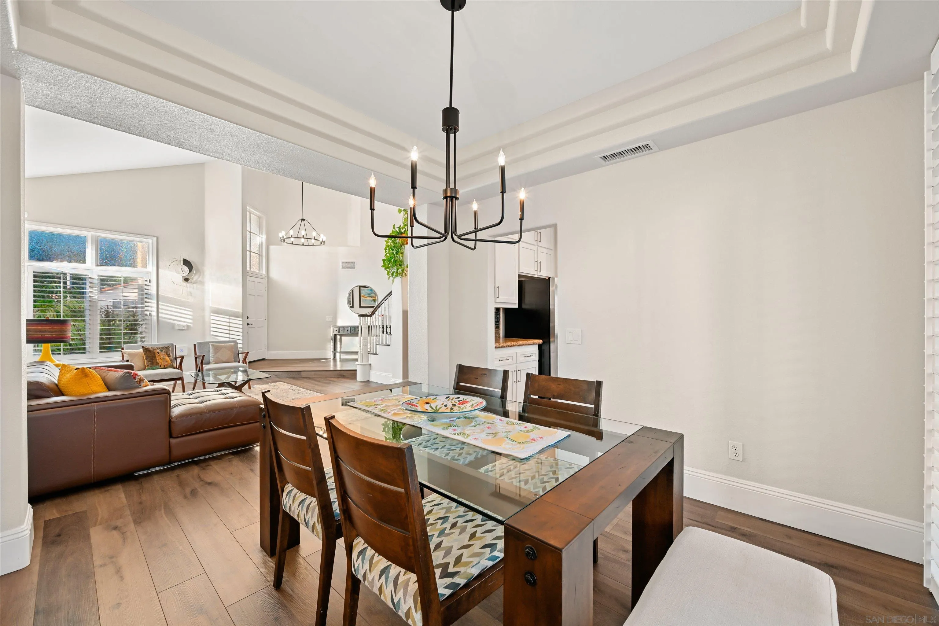 Discover elevated living in this exquisite executive home in the sought-after Cantamar neighborhood of Carmel Valley. Perfectly positioned on a premium cul-de-sac, this picture-perfect residence blends timeless elegance with modern style. Enter through dramatic double doors into a grand foyer, where a sweeping curved staircase and soaring two-story ceilings create an impressive, light-filled welcome. The spacious living room offers the perfect setting to entertain or unwind and flows seamlessly into the formal dining room, highlighted by a tray ceiling for added sophistication. A desirable first-floor bedroom and full bathroom provide flexibility for guests or multi-generational living. The chef’s kitchen is both beautiful and functional, featuring sleek white cabinetry with self-closing drawers, granite countertops, an oversized island with bar seating, pendant lighting, stainless steel appliances, and a large walk-in pantry. It opens effortlessly to the inviting family room with a cozy fireplace. Designed for indoor-outdoor living, glass sliders lead to a spacious, beautifully landscaped backyard complete with artificial turf and a patio ideal for relaxing, entertaining, or dining al fresco. A laundry room with sink and storage, along with a three-car garage, completes the main level. Upstairs, the primary suite serves as a private retreat, offering a fireplace, a walk-in closet with built-in organizers, and a spa-inspired bathroom with quartz countertops, a soaking tub, and a large walk-in shower accented with decorative glass tile and herringbone stone flooring.