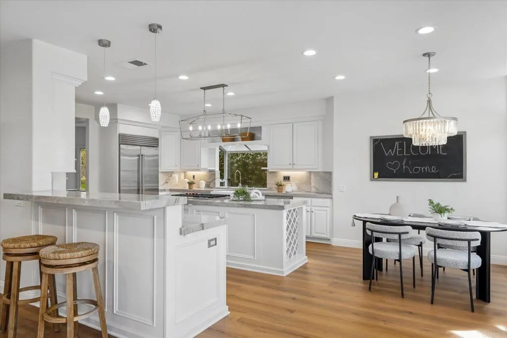Stunning executive home situated on a quiet double cul-de-sac in the heart of Carmel Valley. Perfectly positioned on a private lot with serene skyline views, this beautifully upgraded 6-bedroom, 5-bath residence is an entertainers dream, complete with a sparkling POOL & SPA, and OWNED solar! The dramatic entry welcomes you with soaring ceilings and abundant natural light, leading to a functional floor plan featuring two bedrooms and two full baths on the main levelideal for guests, an office, gym, or multi-generational living. The entertainers dream kitchen showcases exquisite quartzite counters and full backsplash, Sub-Zero French door refrigerator and beverage cooler, Wolf cooktop, Cove dishwasher, and designer fixtures. Wide-plank luxury vinyl flooring adds warmth and style, complemented by solid-core mahogany interior doors and fresh paint throughout. Upstairs, youll find four spacious bedrooms including a luxurious primary suite with marble counters, plus an additional office space and an ensuite guest room. The resort-inspired backyard was designed for year-round entertaining, complete with a newly designed poolside living room featuring outdoor fireplace, built-in Blaze grill, Sub-Zero beverage fridge and ice maker. Enjoy effortless control with a fully app/Wi-Fi-automated Aquastar Pro Poolside Tech system (pool pumps, heater, and filter all <3 years old). Additional upgrades include a 6.2kW LG solar system, 3-year-old Bosch 18-SEER HVAC, Pentair water softener, Tesla charging station, Andersen exterior doors, Wi-Fi controlled garage doors, and 3-car garage! Located