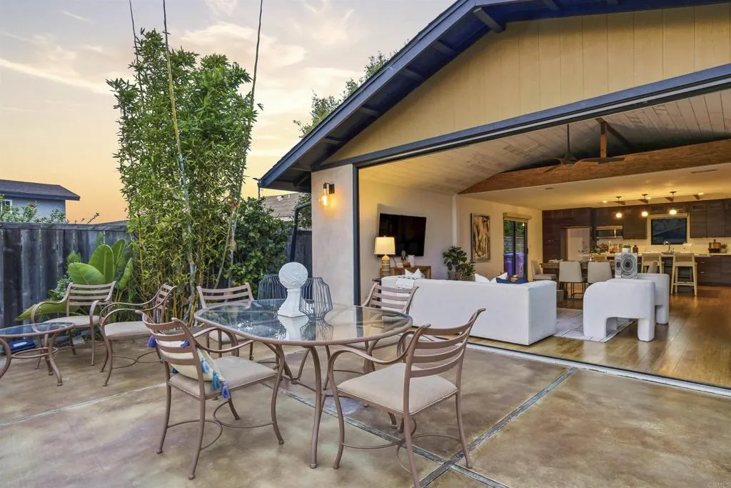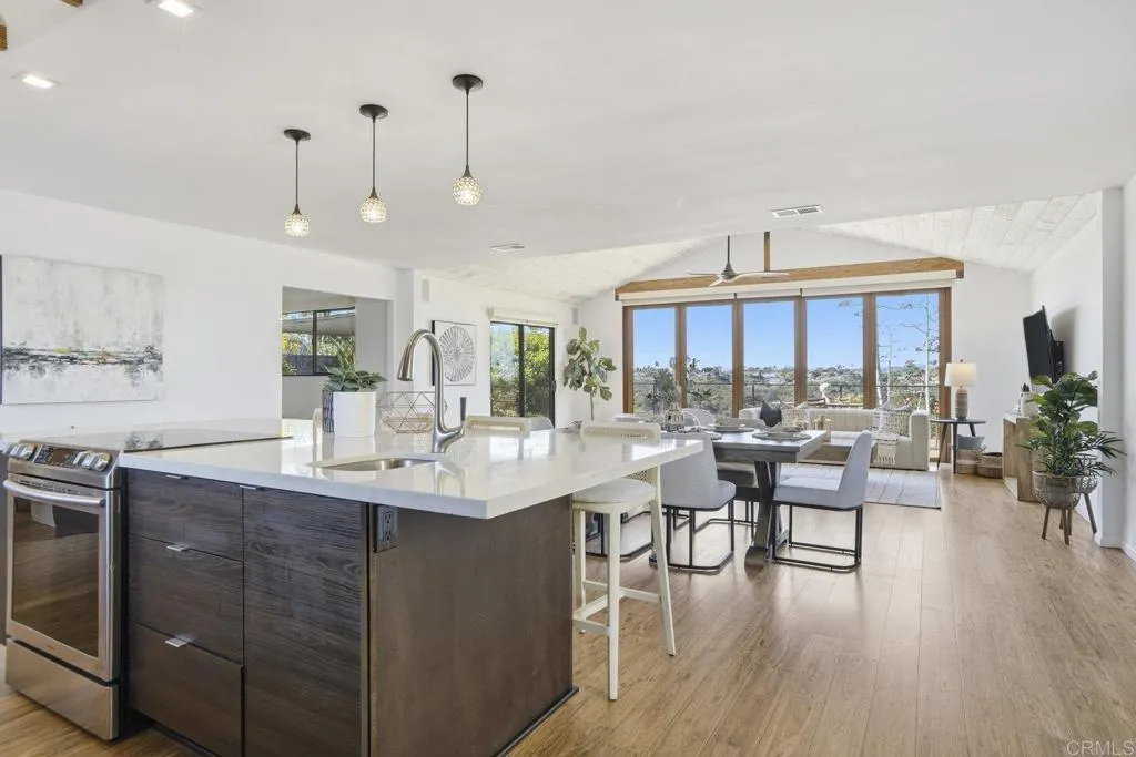 Experience stunning panoramic canyon and sunset views from both the back patio and living room of this North Clairemont canyon rim residence. Enter through the front door to an impressive open concept living room and kitchen that seamlessly connects to the backyard via a collapsible wall-to-wall folding door system. The property features convenient upgrades, including owned solar panels with Tesla Powerwall, tankless water heater, updated wiring and electric panel, engineered eucalyptus hardwood flooring, and a newer roof. The kitchen offers elegant dark wood cabinetry for ample storage, stainless steel appliances, quartz countertops, a spacious island with sink, and a breakfast bar. Exposed beams throughout the home add distinctive character to the living spaces. Additional enhancements include remodeled bathrooms and vaulted ceilings in the living room and primary bedroom.