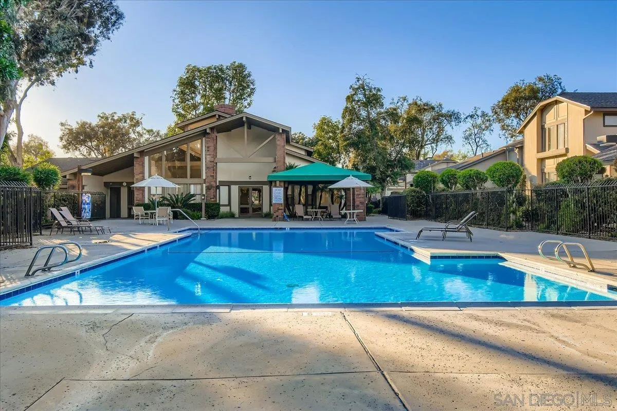 Luxurious corner townhome in the highly sought-after Tierrasanta community. This stunning residence offers vaulted ceilings, an expansive open-concept floor plan that lives like a detached home, and a versatile bonus den/family room that can easily be converted into a fourth bedroom. The entry welcomes you with dramatic high ceilings accented by a striking beam detail, flowing into the bright and modern dining and living room combination. The main level has been beautifully upgraded with cherry hardwood floors and custom shutters throughout. The gourmet kitchen is a showstopper, featuring rich cherry cabinetry, granite countertops, stainless steel appliances, a wine fridge, and French doors that open to the private patio. An additional bar area provides the perfect casual dining space. The spacious primary suite is conveniently located on first floor.