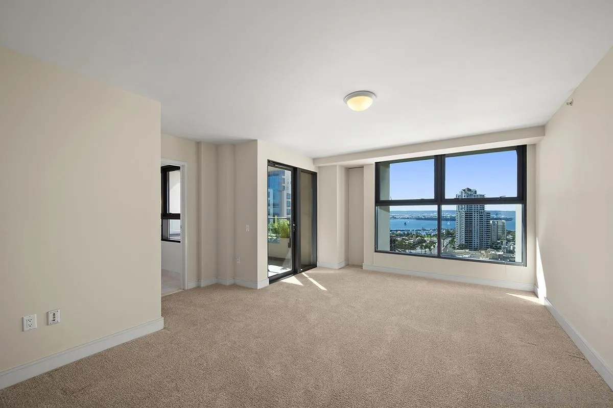 Don’t miss this one-of-a-kind, northwest corner floor plan in the south tower of Renaissance! Views are yours in every room; from sparkling city lights to the blue waters of the bay spanning beyond Point Loma! Beautifully upgraded, featuring a dual primary layout, fireplace in the living area, wood floors, and a generous amount of storage provided by the built-ins in nearly every room. The kitchen boasts granite counters, a large center island, high-end appliances by Sub-Zero and GE Monogram, plus an office space and breakfast area. The large primary suite offers its own private patio, a huge walk-in closet with a customizable system by Elfa and a fold down ironing board to boot. The en-suite bath features beautiful marble surrounds, a jetted spa tub, dual vanity, and separate walk-in shower. Guests will love the second bedroom which feels like its own private wing with en-suite bath and a spacious walk-in closet. This residence also includes a storage unit (level 1) and two separate parking spaces (level 2).