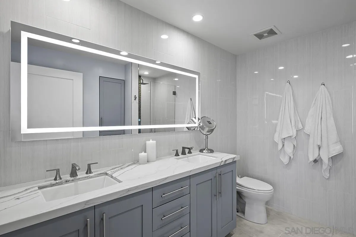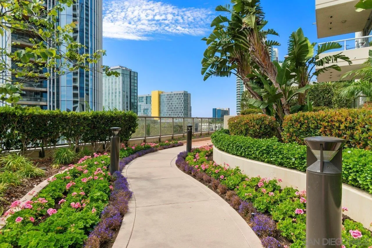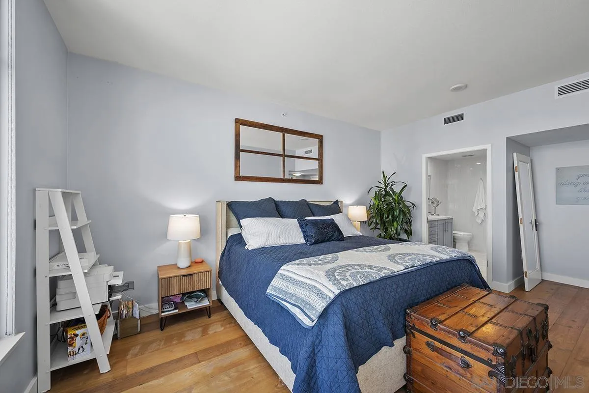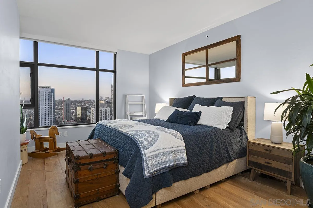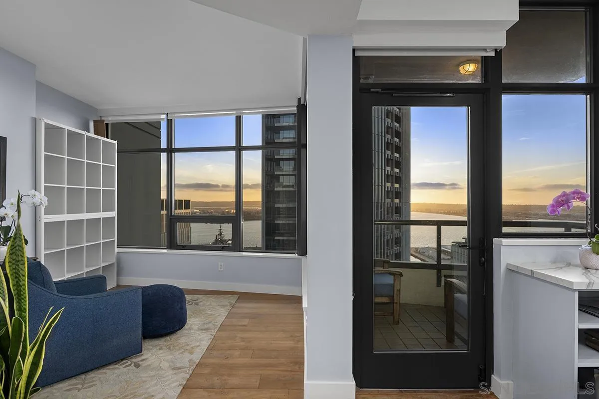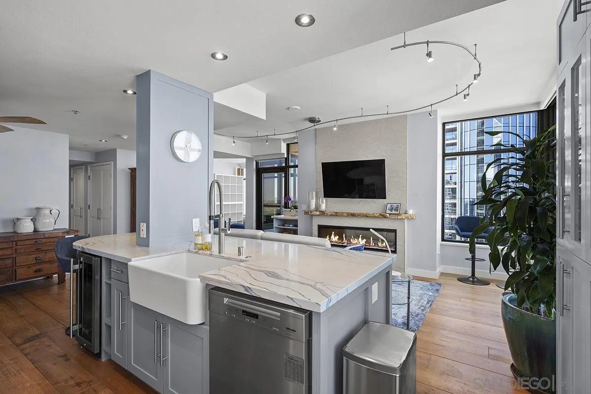 Come experience true high-rise living in one of only two residences with this coveted floor plan at Electra. Perched on the 29th floor, this fully reimagined northwest corner home captures sweeping views of the bay, Point Loma, and the sparkling city skyline from every room. A private balcony sets the stage for unforgettable San Diego sunsets. Thoughtfully redesigned for both style and function, the residence showcases wide-plank reclaimed teak flooring, a sleek linear fireplace with stone surround, and a striking petrified wood mantel. The open-concept kitchen is a true standout created for those who love to cook and features a Wolf range, built-in Sub-Zero refrigerator, Miele dishwasher, beverage chiller, quartz countertops, farmhouse sink, subway tile backsplash, and a custom glass-front display cabinet. Wake up to blue water views in the serene primary suite, complete with a spa-inspired ensuite bath offering dual vanities, a modern LED mirror, and a step-in shower. The versatile second bedroom, currently styled as a den/office, retains its closet and can easily be converted back to a full bedroom. The guest bath has also been tastefully upgraded with quartz surfaces and new cabinetry. Additional highlights include side-by-side parking on P1 with EV charging and dedicated storage on the same level. Ideally located in the vibrant Columbia District, you’re just moments from Waterfront Park, Little Italy, and Seaport Village. Rarely does a home combine this level of design, location, and view come along often so don’t miss your opportunity.