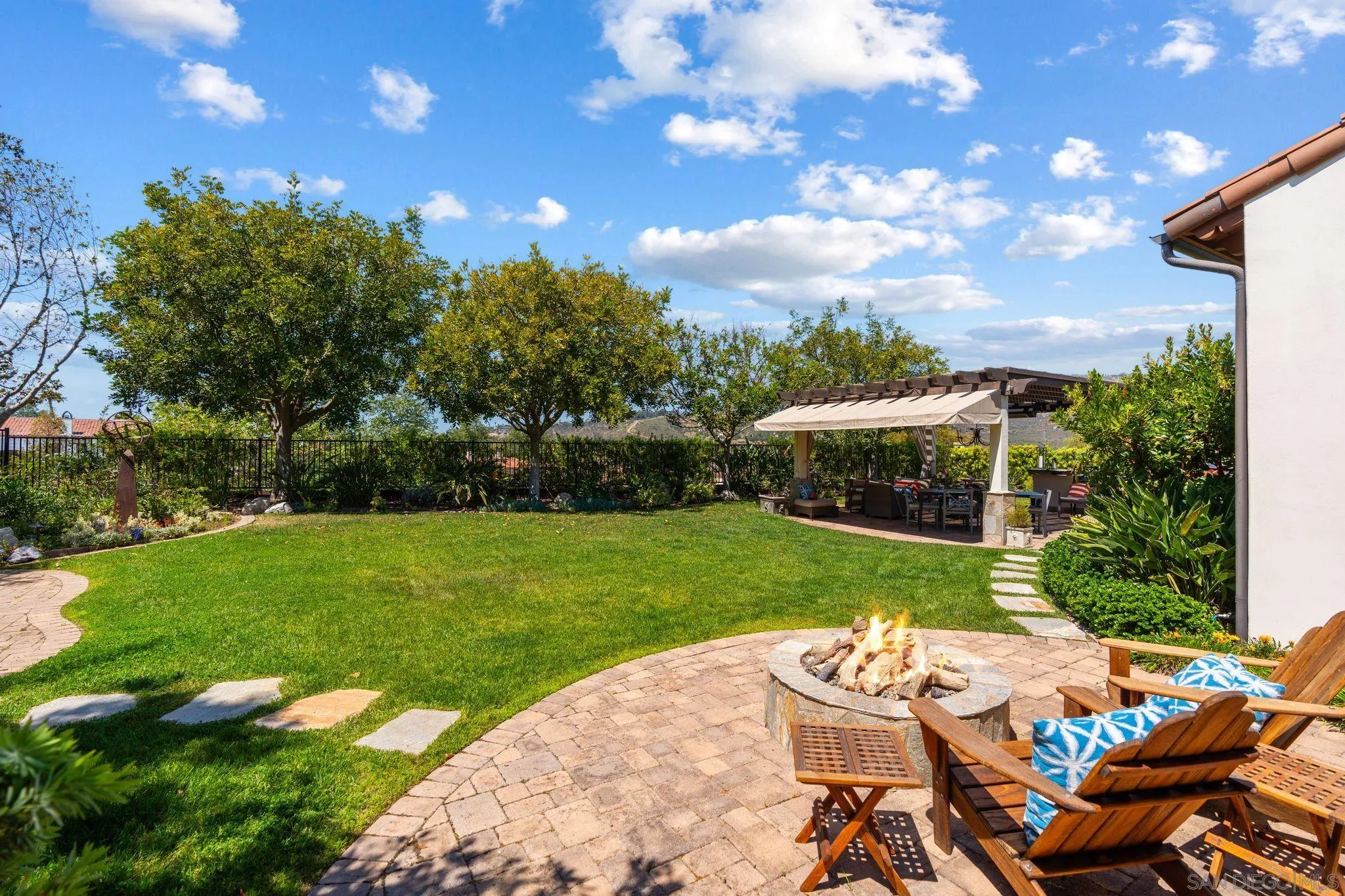 Location! Location! Location! Exquisitely customized with the highest quality of finishes, materials and amenities, this pristine property offers perfection. Peacefully sited across from a private park and enjoying an exceptionally large, flat, all usable homesite WITH PROTECTED VIEWS, this 3 bedroom, executive library, 2 Family room home is completely turnkey! And, the property's ideal sun orientation allows living the California lifestyle year round! Polished stone flooring throughout, exactingly executed built-ins and cabinetry in abundance, and a floorplan that lives like a *single level with the beautiful Primary Suite on the first level* The 2 secondary bedrooms (one with separate outdoor access) as well as the second family room are on the second level. Enjoy the one-of-a-kind gorgeously handsome library/executive office outfitted by a master wood crafter, adorned with walnut, Carpathian elm, and a strikingly attractive fireplace. Fireplaces also enhance the serene first floor master suite, the perfectly proportioned family room with built-in entertainment center, and the private side patio. In addition, an inviting stone clad fire pit awaits in the very large, all usable rear garden! As functional as it is attractive, the outdoor BBQ cooking station, large trellised patios, exceptionally ample green space and a soothing waterfall cascading into the outdoor spa optimize the view-oriented site. Additional features include: 3-car garage with epoxy floors and capacious built-ins . Enlarged and enhanced utility room.