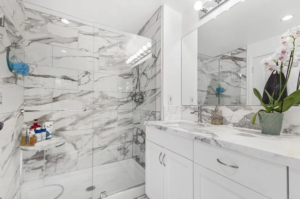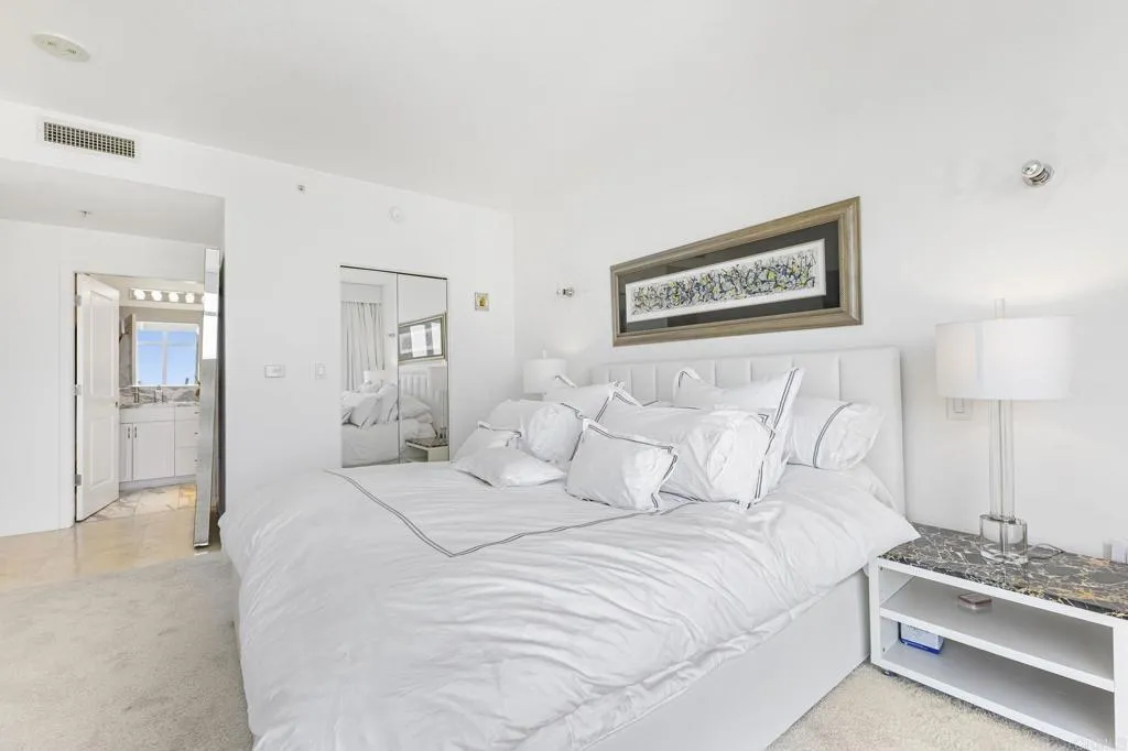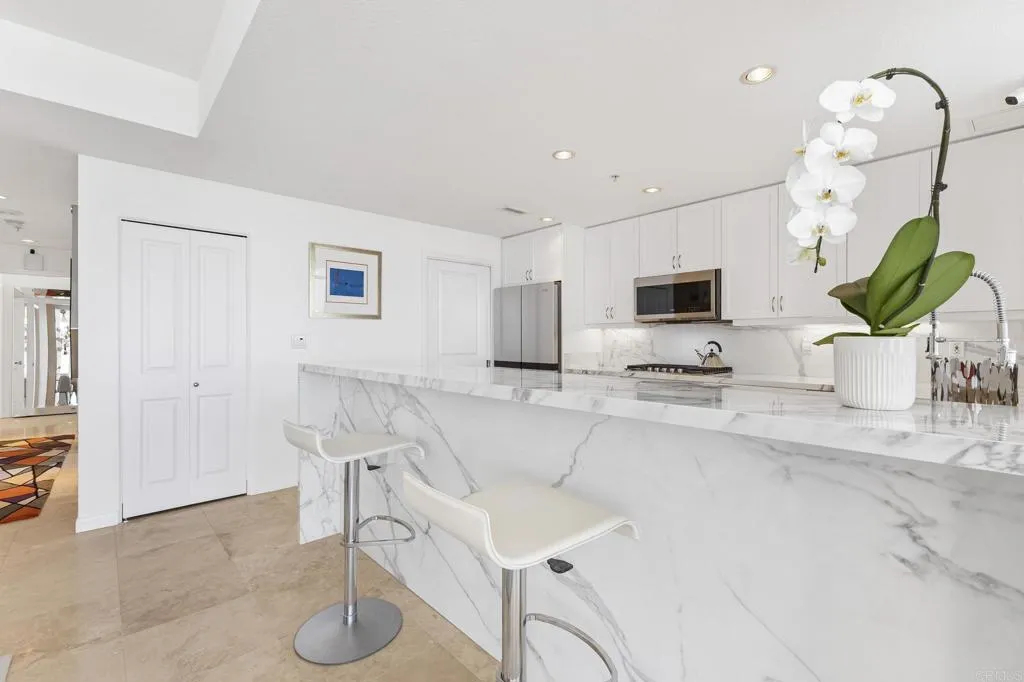 Experience the height of modern elegance in this impeccably designed 2Br 2Ba residence with den, offering the perfect blend of style and urban sophistication. Discovery at Cortez Hill is a contemporary full service luxury building offering residents comfort, convenience, and security. Expansive open-plan living areas flow seamlessly across honed travertine floors, illumilnated by statement lighting and spectacular views framed by floor to ceiling windows with automated roll-down shades and a beautiful gas fireplace. Entertain guests at the elegant bar or move to the private balcony with views of Balboa Park and the beautiful mountains to the east. Peek bay views to the west and south add to the ambiance. The chefs kitchen is both beautiful and functional, featuring sleek Italian porcelain countertops, custom cabinetry, and top-tier stainless steel appliances; an entertainers dream that anchors the homes refined aesthetic. The serene primary suite invites relaxation with blackout shades and drapes, for a restful night's sleep and a spa-inspired bath with dual marble vanity, soaking tub, walk-in shower and generous storage. The 2nd bedroom and bath provides comfort for family or guests while the versatile den provides the ideal setting for a home office, media lounge, or creative space. An in-unit laundry and walk-in pantry provide storage and convenience. The building features 24-hour concierge, a state of the art fitness center with separate weight room and cardio equipment, steam room, and sauna. The rooftop lap pool, spa, barbecues, fire-pit, and outdoor dining area are l