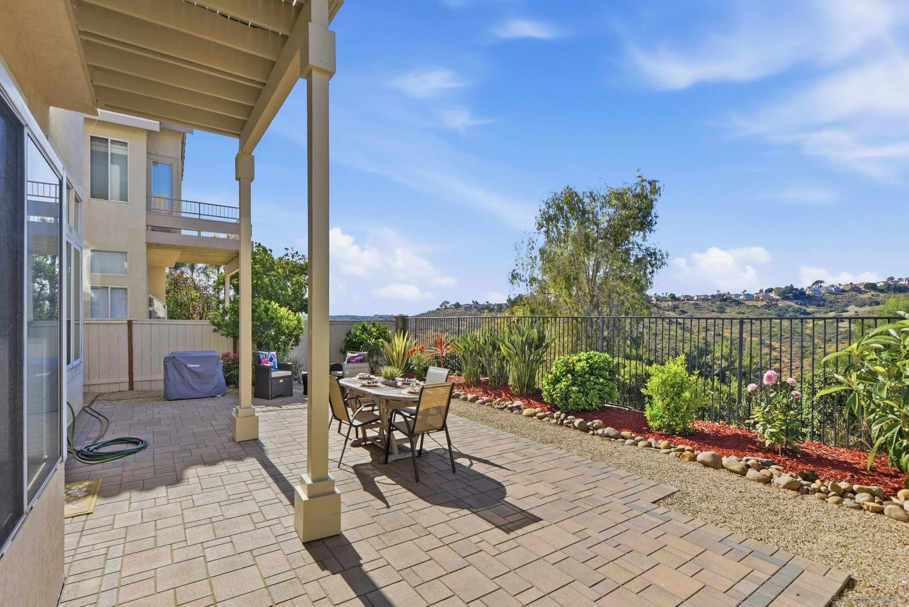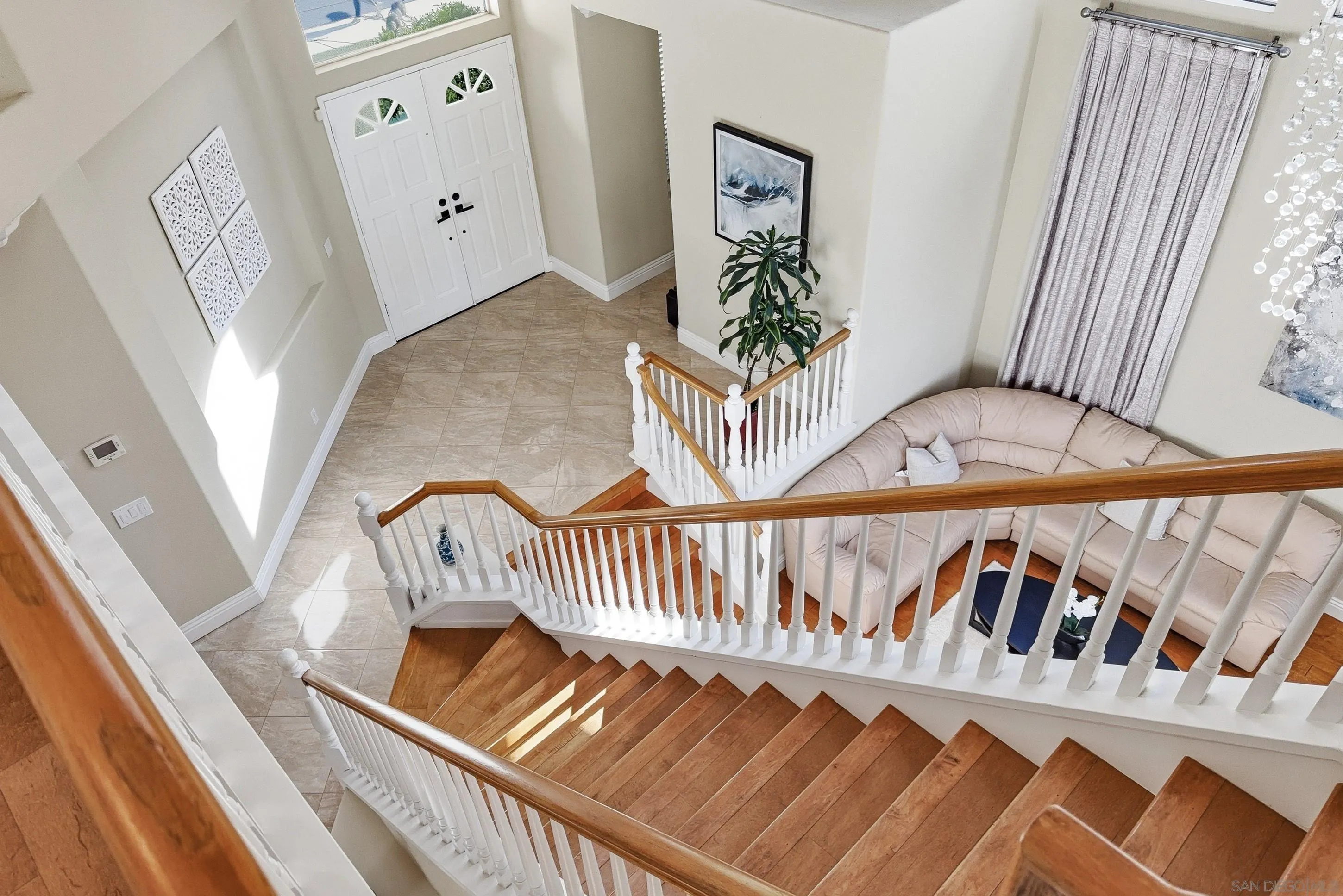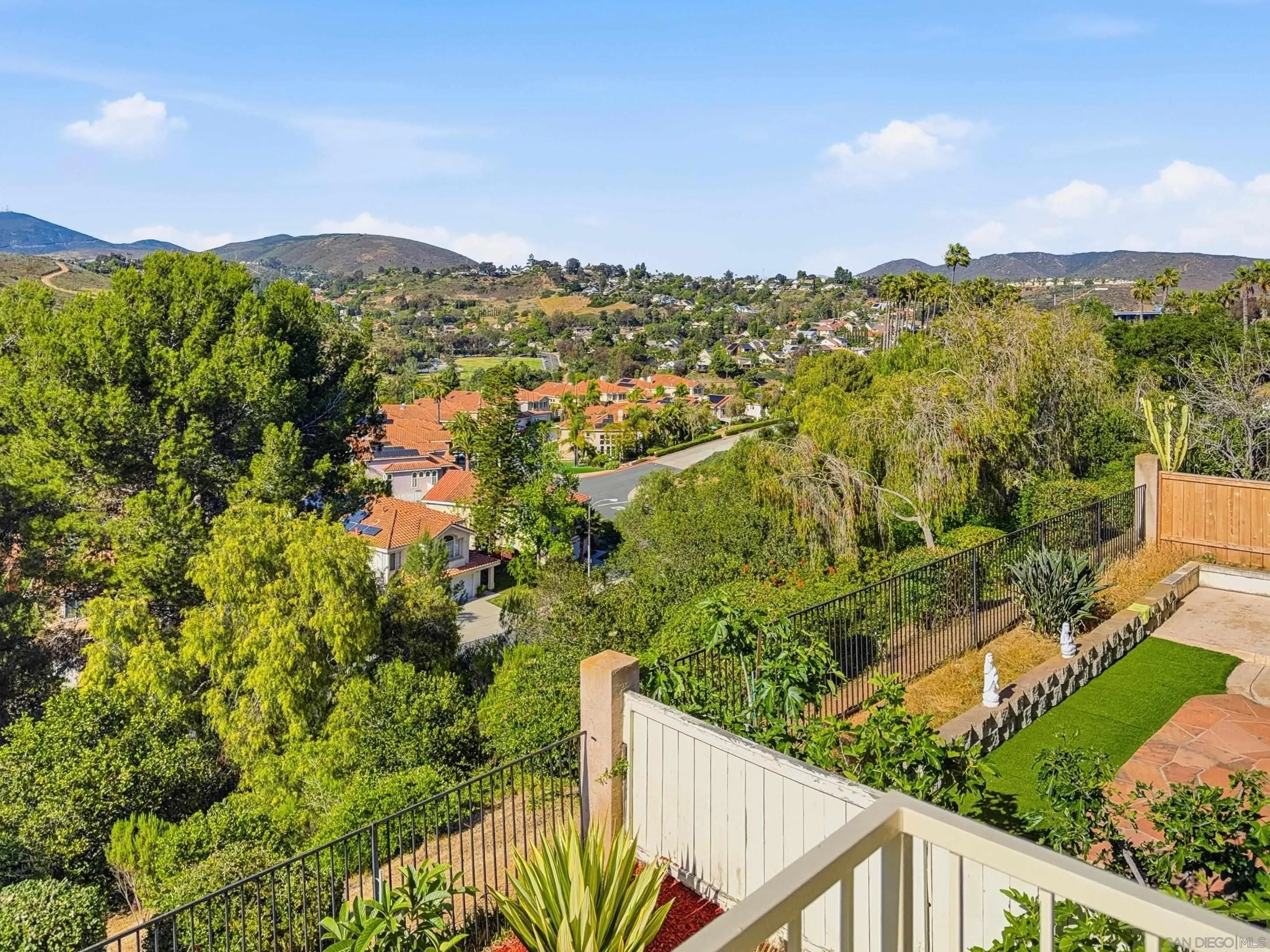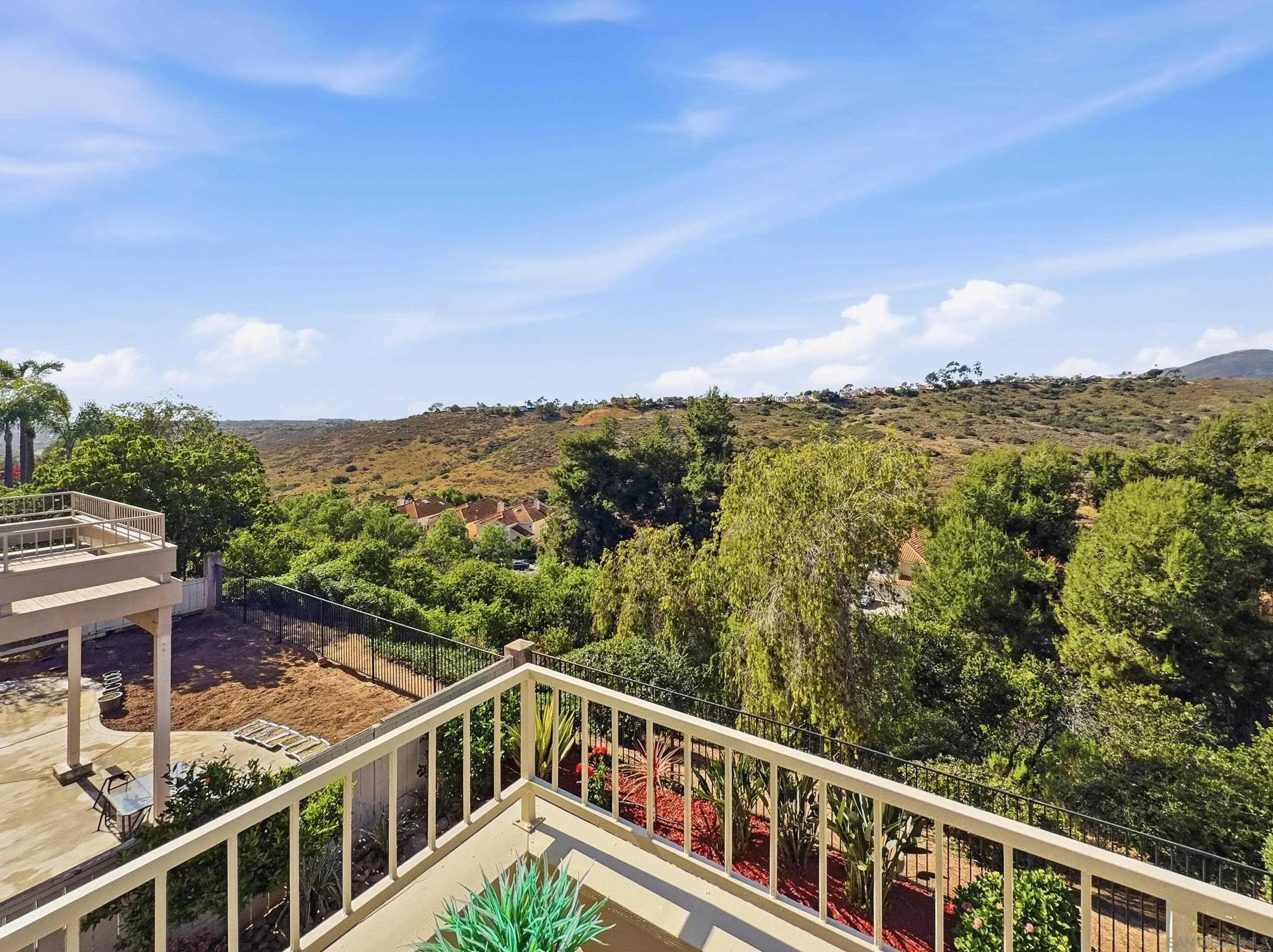 Beautifully maintained 4-bedroom, 2.5-bath home in the highly desirable Rancho Peñasquitos community, nestled within the Woodcrest Hill neighborhood. This light-filled residence features soaring vaulted ceilings, an open and airy floor plan, and a dual fireplace that adds warmth and charm to both living spaces. The remodeled kitchen offers granite countertops, dual dishwasher, wood flooring, a sunny eat-in dining area, and newer dual-pane windows that bring in abundant natural light. Numerous upgrades throughout the home include a newer furnace and AC system, replaced skylight, upgraded electrical panel, Tesla chargers, and a tankless water heater. Upstairs, the spacious primary suite boasts a private balcony with stunning canyon views and gentle breezes, along with dual closets and a luxurious en-suite bathroom featuring a separate tub and shower. The guest bathroom has also been thoughtfully renovated. Step outside to enjoy spectacular canyon views and low-maintenance turf landscaping!