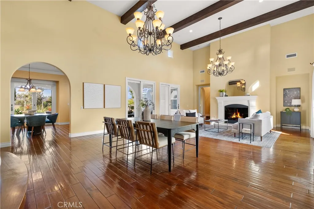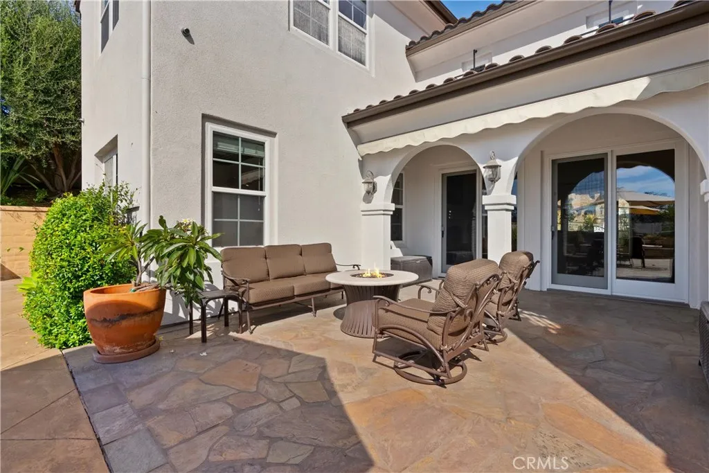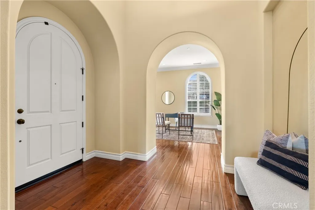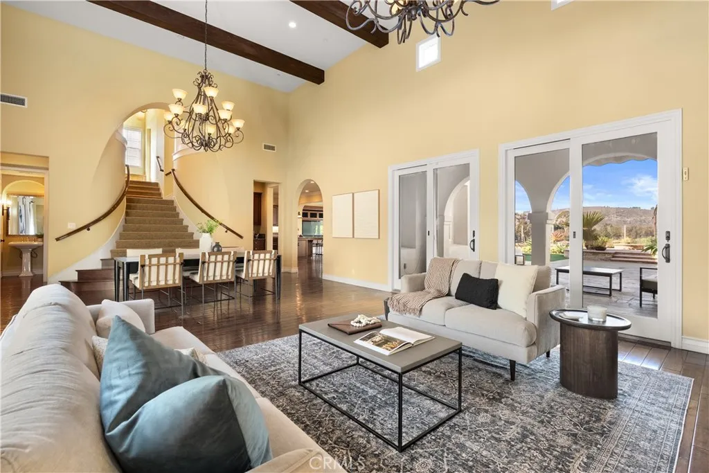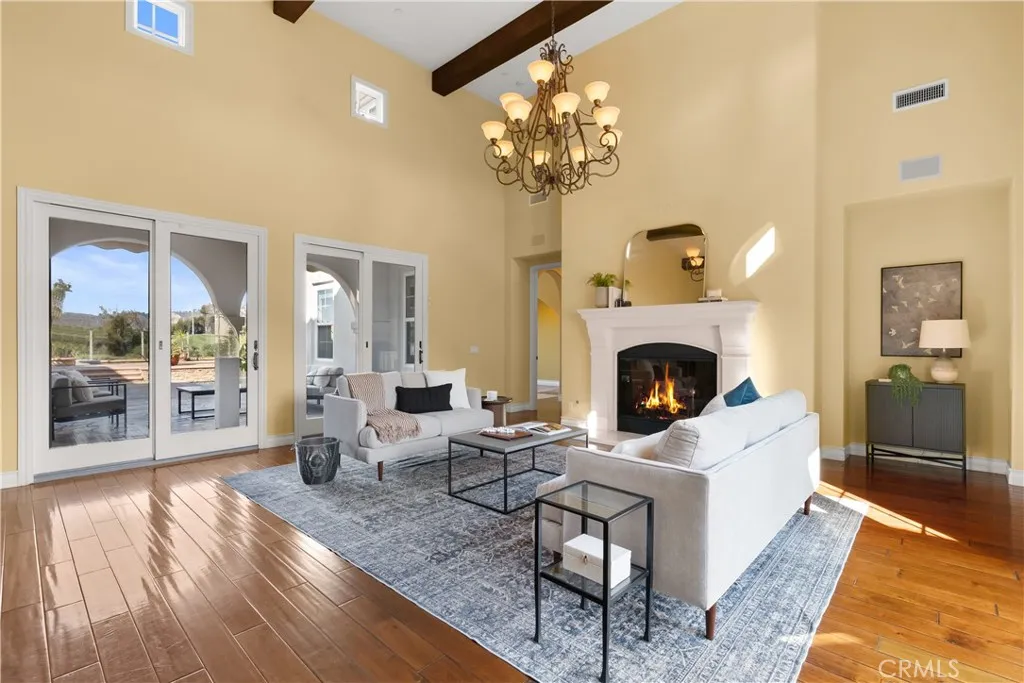 Blending timeless Spanish and Mediterranean influences, this residence is perched atop a ridge in the prestigious gated community of Rancho Madrina, showcasing panoramic views of the San Juan Capistrano hills, the historic Mission, and Marbella Golf Course. One of the communitys most sought-after floor plans, it features an oversized main-level primary suite thoughtfully positioned in its own private wing, with a versatile upstairs loft ideal for an office, gym, or lounge. A gated front courtyard framed by manicured landscaping sets the stage for refined craftsmanship throughout, where soaring beamed ceilings, a dramatic fireplace, glass doors, hardwood floors, crown molding, solid core doors, and custom built-ins define the great room and interior spaces. The gourmet kitchen boasts granite countertops, recently updated JennAir appliances, a beverage station, and spacious pantry, while the entertainers backyard offers a custom pool with waterfall features, spa, built-in BBQ, fire pit, and surround sound extending indoors and out. Additional highlights include a private office, dual-level laundry, upgraded HVAC, a 3-car tandem garage with epoxy flooring and garage doors replacement, epoxy-coated pipes, and freshly painted exteriorIdeally located near historic Downtown San Juan Capistrano, with easy access to Orange Countys beaches, parks, shopping, and major highways.