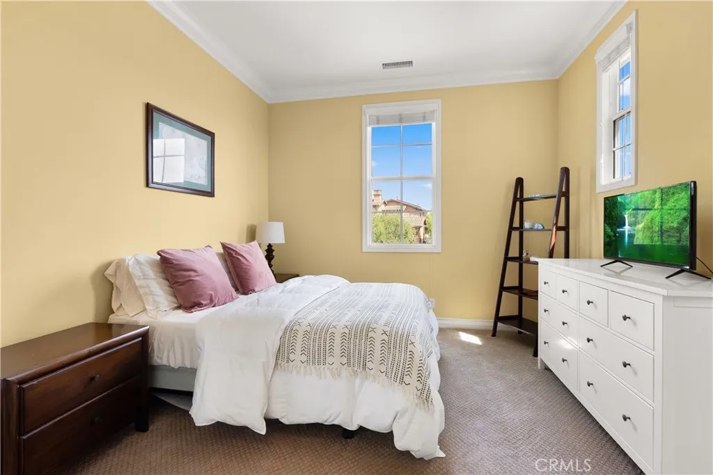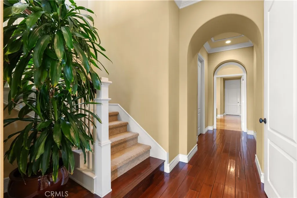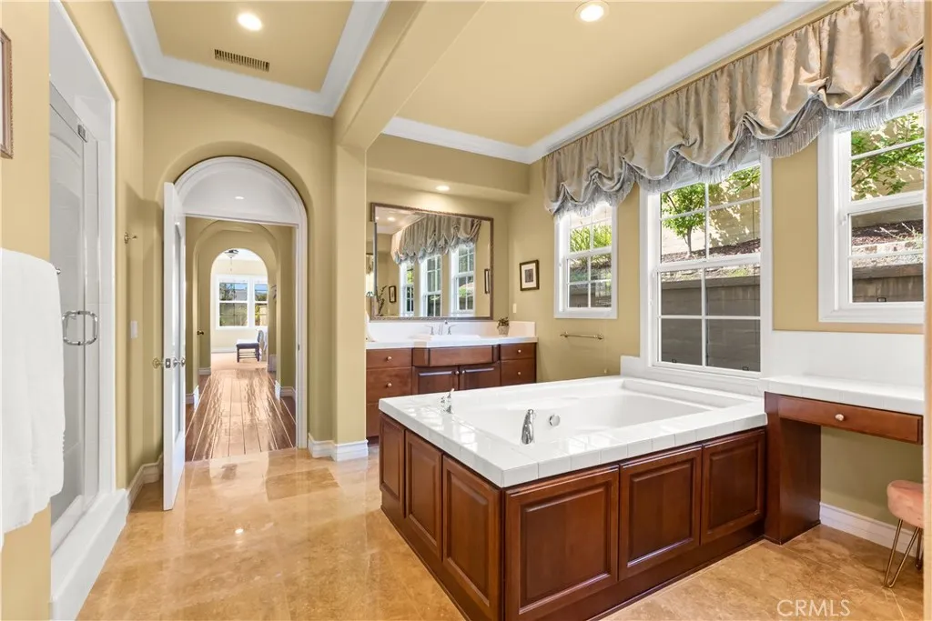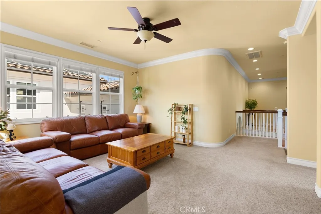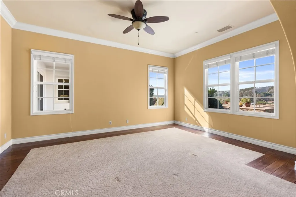 Blending timeless Spanish and Mediterranean influences, this residence is perched atop a ridge in the prestigious gated community of Rancho Madrina, showcasing panoramic views of the San Juan Capistrano hills, the historic Mission, and Marbella Golf Course. One of the communitys most sought-after floor plans, it features an oversized main-level primary suite thoughtfully positioned in its own private wing, with a versatile upstairs loft ideal for an office, gym, or lounge. A gated front courtyard framed by manicured landscaping sets the stage for refined craftsmanship throughout, where soaring beamed ceilings, a dramatic fireplace, glass doors, hardwood floors, crown molding, solid core doors, and custom built-ins define the great room and interior spaces. The gourmet kitchen boasts granite countertops, recently updated JennAir appliances, a beverage station, and spacious pantry, while the entertainers backyard offers a custom pool with waterfall features, spa, built-in BBQ, fire pit, and surround sound extending indoors and out. Additional highlights include a private office, dual-level laundry, upgraded HVAC, a 3-car tandem garage with epoxy flooring and garage doors replacement, epoxy-coated pipes, and freshly painted exteriorIdeally located near historic Downtown San Juan Capistrano, with easy access to Orange Countys beaches, parks, shopping, and major highways.