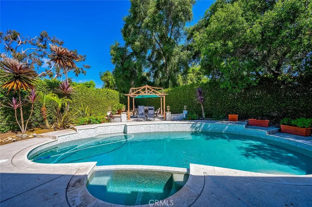 Welcome home to resort style living! This home is beautiful inside and out. Starting with such an incredible location. At the end of the cul de sac and back to Arroyo Park. You have a long private driveway with its own gate. As if the four car garage didnt provide enough parking, the area in front can easily park six more cars. The backyard has a beautiful pool and spa. Complete with gazebo, perfect for getting out of the sun wwhen relaxing by the pool. The mature landscaping provides tons of privacy, making you forget you are in the heart of Orange County. As you enter the home there is a large open Living room or Game room. It has vaulted ceilings,very light and open, with three french doors to a private courtyard area. There is also a downstairs bedroom with french doors to yet another private courtyard area that leads to the pool. The main floor full bathroom has a separate door to the pool area. Upstairs you will find two more bedrooms and a huge bonus room. The master bedroom has separate seating area, fireplace, and a private patio overlooking the resort like back yard and pool. The master bathroom has a soaking tub and sepaarate shower with multiple shower heads and dual vanities. The secondary bedroom are of good size as well. The bonus room at the end of the hall really completes this amazing home. With vaulted ceilings, lots of windows, complete with wet bar. This home truly has it all. Come see for yourself, you won't be dissapointed!