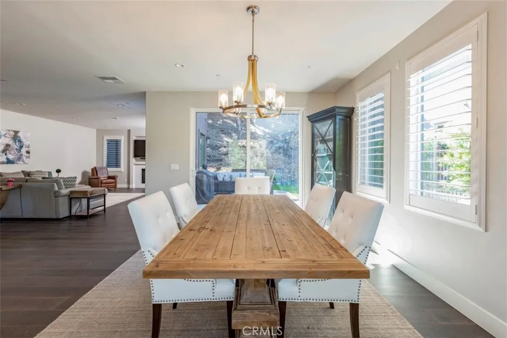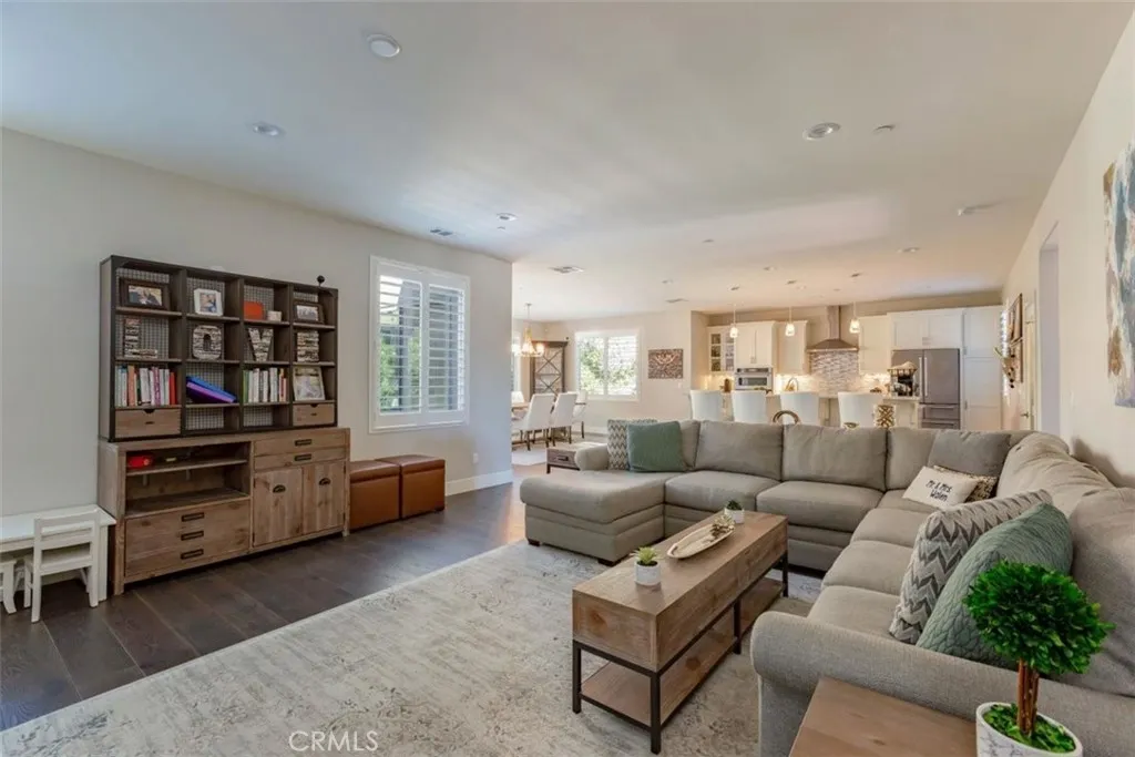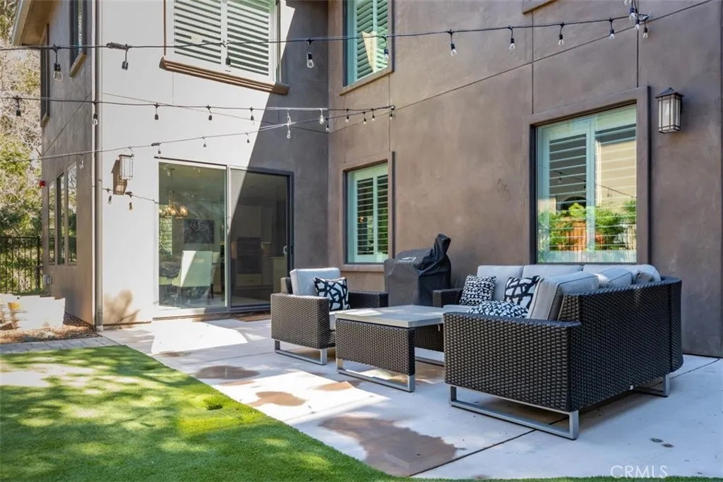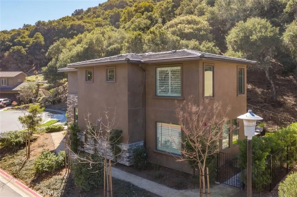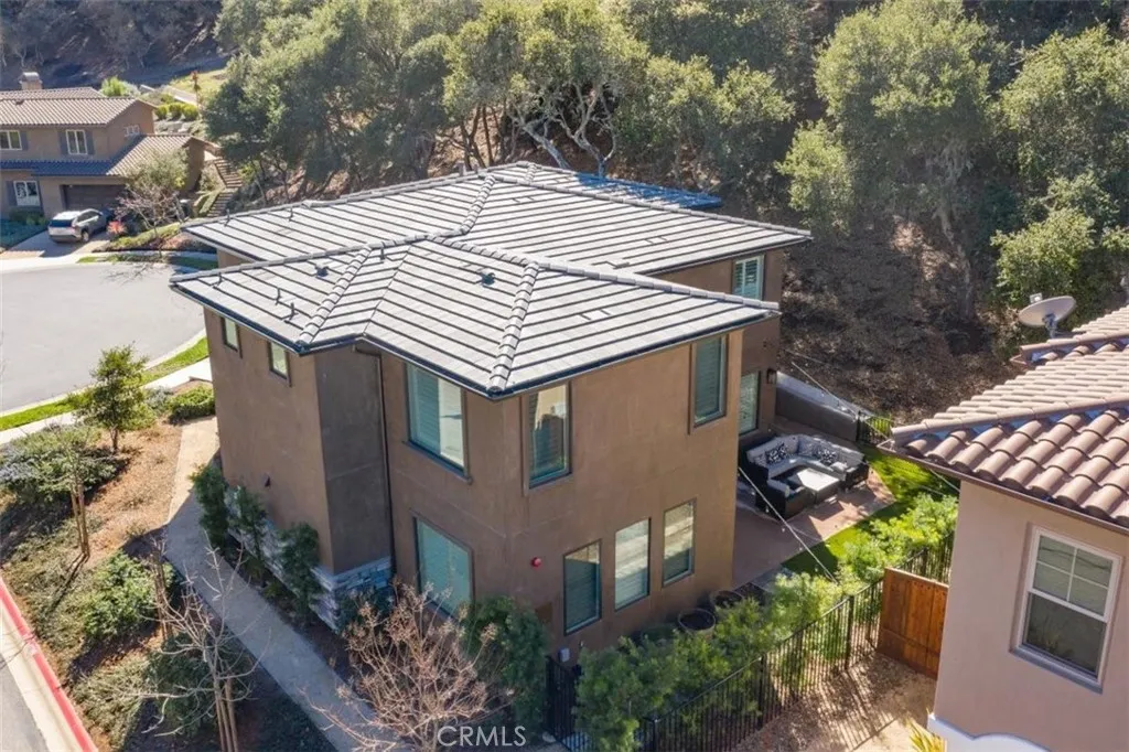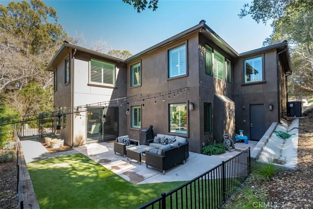 First time on the market exceptional opportunity in prestigious Prefumo Canyon Estates. This semi custom contemporary -inspired residence boasts remarkable curb appeal, with a grand double-door entry flanked by cypress trees and surrounded by mature, thoughtfully designed landscaping. The stone-accented stucco faade is timeless, while a spacious driveway and attached two-car garage with epoxy flooring provide both functionality and style. The meticulously maintained backyard is a private sanctuary bordered by a wrought iron fence and oak-studded Irish Hills with a paved patio, creating an inviting atmosphere for gatherings or quiet afternoons outdoors. Inside the bright and airy interior is filled with natural light. The main living space features interior shutters, recessed lighting, and an electric fireplace with a built-in nicheideal for displaying artwork or mounting a television. The open-concept layout seamlessly connects the living area to the gourmet kitchen, where a generous island with seating, abundant storage, and a dual-basin sink serves as the heart of the home. Pendant lighting, a decorative tile backsplash, and shaker-style cabinetry elevate the design, while premium stainless steel appliancesdouble oven, gas range with hood, refrigerator, beverage center, and dishwasherprovide exceptional culinary capability. The adjacent dining area looks out over the landscaped backyard, offering a peaceful backdrop for everyday meals and special occasions. A stylish half bath completes the lower level. Upstairs, a spacious bonus room and a dedicated office with custom ca