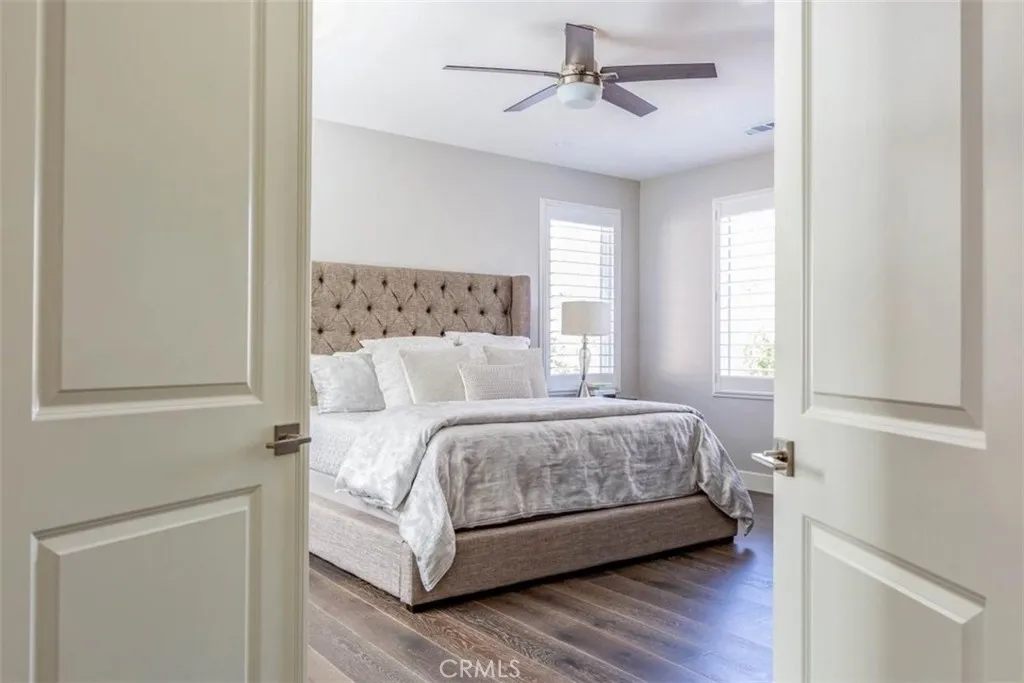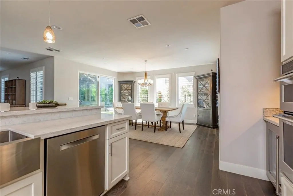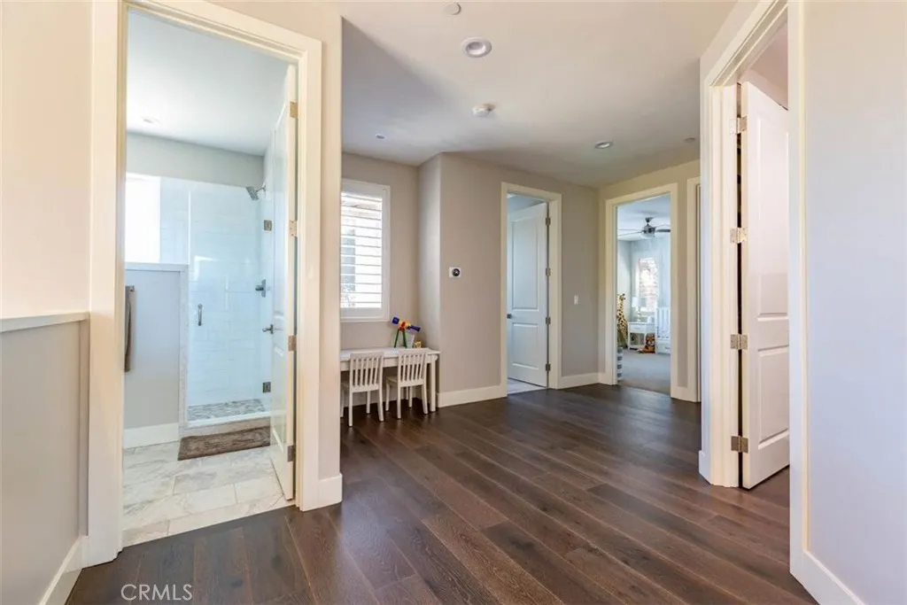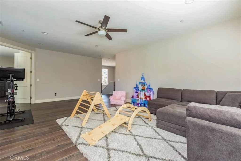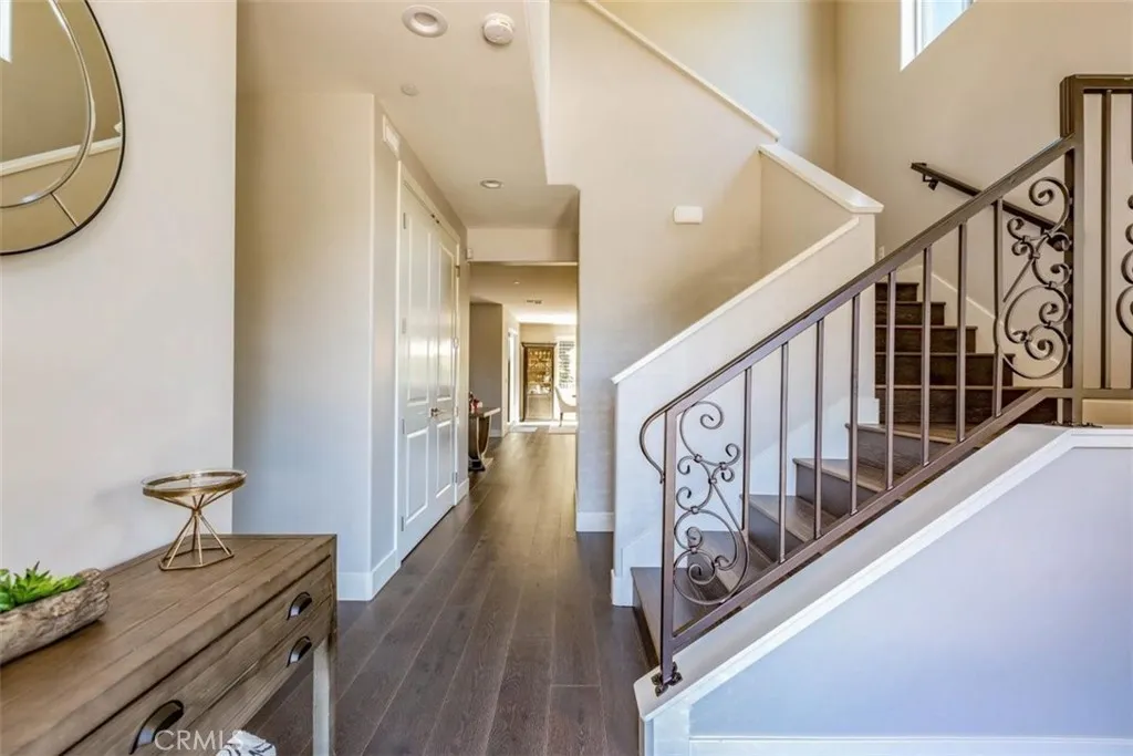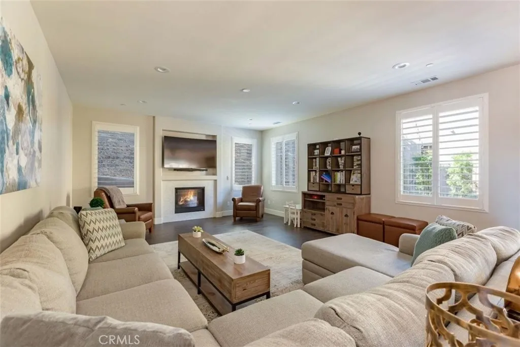 First time on the market exceptional opportunity in prestigious Prefumo Canyon Estates. This semi custom contemporary -inspired residence boasts remarkable curb appeal, with a grand double-door entry flanked by cypress trees and surrounded by mature, thoughtfully designed landscaping. The stone-accented stucco faade is timeless, while a spacious driveway and attached two-car garage with epoxy flooring provide both functionality and style. The meticulously maintained backyard is a private sanctuary bordered by a wrought iron fence and oak-studded Irish Hills with a paved patio, creating an inviting atmosphere for gatherings or quiet afternoons outdoors. Inside the bright and airy interior is filled with natural light. The main living space features interior shutters, recessed lighting, and an electric fireplace with a built-in nicheideal for displaying artwork or mounting a television. The open-concept layout seamlessly connects the living area to the gourmet kitchen, where a generous island with seating, abundant storage, and a dual-basin sink serves as the heart of the home. Pendant lighting, a decorative tile backsplash, and shaker-style cabinetry elevate the design, while premium stainless steel appliancesdouble oven, gas range with hood, refrigerator, beverage center, and dishwasherprovide exceptional culinary capability. The adjacent dining area looks out over the landscaped backyard, offering a peaceful backdrop for everyday meals and special occasions. A stylish half bath completes the lower level. Upstairs, a spacious bonus room and a dedicated office with custom ca