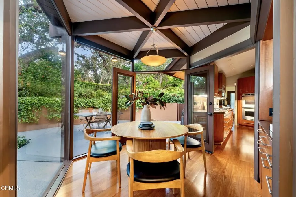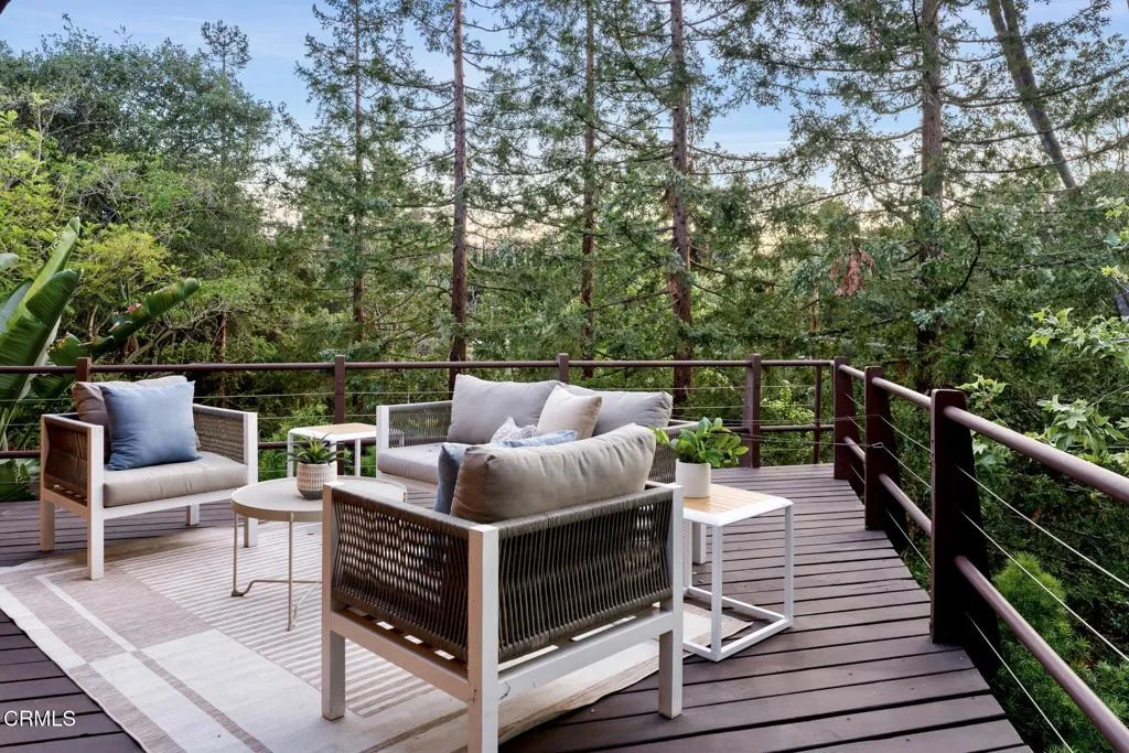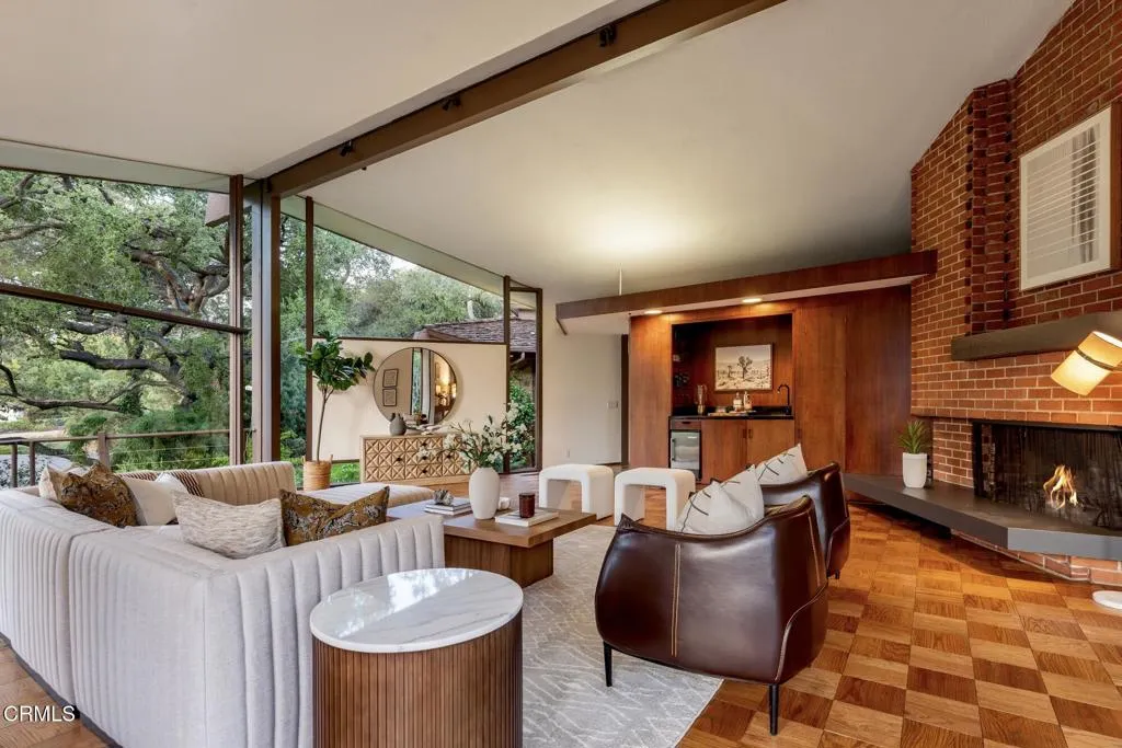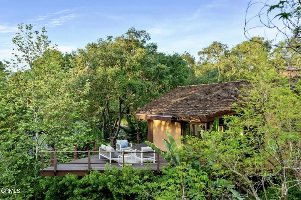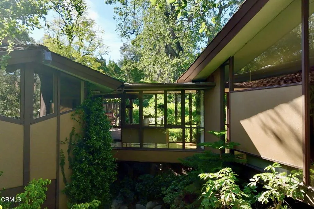 Tucked amid the treetops of Lacy Estates, this iconic 1953 Mid-century Modern home, designed by acclaimed architect Whitney R. Smith, AIA, is a masterclass in streamlined, organic shapes and indoor/outdoor integration. Situated on nearly an acre, the private, gated compound offers an enchanting escape with walls of floor-to-ceiling glass, framing a sweeping panorama toward the San Gabriel mountains. The private retreat boasts 3,768 square feet of refined living space, including 4 bedrooms, an office, and 4 baths. The dramatic living room with a 14 foot high ceiling features access to a wraparound wood deck, brick fireplace and an elegant wet bar ideal for crafting the perfect martini. The gourmet kitchen is a modernist's dream, updated with high-end stainless steel appliances and treetop vistas, while the adjacent light-filled breakfast area showcases the front courtyard. Practicality is discreetly handled with a separate laundry area off the kitchen, featuring ample counter space and a sink. The fourth bedroom and bathroom, ideal for guests, is adjacent to the laundry area. The main living area is separated from the private bedrooms by a glass-enclosed hallway - a cinematic bridge rising over a flowing babbling brook and stone-encased pond. The primary suite features a generous 300 sq ft walk-in closet and an ensuite full bathroom bathed in natural light from the geometric skylights above. There are two adjacent bedrooms and baths plus a private cozy office. Outside, the lush, spectacular landscaping features mature oak trees, expansive decks for entertaining, and a unique