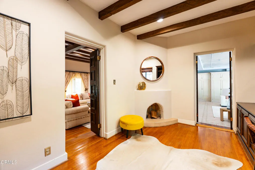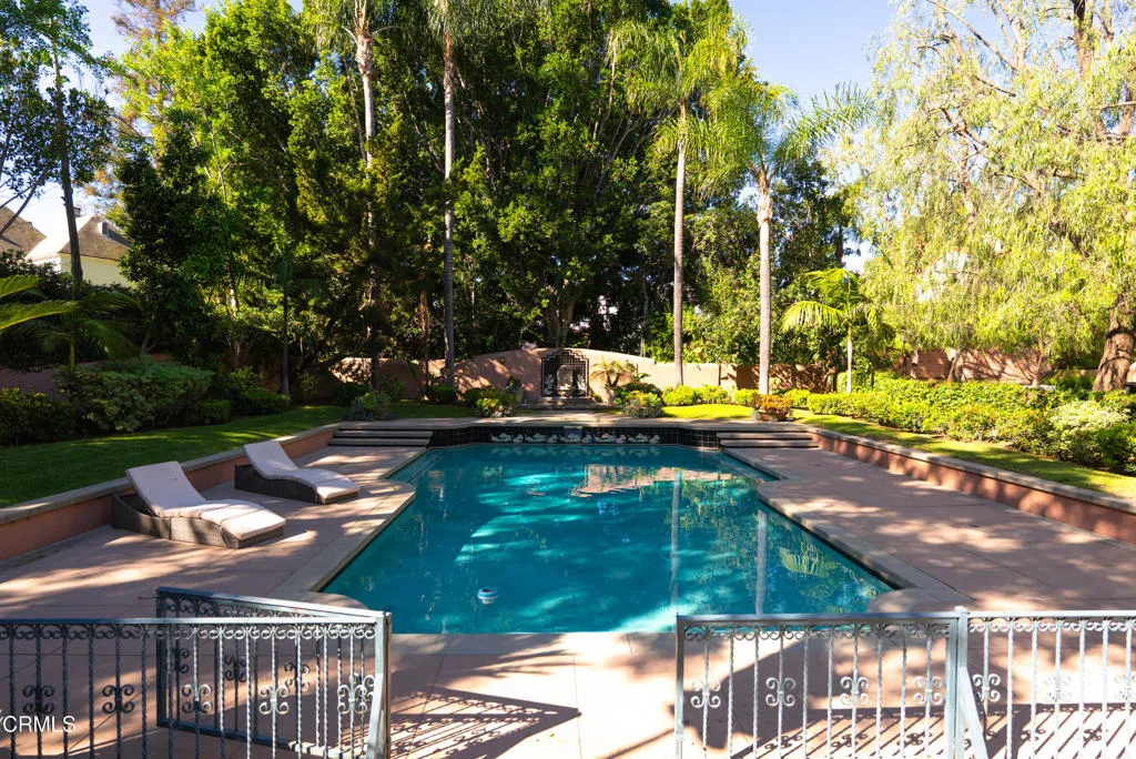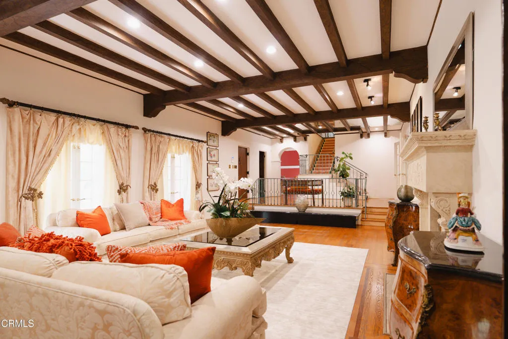Along one of San Marino's most distinguished streets, discreetly set behind a gated entry and a long, tree-lined driveway, lies a residence of quiet significance where architectural pedigree meets timeless design.Originally built in 1925 and designed by architect E. C. Morgan, the home reflects the enduring elegance of the Spanish Colonial Revival. Its stucco exterior, classic clay tile rooflines, and balanced proportions create a welcoming first impression. Exterior details including a green-painted wrought iron domed arch and railings adding depth and old-world romance charm.The nearly one-acre grounds are beautifully composed with mature trees, open lawns, and inviting poolside spaces create an outdoor setting equally suited for quiet mornings or relaxed gatherings.This home is rich with warmth and character. Beamed ceilings, elegant arches, and preserved architectural details create an atmosphere that feels inviting and enduring. The living room, anchored by a fireplace. The primary suite is a romantic retreat, featuring stained glass at the bedroom entry, a fireplace, a generous walk-in closet, and a distinctive en-suite bath. An arched stained glass mosaic window beside the soaking tub filters light beautifully, creating a serene, spa-like experience.Additional rooms throughout the home offer generous proportions for variety of uses. A finished basement adds versatile space for recreation, media, or work. A guest house above the garage offers privacy and independence for visitors or extended stays.Blending European influence with California ease, this Virginia Road es