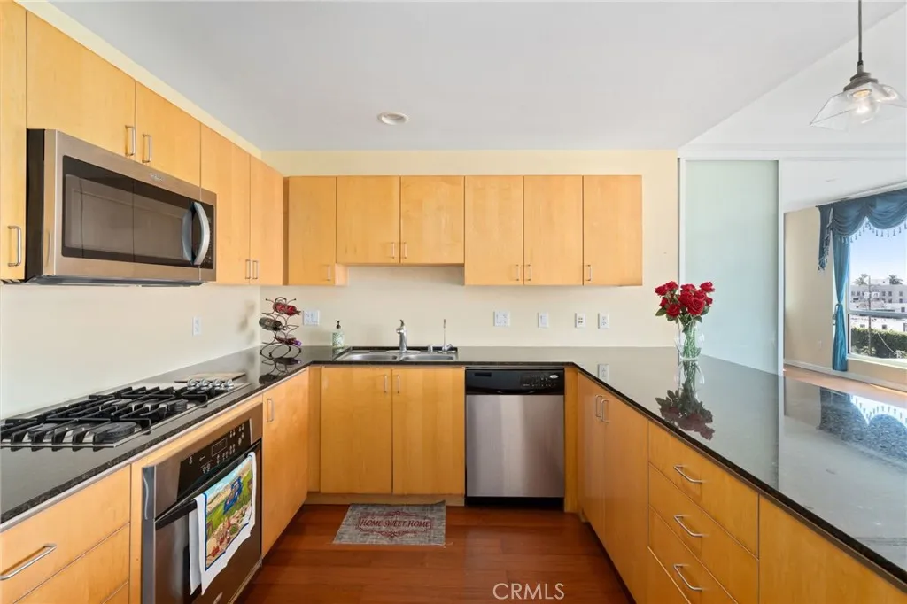 DAY VIEWS, NIGHT VIEWS & WATERFRONT VIEWS! PRICED TO SELL FAST & MOVE-IN READY! Welcome to Unit #527 a clean, sophisticated TOP FLOOR (no neighbor above)/CORNER (no neighbor to the north) Condo featuring breathtaking panoramic views of the ocean, waterfront, Port of L.A., city skylines, rooftops & San Pedro Hills, WHICH SETS THIS APART FROM OTHER CONDOS. These stunning vistas create a sense of serenity and tranquility the moment you enter either day or nighttime. This unit is located in CENTRAL SAN PEDRO, 1&1/2 blocks walking distance to the PORT. The cosmopolitan 2-bdrm, 2-full-bathroom unit boasts 3-large ceiling to floor windows that invite in abundant natural light and refreshing ocean breezes. One bedroom includes a cat door for pet convenience, and both bedrooms offer walk-in closets with built-in shelving and rods for ample storage. An obscure-glass sliding door separates one of the bedrooms from the living/family area for added privacy. The gourmet kitchen is equipped with dark granite countertops, clean wood cabinetry, a gas stove ideal for gourmet cooking, a new built-in microwave, dishwasher, refrigerator/freezer, pull-out faucet hose, and washer & dryer. Beautiful laminate flooring throughout enhances the modern feel of the space. Additional features include central A/C and heating, a laundry room, a coat/broom closet and fire sprinklers. A 2nd building entrance is located next to this unit via locked-door stairway, which exits to the garage for easy entry to and from the outside (ideal for owners with a pet). HOA amenities include: water; trash; (2) secured, d