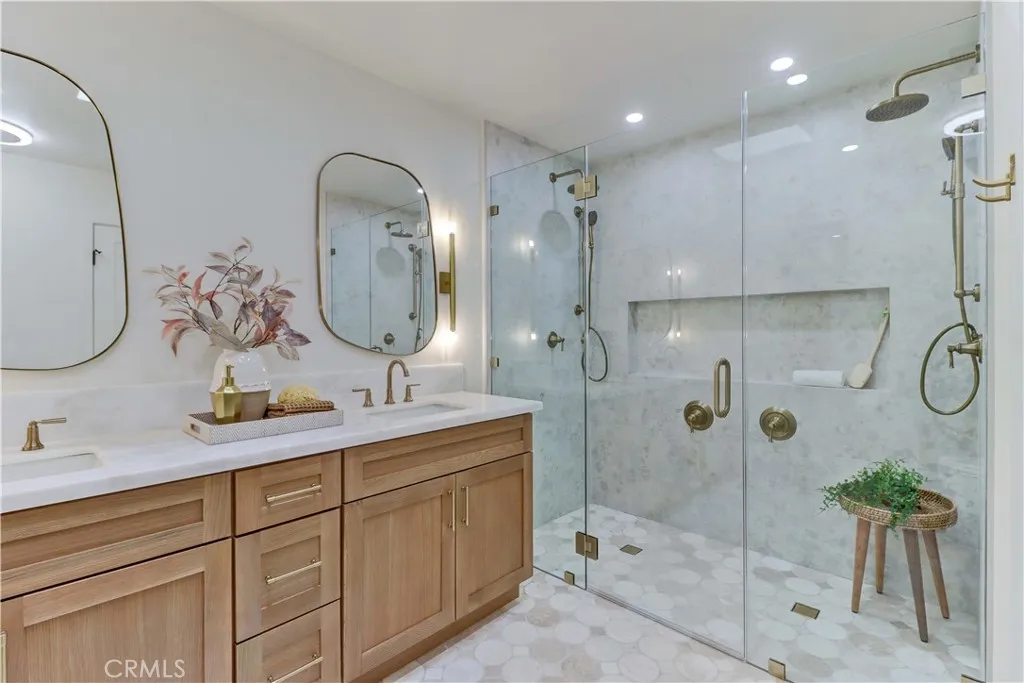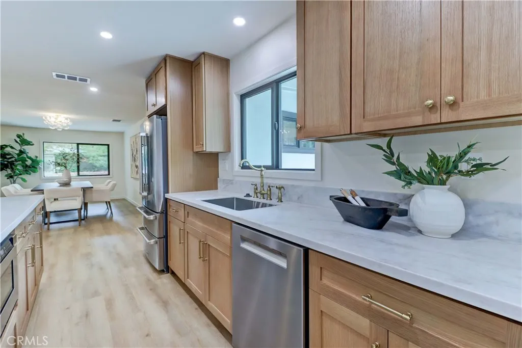 Searching for a single-story modern masterpiece tucked away amid the gentle slopes of North Tustin? This fully renovated 5-bedroom, 3-bath residence in the prestigious Cowan Heights neighborhood blends architectural elegance with everyday functionality on a private 0.37-acre lot, surrounded by mature trees and hillside serenity! From the moment you arrive, many sleek black-framed dual-pane windows and a custom metal pivot door set the tone for the design-forward touches that continue throughout the home. A striking stone archway and chandelier welcome you into an open floor plan filled with natural light from strategically placed skylights. Smooth drywall, soothing neutral hues, luxury vinyl flooring, and contemporary finishes create a clean, organic aesthetic that's both stylish and comfortable. The generous living room, centered around a sculptural bespoke plaster fireplace, flows effortlessly into a nearby dining alcove and kitchen ready for conversation and culinary endeavors. Cook with confidence using the French-inspired range beneath a handcrafted hood, surrounded by quartzite countertops, abundant cabinetry, stainless steel appliances, and a multi-seater island suitable for casual gatherings. A new mud room with a substantial pantry adds to the abode's many flexible spaces. Retreat to the primary bedroom with its patio access and spa-like ensuite featuring an oversized frameless shower with dual showerheads. A junior suite offers its own exterior entrance, pass-through bath, and a separate sitting areaideal for guests or multi-generational living. Every bath and clo