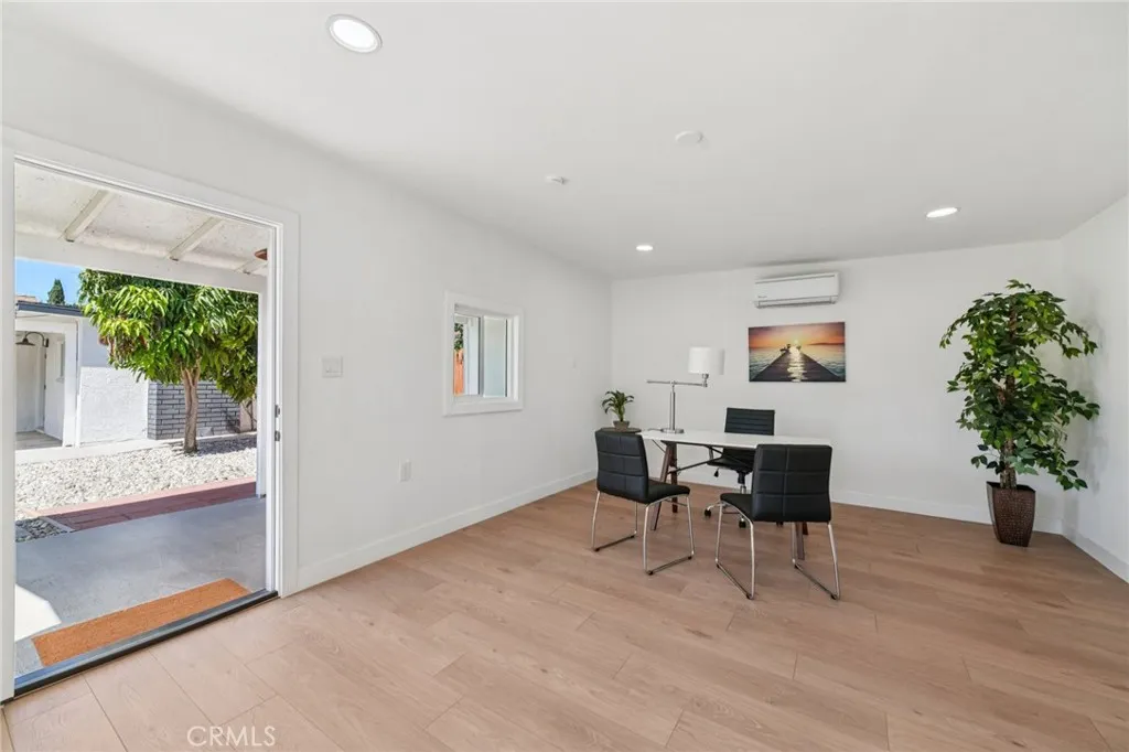 Beautifully Updated Home with a Detached Bonus Room in Prime Santa Ana. Welcome to this beautifully renovated single-story home that blends modern style with thoughtful, high-quality upgrades throughout. This 3-bedroom, 2-bathroom residence features an open-concept kitchen with quartz countertops, custom backsplash, and stainless steel appliances, complemented by dual-pane windows, waterproof laminate flooring, recessed lighting, and matte black fixtures. Both bathrooms are completely refreshed, with no detail overlooked, combining style and functionality. Major system upgrades provide peace of mind, including a brand-new roof, 200-amp electrical panel, central HVAC with new ducting, and a new gas line. Outdoor living is enhanced with a new covered patio, front and back concrete pavers, fresh landscaping with automated sprinklers, and new fencing on both sides of the property for added privacy. The finished garage includes drywall, epoxy flooring, a new garage door, and automatic opener. A detached bonus room with new siding, windows, roof, concrete, and a mini-split system provides versatile space for a home office, gym, or studio. Located near Riverview Golf Course and Santa Ana College, with quick access to local shops, restaurants, and more.