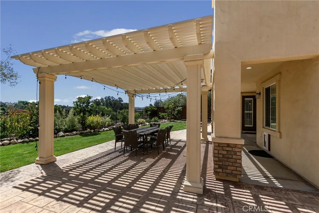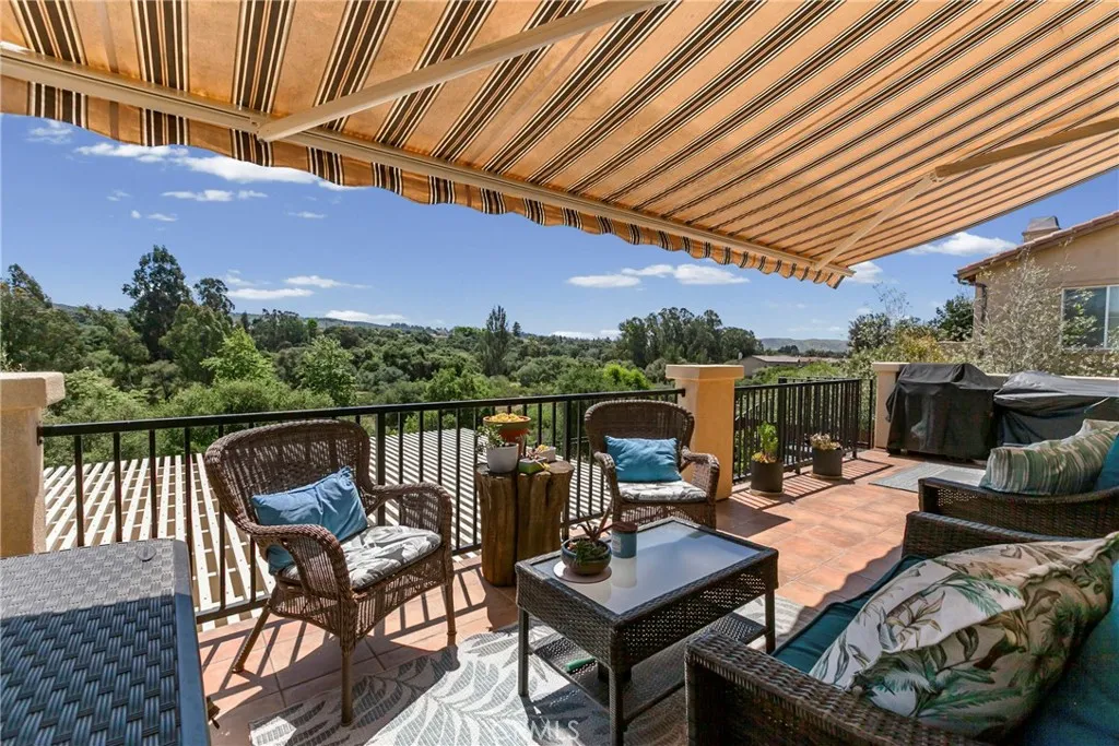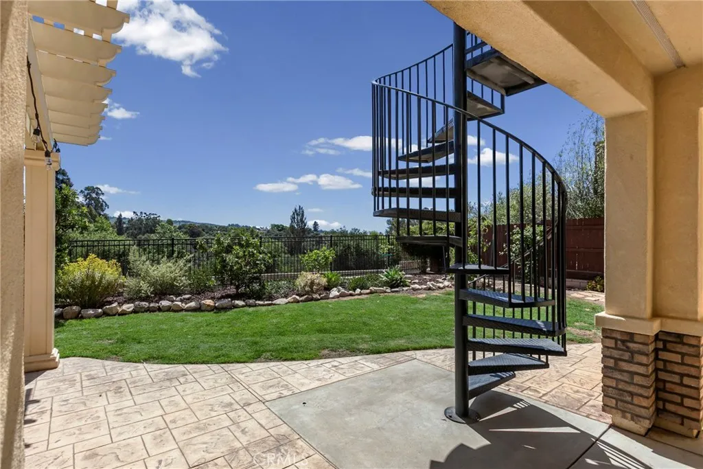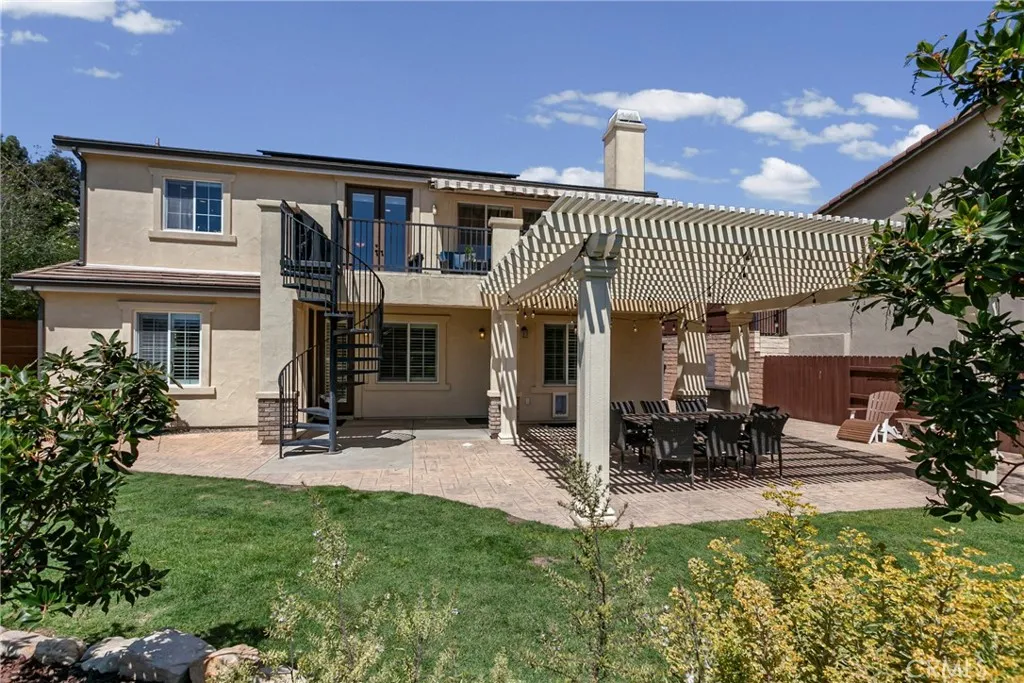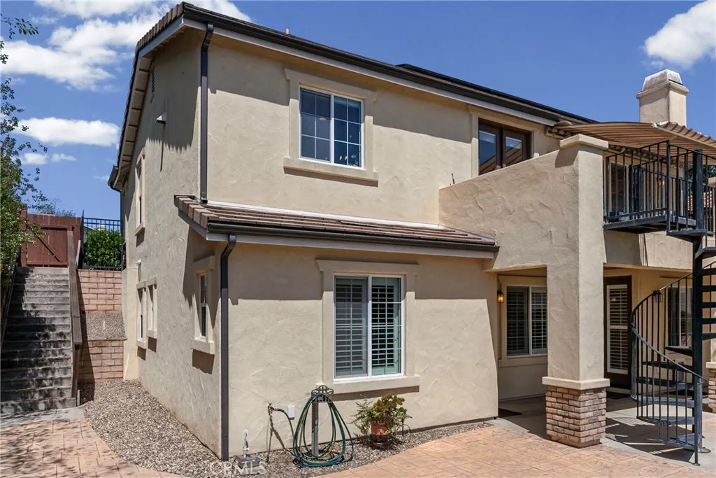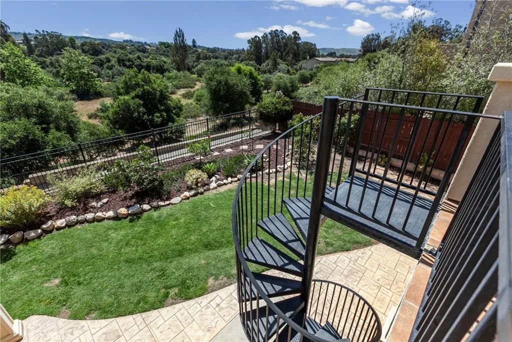 Welcome to this beautifully upgraded home located on a premium view lot with no rear neighbors, offering privacy and stunning open space views. This 3-bedroom, 2.5 bath home features approximately 2,396 sq ft of thoughtfully designed living space with an open-concept layout perfect for modern living. The interior showcases wide plank flooring, spacious living areas, and a well-appointed kitchen with ample cabinetry, granite countertops, and stainless steel appliances. Natural light pours in through large windows, creating a warm and inviting atmosphere throughout. Thoughtfully designed floor plan featuring an open-concept main level and a private upstairs layout with all bedrooms conveniently situated together. Each bedroom offers direct private access to outdoor space, creating a rare indoor-outdoor living experience. The primary suite includes a generous walk-in closet, and the home offers additional storage, including space beneath the staircase. Step outside to your private backyard retreat, complete with a covered pergola, expansive stamped concrete patio, and beautifully landscaped yard with avocado and citrus trees perfect for entertaining or relaxing while enjoying the peaceful surroundings. The elevated balcony and spiral staircase enhance an expansive stamped-concrete patio and an indoor-outdoor lifestyle. Additional features include a dedicated outdoor tool shed for extra storage or workspace, and energy-efficient living with fully PAID-OFF solar and 2 electric heaters. Dont miss this rare opportunity to own a home with a premium lot, exceptional outdoor living s