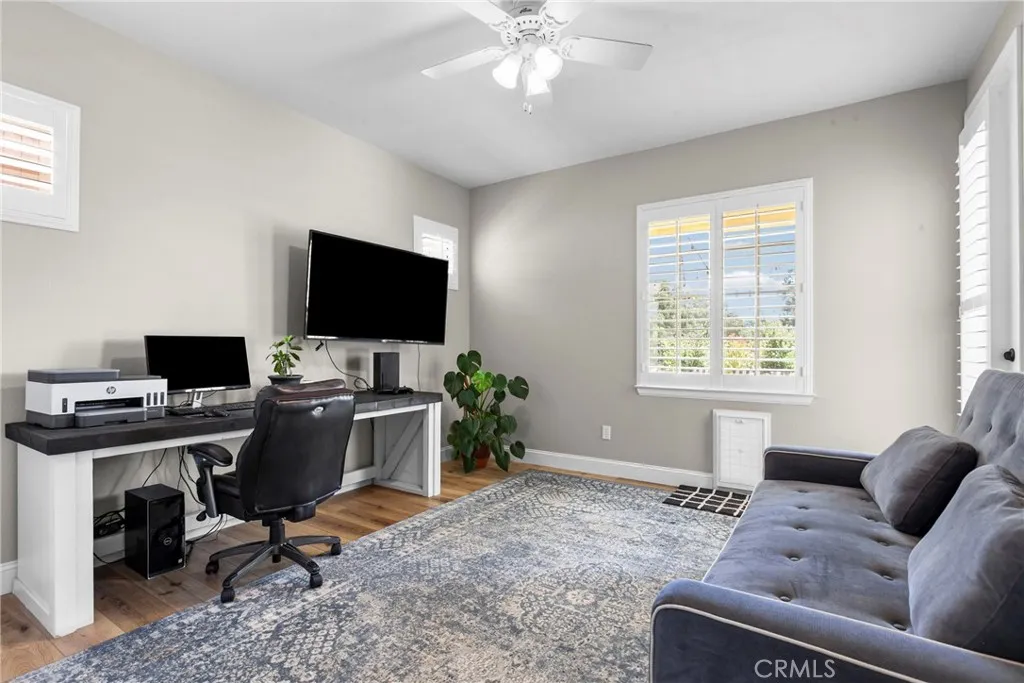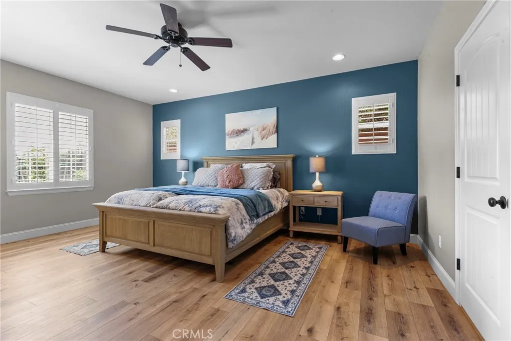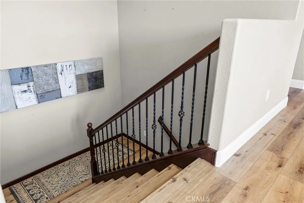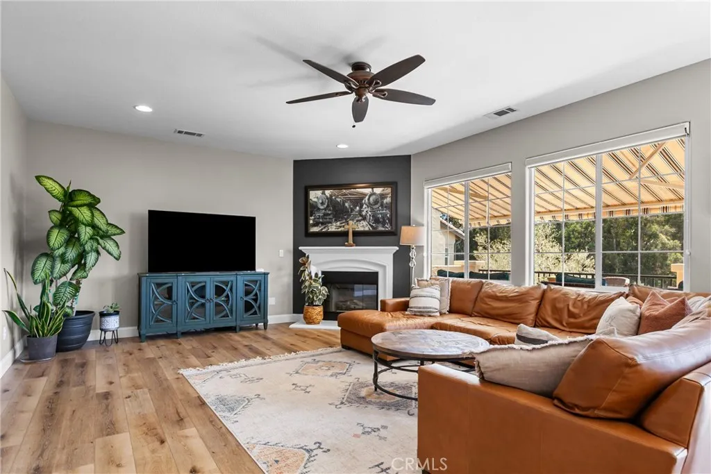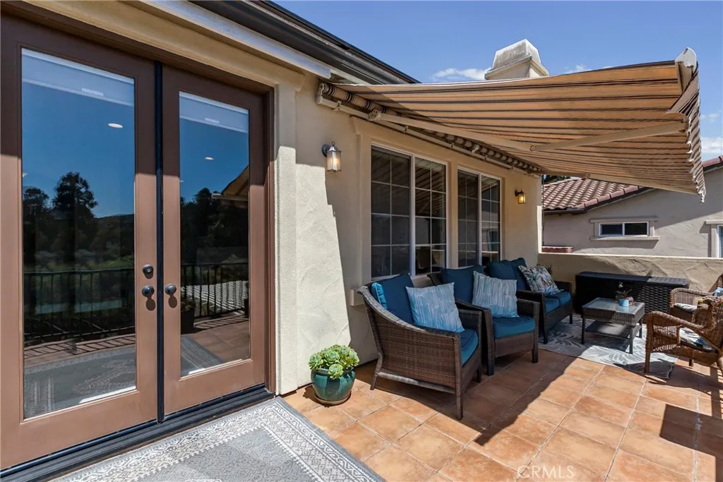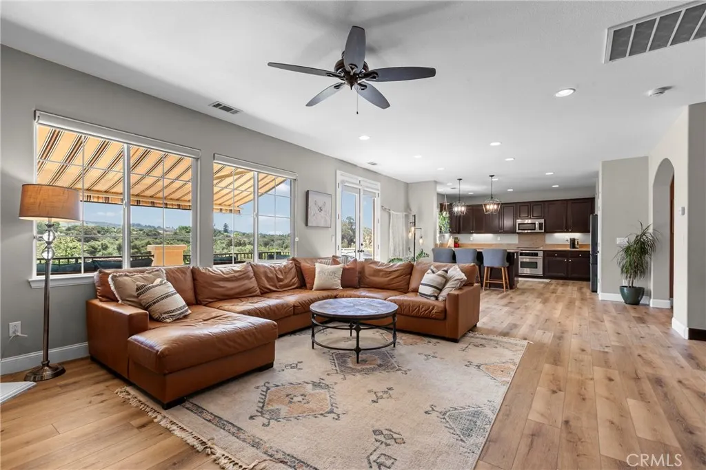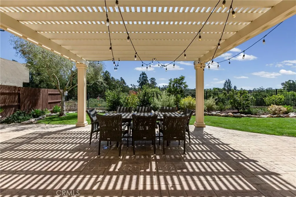 Welcome to this beautifully upgraded home located on a premium view lot with no rear neighbors, offering privacy and stunning open space views. This 3-bedroom, 2.5 bath home features approximately 2,396 sq ft of thoughtfully designed living space with an open-concept layout perfect for modern living. The interior showcases wide plank flooring, spacious living areas, and a well-appointed kitchen with ample cabinetry, granite countertops, and stainless steel appliances. Natural light pours in through large windows, creating a warm and inviting atmosphere throughout. Thoughtfully designed floor plan featuring an open-concept main level and a private upstairs layout with all bedrooms conveniently situated together. Each bedroom offers direct private access to outdoor space, creating a rare indoor-outdoor living experience. The primary suite includes a generous walk-in closet, and the home offers additional storage, including space beneath the staircase. Step outside to your private backyard retreat, complete with a covered pergola, expansive stamped concrete patio, and beautifully landscaped yard with avocado and citrus trees perfect for entertaining or relaxing while enjoying the peaceful surroundings. The elevated balcony and spiral staircase enhance an expansive stamped-concrete patio and an indoor-outdoor lifestyle. Additional features include a dedicated outdoor tool shed for extra storage or workspace, and energy-efficient living with fully PAID-OFF solar and 2 electric heaters. Dont miss this rare opportunity to own a home with a premium lot, exceptional outdoor living s