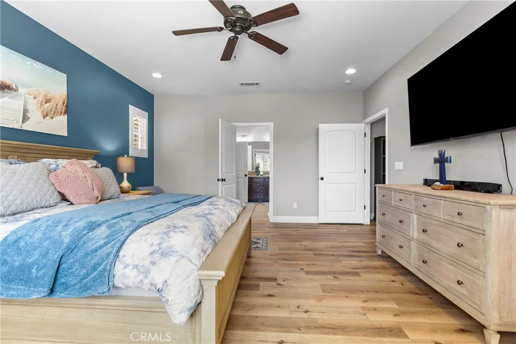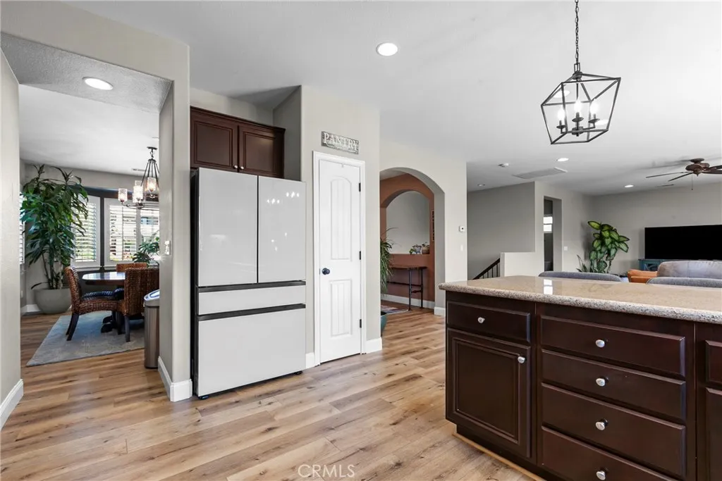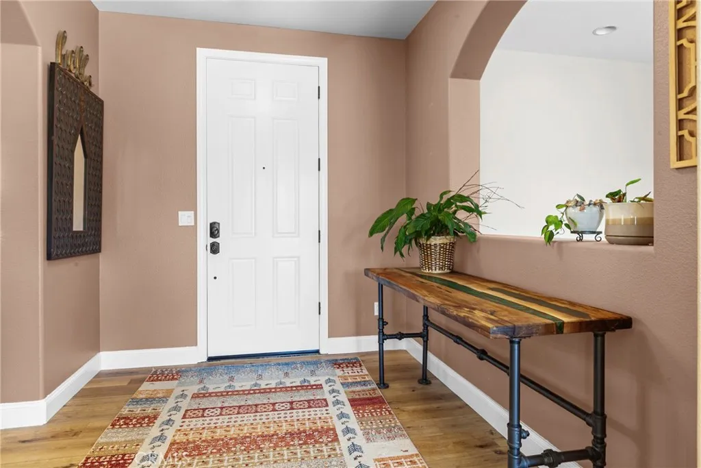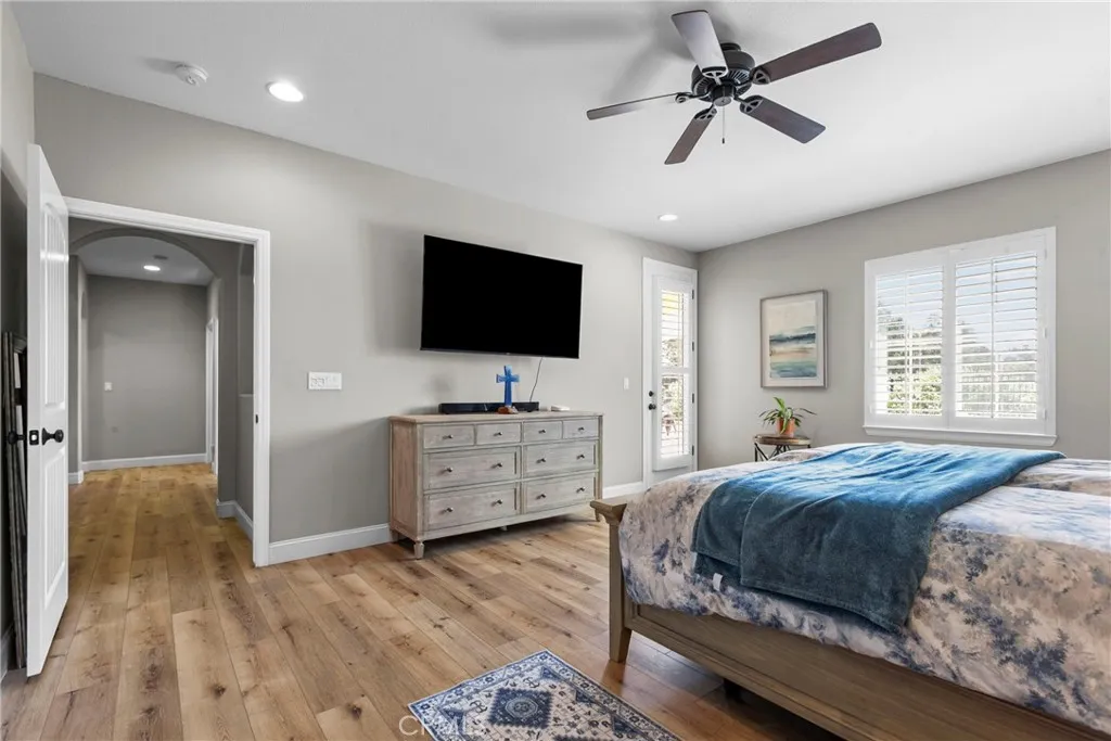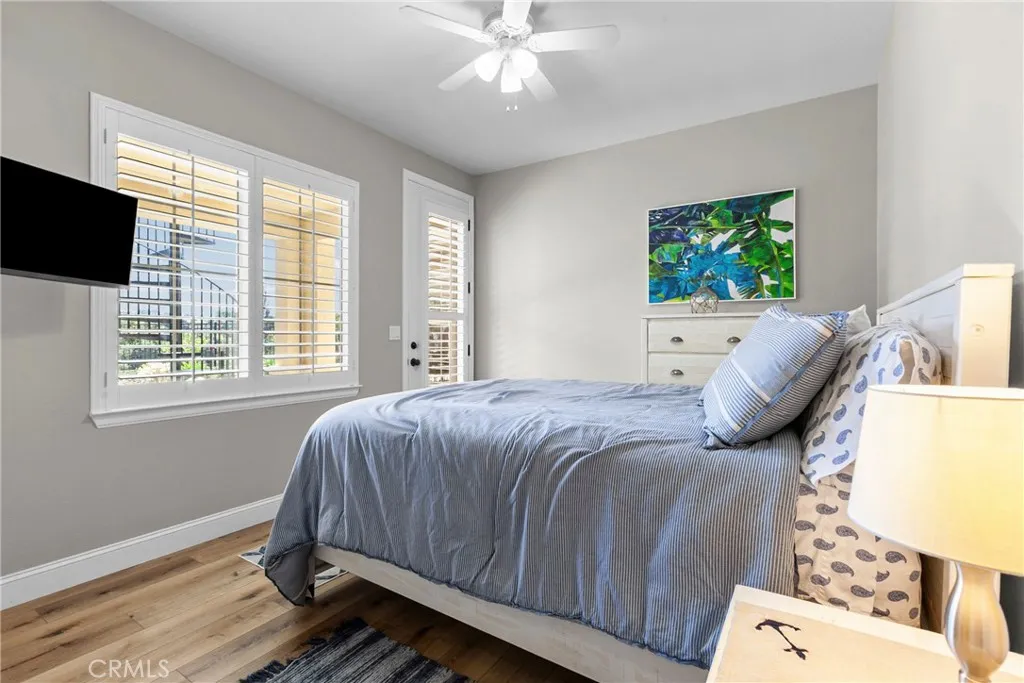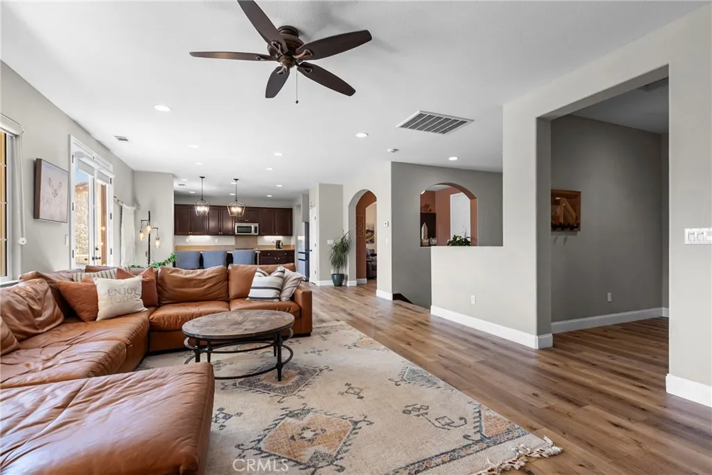 Welcome to this beautifully upgraded home located on a premium view lot with no rear neighbors, offering privacy and stunning open space views. This 3-bedroom, 2.5 bath home features approximately 2,396 sq ft of thoughtfully designed living space with an open-concept layout perfect for modern living. The interior showcases wide plank flooring, spacious living areas, and a well-appointed kitchen with ample cabinetry, granite countertops, and stainless steel appliances. Natural light pours in through large windows, creating a warm and inviting atmosphere throughout. Thoughtfully designed floor plan featuring an open-concept main level and a private upstairs layout with all bedrooms conveniently situated together. Each bedroom offers direct private access to outdoor space, creating a rare indoor-outdoor living experience. The primary suite includes a generous walk-in closet, and the home offers additional storage, including space beneath the staircase. Step outside to your private backyard retreat, complete with a covered pergola, expansive stamped concrete patio, and beautifully landscaped yard with avocado and citrus trees perfect for entertaining or relaxing while enjoying the peaceful surroundings. The elevated balcony and spiral staircase enhance an expansive stamped-concrete patio and an indoor-outdoor lifestyle. Additional features include a dedicated outdoor tool shed for extra storage or workspace, and energy-efficient living with fully PAID-OFF solar and 2 electric heaters. Dont miss this rare opportunity to own a home with a premium lot, exceptional outdoor living s