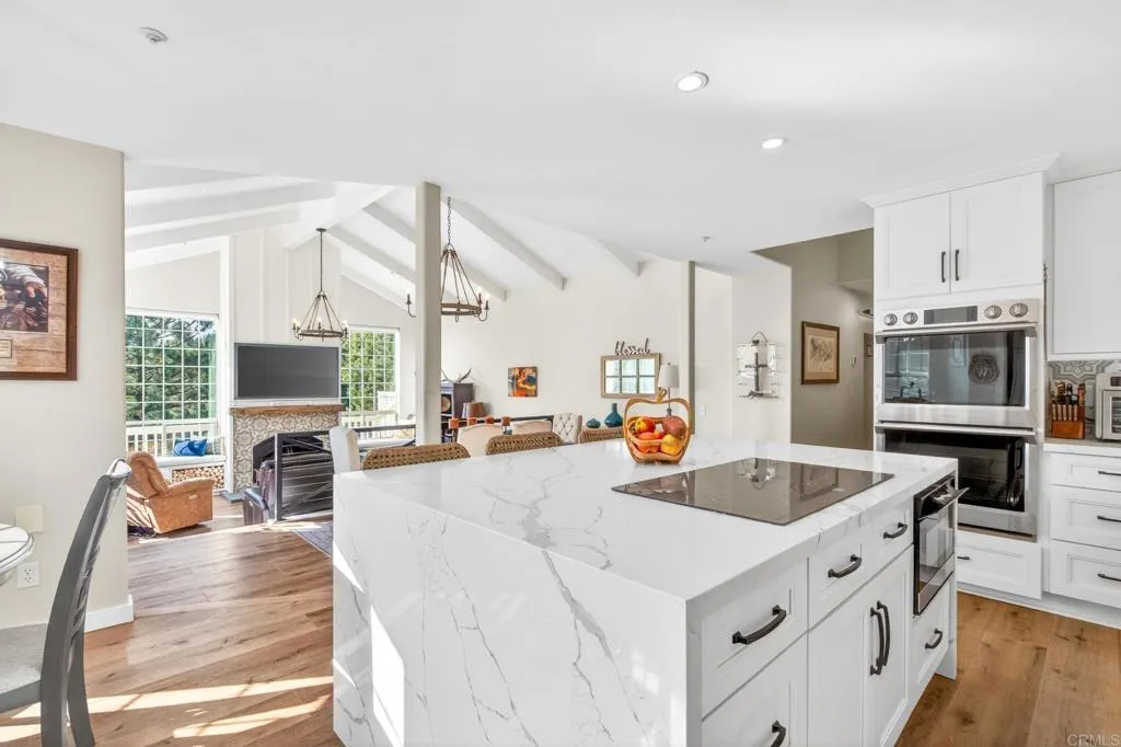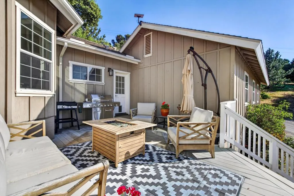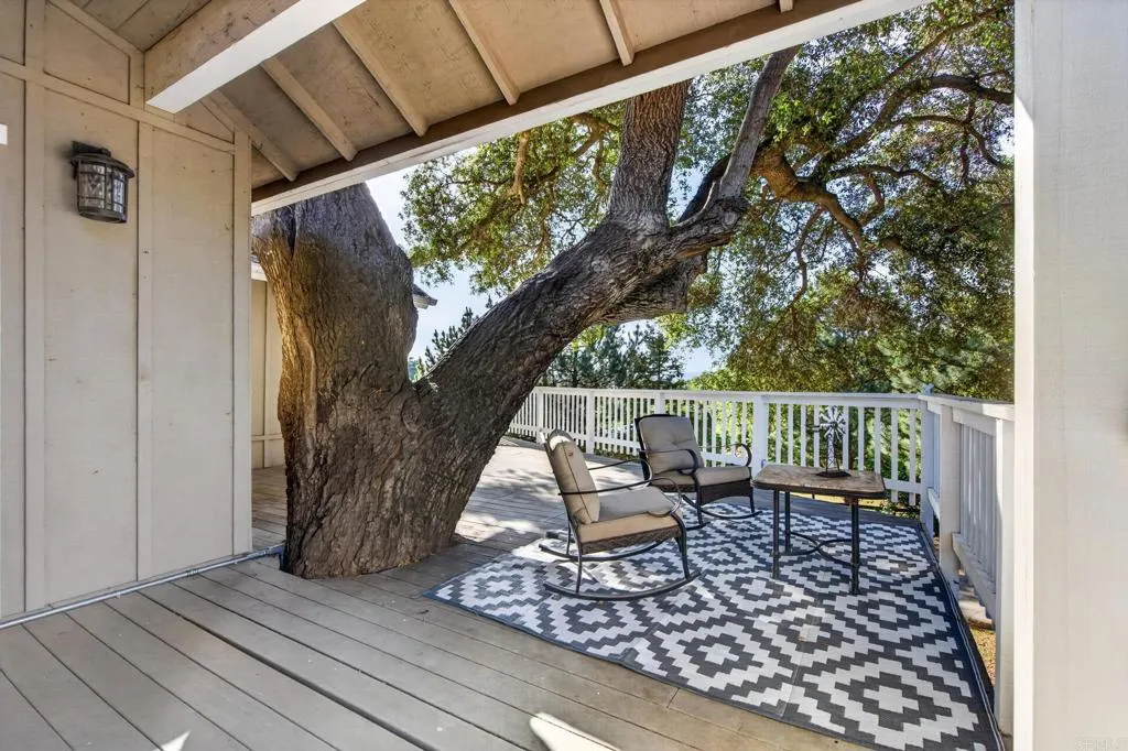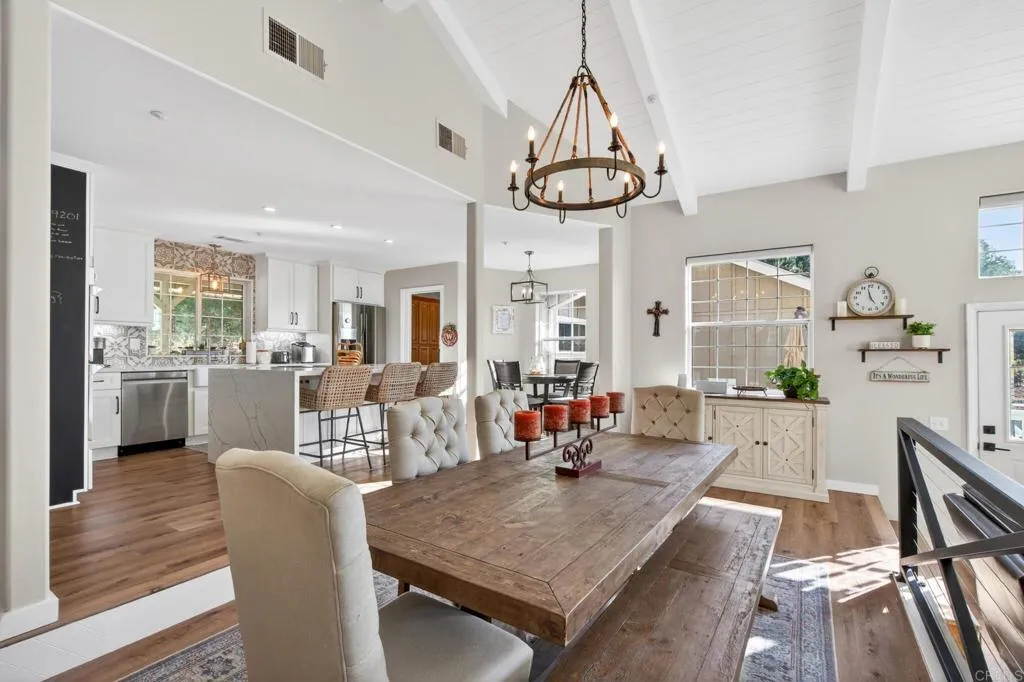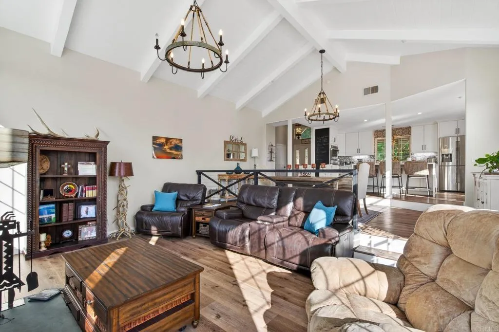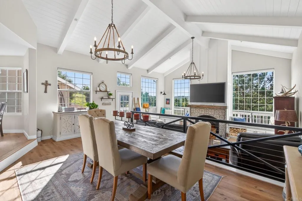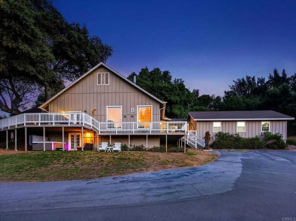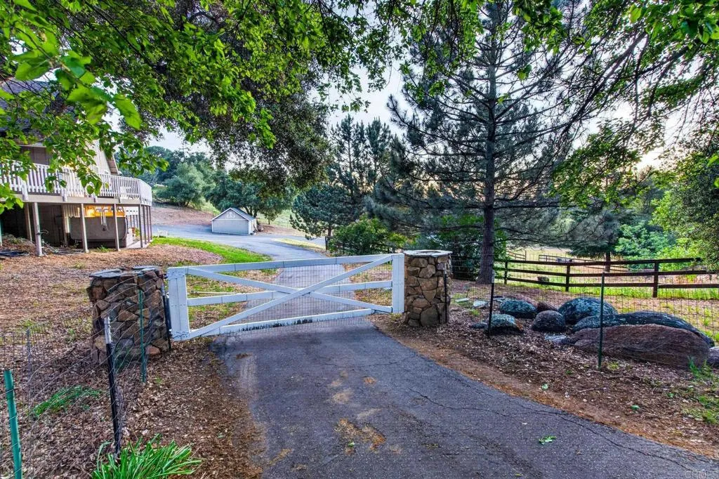 Nestled along a scenic corridor, Mesa Grande Villa presents a rare opportunity to experience the beauty, heritage, and lifestyle of one of San Diego Countys most treasured backcountry settings. ~A gated entry and gently winding drive welcome you into a private, fully fenced 8.15-acre estate where rolling terrain and mature oaks create a landscape that is both peaceful and inspiring. At the heart of the property is a thoughtfully remodeled 2,135 square foot ranch home featuring 3 bedrooms, an optional 4th bedroom or flexible space, and 2 1/2 baths. The home seamlessly blends modern farmhouse style with timeless character, where vaulted wood beam ceilings, adobe walls, numerous skylights, and expansive windows fill the interior with natural light while framing sweeping westerly views. The open floor plan is designed for both comfortable living and effortless entertaining, with many rooms opening directly to an expansive wraparound deck that extends the living space outdoors. ~The kitchen serves as a true centerpiece, featuring stainless steel appliances, an induction cooktop, farmhouse sink, and an oversized island with striking double waterfall edges. A Dutch door leads to a spacious laundry and utility room with ample counter space, sink, and storage, conveniently connecting to the attached three-car garage. The home is equipped with a comprehensive water system, including triple filtration with a carbon filter, as well as reverse osmosis drinking water in the kitchen. ~Living areas are anchored by a dramatic floor-to-ceiling stone fireplace enhanced with a catalytic conver