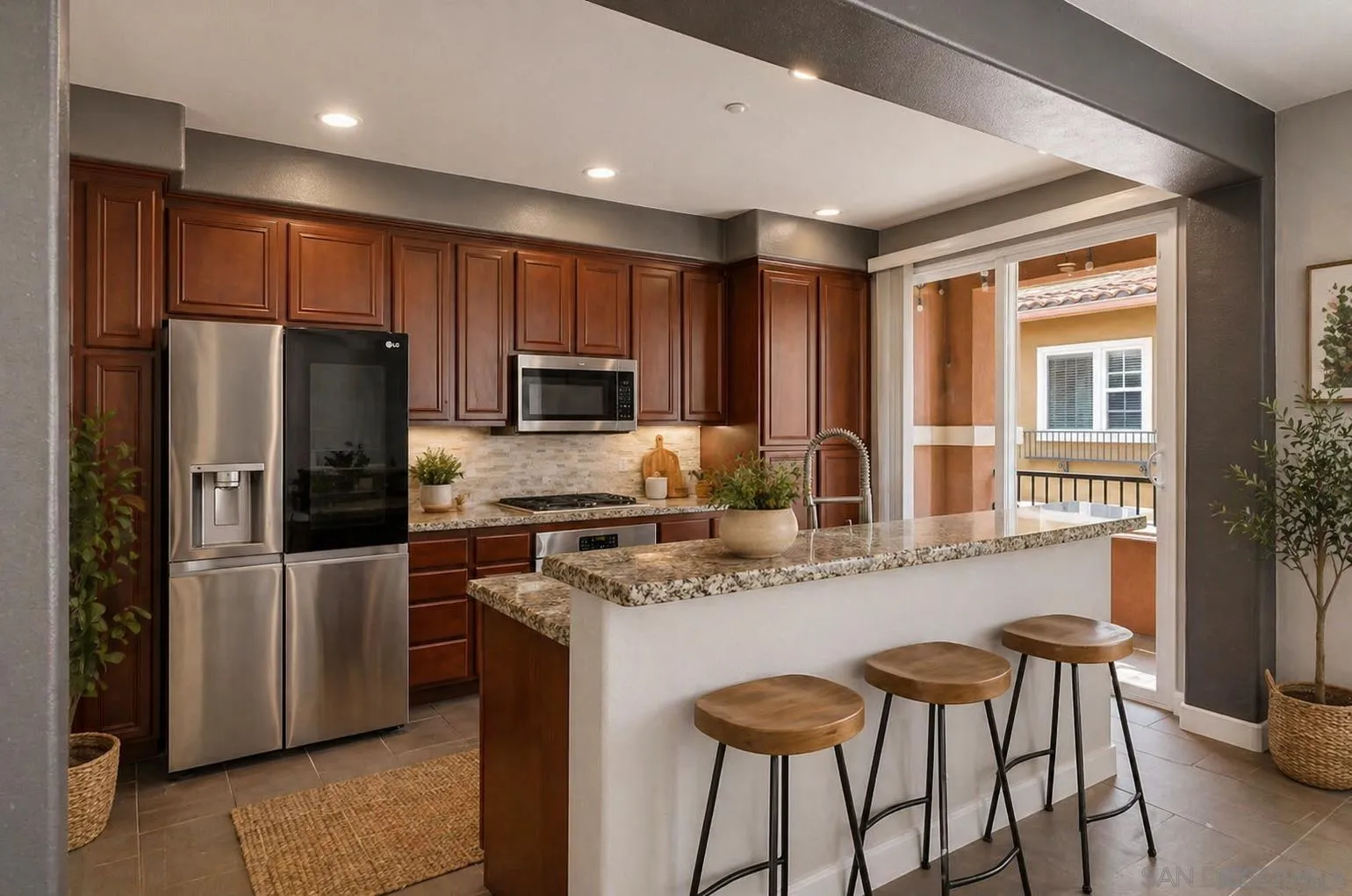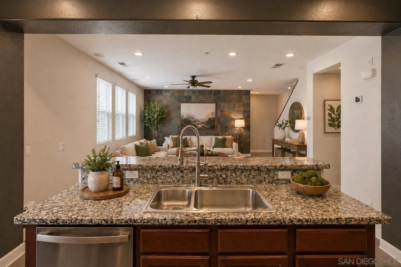 Experience luxury-style living in this pristine 3-story townhome located in the highly sought-after Treviso community of Santee! Thoughtfully situated with both lifestyle and investment potential in mind, this residence offers a highly desirable open floor plan with vaulted ceilings and built-in surround sound, creating a bright and elevated living experience. The property features dual primary suites, each with its own attached bathroom and walk-in closet—an ideal setup for maximizing rental income, roommate flexibility, or multi-generational living. The bathrooms are finished with a modern, spa-inspired touch, including LED mirrors and clean, contemporary design elements throughout. The home is turnkey and well-cared for, boasting a spacious 2-car garage and functional layout across all three levels. New Owners will enjoy immediate access to resort-style amenities, with the pool, spa, and recreation room just steps from the front door—enhancing both daily convenience and curb appeal. Positioned just seconds from Mission Trails and approximately one mile from major retail and daily essentials including Costco, Target, Starbucks, and more, the location supports strong, consistent rental demand. Combined with the community’s desirability and low-maintenance lifestyle, this property presents an excellent opportunity for both investors seeking solid returns and buyers looking for a move-in ready home in a high-demand area!