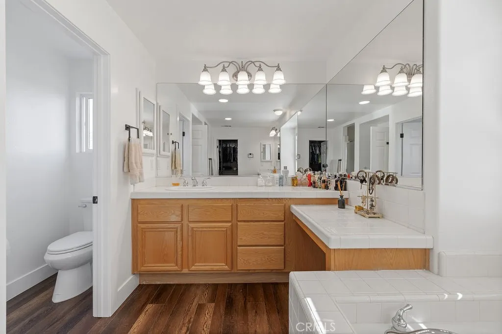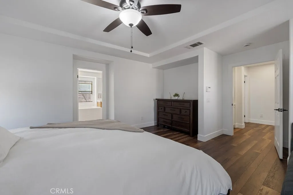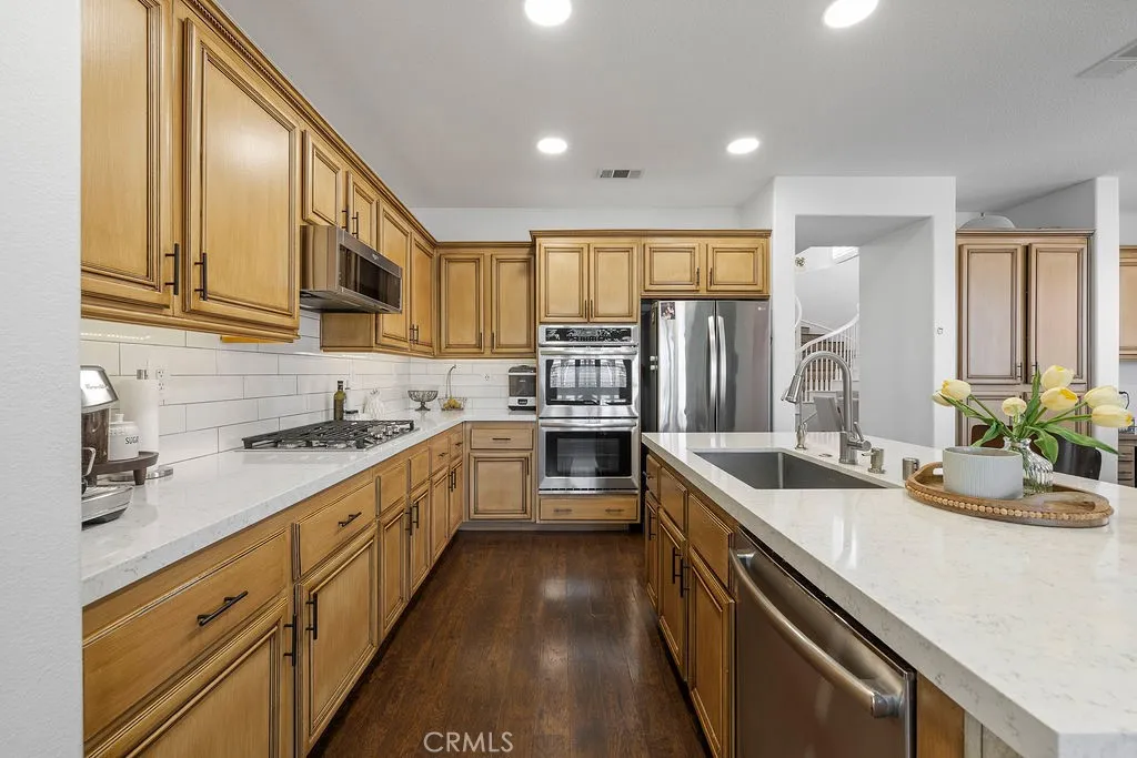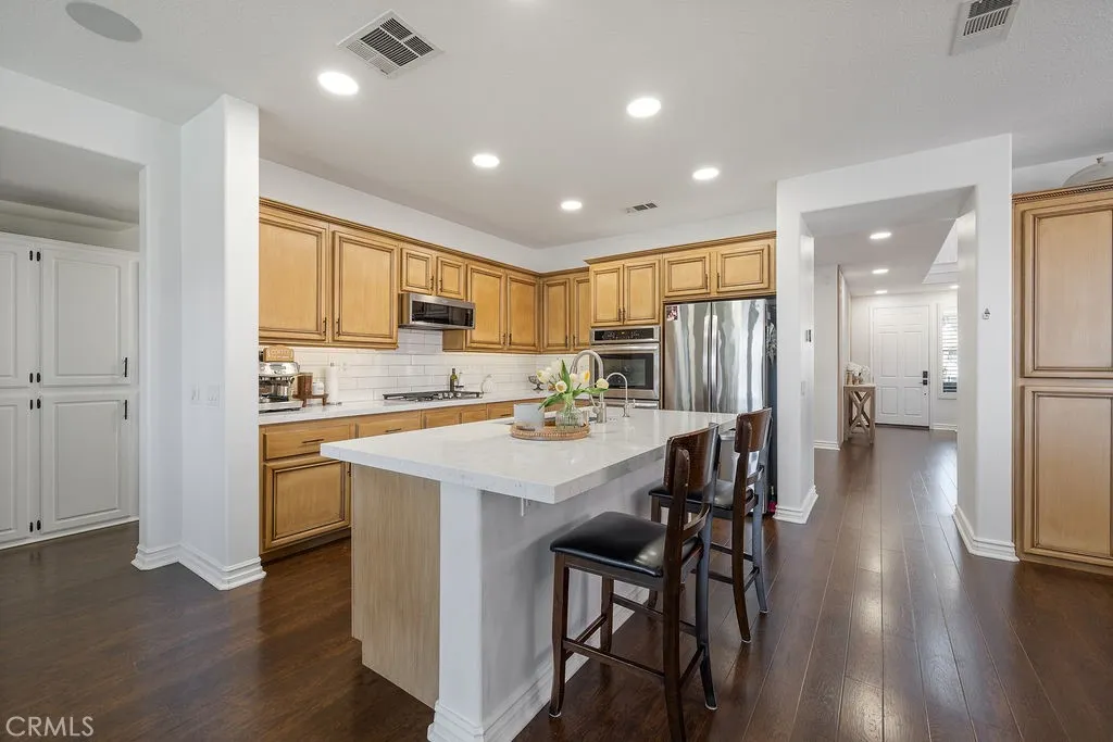 Own this spacious and beautifully maintained 5 bedroom, 3 bathroom home in a highly desirable Santa Clarita neighborhood with NO HOA and NO MELLO ROOS. Priced below market value this is your chance to purchase a home with built in equity. With approximately 2,800 sq. ft. of living space this home offers a well designed layout ideal for both everyday living and entertaining. Upon entering you are greeted by high ceilings and a stunning accent wall that sets the tone for the entire home. Just off the entryway is a custom built bar area perfect for relaxing or entertaining guests. The main level features a bedroom and full bathroom ideal for guests, in laws, or multigenerational living. The open concept kitchen offers a large center island making it a natural gathering spot for family and friends. The living room is equipped with built in ceiling speakers creating an immersive experience for movie nights or casual entertaining. Upstairs you will find a generously sized loft that is perfect for a secondary living area playroom or game room. The primary suite offers a large walk in closet with custom cabinetry, dual vanities, a soaking tub, and a separate shower. Three additional bedrooms a full bathroom with dual sinks and a private ensuite bathroom complete the upstairs making this home ideal for larger or extended families. The 3 car garage has been thoughtfully upgraded with epoxy flooring fresh paint built in cabinets and overhead storage racks providing ample space and organization. The backyard is designed for year round enjoyment featuring a covered patio built in grill