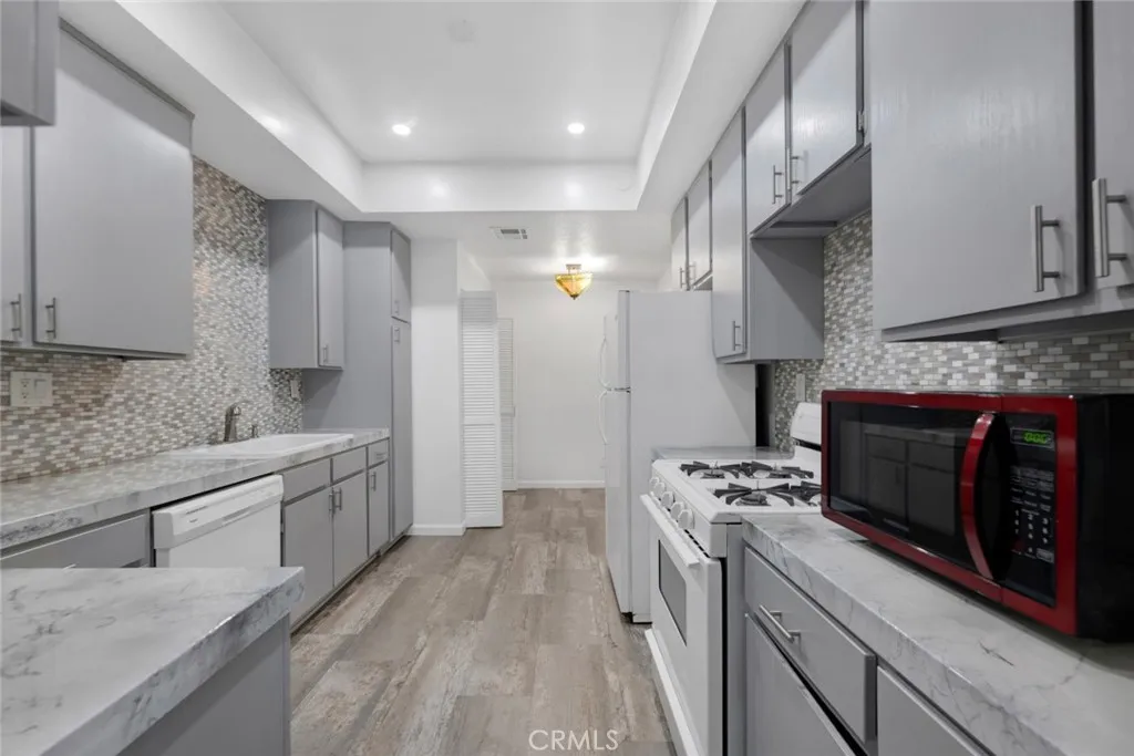 Modern style meets resort living in this chic 2-bedroom, 2-bath condo in prime Sherman Oaks. The spacious living room features plank flooring, a fireplace, wet bar, and dining area, all opening to a large balcony with peaceful tree views. The updated kitchen offers ample storage and a dedicated laundry area. The primary suite is a private escape with its own balcony, a walk-in closet, and a luxurious full bath with a soaking tub. Located in a beautifully maintained complex that feels like a luxury resort, you'll enjoy access to two sparkling pools, a fitness center, and a clubhousejust moments from shops, dining, and everything Sherman Oaks has to offer.
