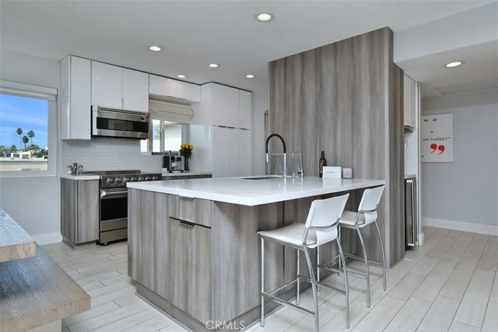 Located in the heart of Sherman Oaks, just one block from Ventura Boulevard, this stunning, modern, top floor condo offers a beautifully upgraded turnkey interior with sweeping views from every window. Tucked away at the back of a small, quiet complex, this smart home spares no expense in design or comfort. Refined with exceptional attention to detail, the open-concept floor plan features a spacious living and dining area adjacent to a chic gourmet kitchen. Highlights include quartz countertops, a glass subway tile backsplash, and premium appliances Viking stove and built-in microwave, Bosch dishwasher, and accent wood paneling. Custom all wood Schuler soft-close cabinetry and a large island with counter seating complete the space. The living room opens to an oversized balcony overlooking the Valley, ideal for relaxing or entertaining. Smart features abound, including recessed lighting on dimmers, a Control4 system with built-in speakers throughout and a Nest thermostat. The designer bathrooms feature imported Mexican concrete tiles, while the primary suite offers a luxurious retreat with dual sinks, a soaking tub beneath a statement light fixture, a heated towel rack, and a spacious walk-in shower. Built-in closets provide ample storage and style. Additional touches include a custom bar with Viking wine fridge, central HVAC, and durable high-end ceramic tile flooring throughout. Perfectly located near Sherman Oaks best restaurants, cafs, and boutiques, this sophisticated top-floor condo blends modern luxury with everyday convenience, a truly special place to call home.