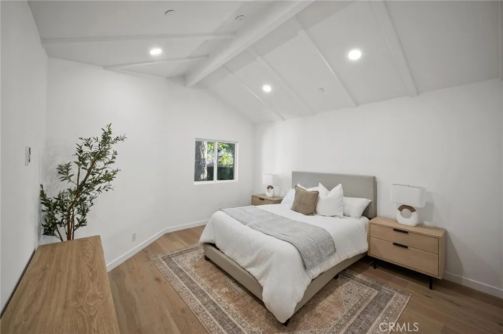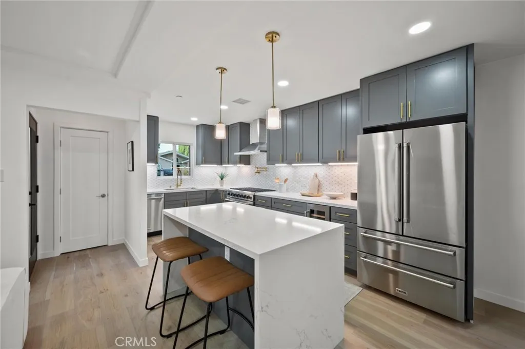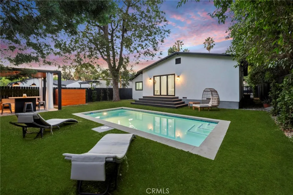 Tucked away on a lush, tree-filled lot, this modern retreat offers the perfect balance of privacy and resort-style living. A remote-controlled iron gate opens to reveal a beautifully reimagined 5-bedroom, 4-bathroom home showcasing timeless design and high-end upgrades throughout. Inside, the open-concept floor plan is anchored by White Oak hardwood floors and a sleek designer kitchen with quartz countertops, under-lit cabinetry, matching Thor appliances, and a built-in three-temperature wine refrigerator. The expansive primary suite overlooks the serene backyard and features a spacious walk-in closet along with a spa-inspired ensuite highlighted by dual sinks and a curb-less, zero-entry shower. Three additional designer bathrooms echo the same attention to detail with walk-in showers and luxury finishes. Step outside to your private paradise: a brand-new sparkling pool shaded by mature trees and complemented by a resort-style cabana. Designed for entertaining, the cabana is complete with an outdoor kitchen, built-in Spires BBQ, dual-temperature wine fridge, mounted TV, overhead lighting, and a cozy fire pit. Recent upgrades provide peace of mind, including a new roof, HVAC system, water heater, all-new copper and PEX plumbing, smooth stucco exterior, stamped concrete driveway, and low-maintenance synthetic turf in both the front and back yards. A rare blend of sophistication, comfort, and modern California living, this home is a true retreat designed for both relaxation and entertaining.