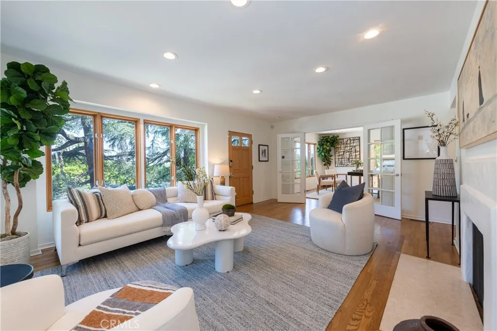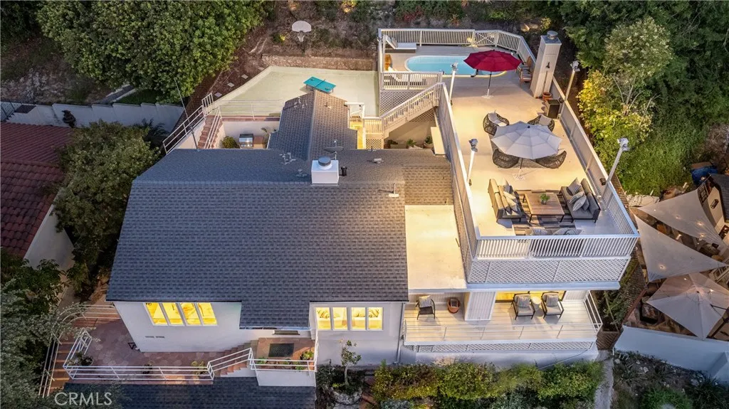 Set on a quiet, sought-after street south of the Boulevard in Sherman Oaks, this elevated hillside residence offers exceptional privacy, treetop views, and a serene retreat-like setting. Designed for entertaining, the property features multiple outdoor spaces, including patios, a sports court, a gazebo, and an expansive approximately 900-square-foot deck with pool, spa, lounge areas, and sweeping mountain and valley views. The home flows seamlessly indoors to multiple inviting living spaces, including a family room with exposed wood beams and a fireplace, a living room with another fireplace ideal for intimate gatherings, and enjoying the tree-top views. The updated kitchen features porcelain tile flooring, refreshed countertops, and premium stainless-steel appliances by Wolf, Dacor, and Bosch, with a breakfast nook and bar seating opening to outdoor dining terraces. The primary suite offers a private sanctuary with a sitting area, balcony, and renovated spa-style bath. Two additional bedrooms provide flexibility, including one with patio access and one currently used as an office. Located within the Sherman Oaks Charter Elementary School District and near scenic hiking trails, this home delivers a peaceful hillside escape with convenient access to the Westside and Ventura Boulevard.