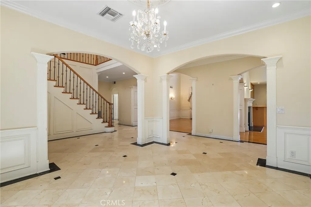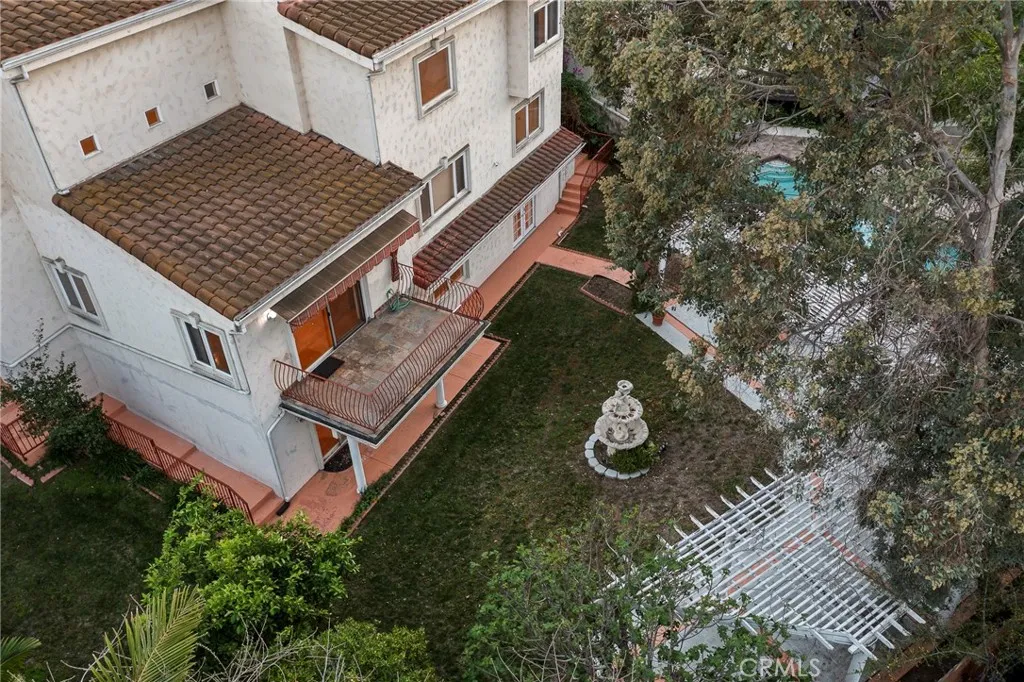 Gated Mediterranean estate home in coveted Sherman Oaks offers a grand entry with wrought iron staircase opening to a spacious, light-filled 5-bedroom, 4.5-bathroom living space with approximately 4,847 sq ft, soaring ceilings, and a versatile layout designed for both everyday living and entertaining. The large dining room and living room with fireplace flow seamlessly into a family room with a bar, fireplace, and balcony with retractable awning. The spacious kitchen with sitting area and center island provides a professional line of stainless-steel appliances, as well as ample cabinetry and workspace. Home offers a private level with separate entrances, complete with a guest room with full bathroom and walk-in closet, as well as two additional large bonus rooms, ideal for a media room, home studio, gym, or game room. Main level offers a sizeable bedroom with a full, private en-suite bathroom and walk-in closet. Upstairs features an open library, well-sized secondary bedrooms with walk-in closets outfitted with built-in shelving and cabinetry, and Jack-and-Jill bathroom. The oversized primary suite provides a private retreat with sitting area, vaulted ceilings, fireplace, dual walk-in closets, and a luxurious spa-style bathroom featuring dual sinks and steam shower. The resort-like backyard with covered terrace area designed for large-scale entertaining, grassy yard, and room for a pool is surrounded by lush and mature fruit trees providing privacy and prestige. Built with solid structure in a prestigious neighborhood, this home presents a fantastic opportunity for buyers t